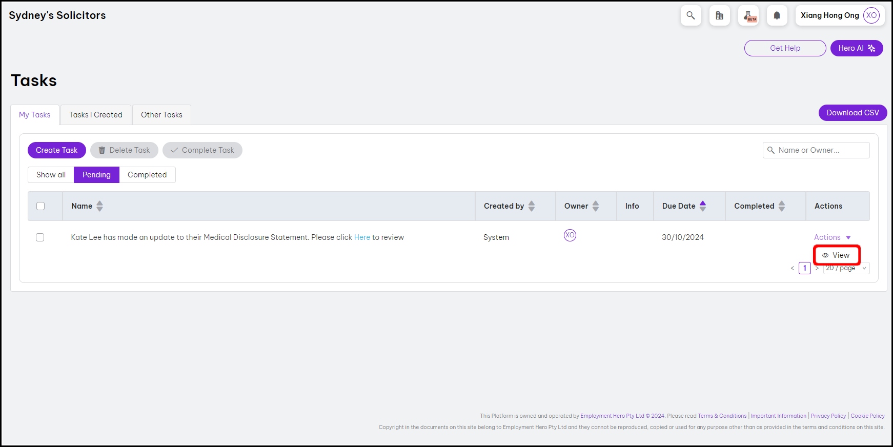 - Click the Actions dropdown button for the medical disclosure task generated by Employment Hero.