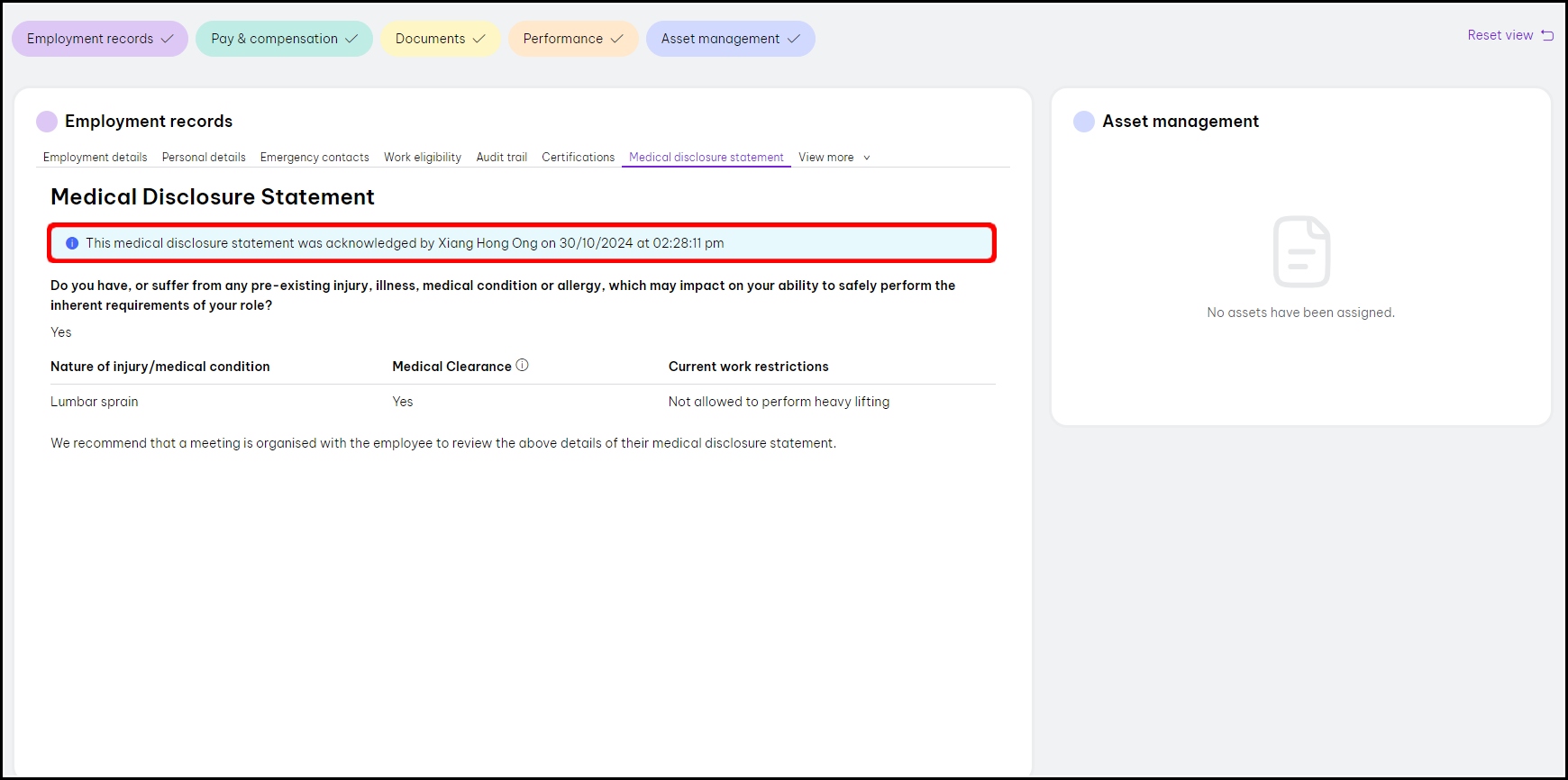 You will now see the acknowledgement banner on the medical disclosure page, showing who acknowledged these details and when.