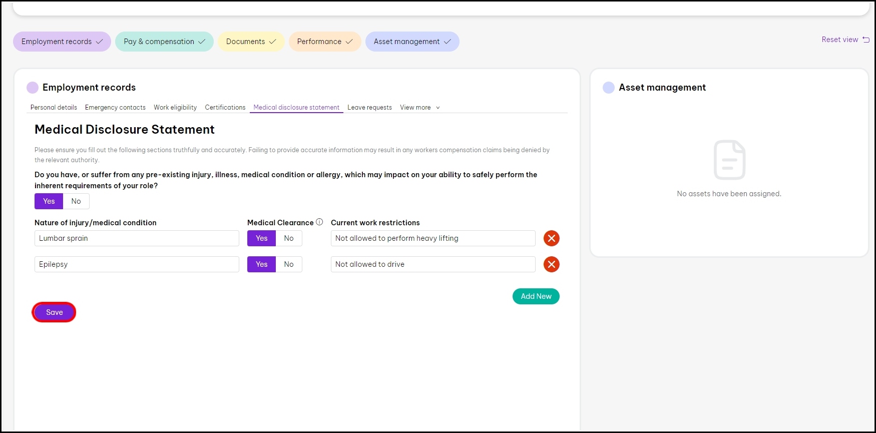 You will now be taken to the Medical Disclosure Statement screen on the employee file page.