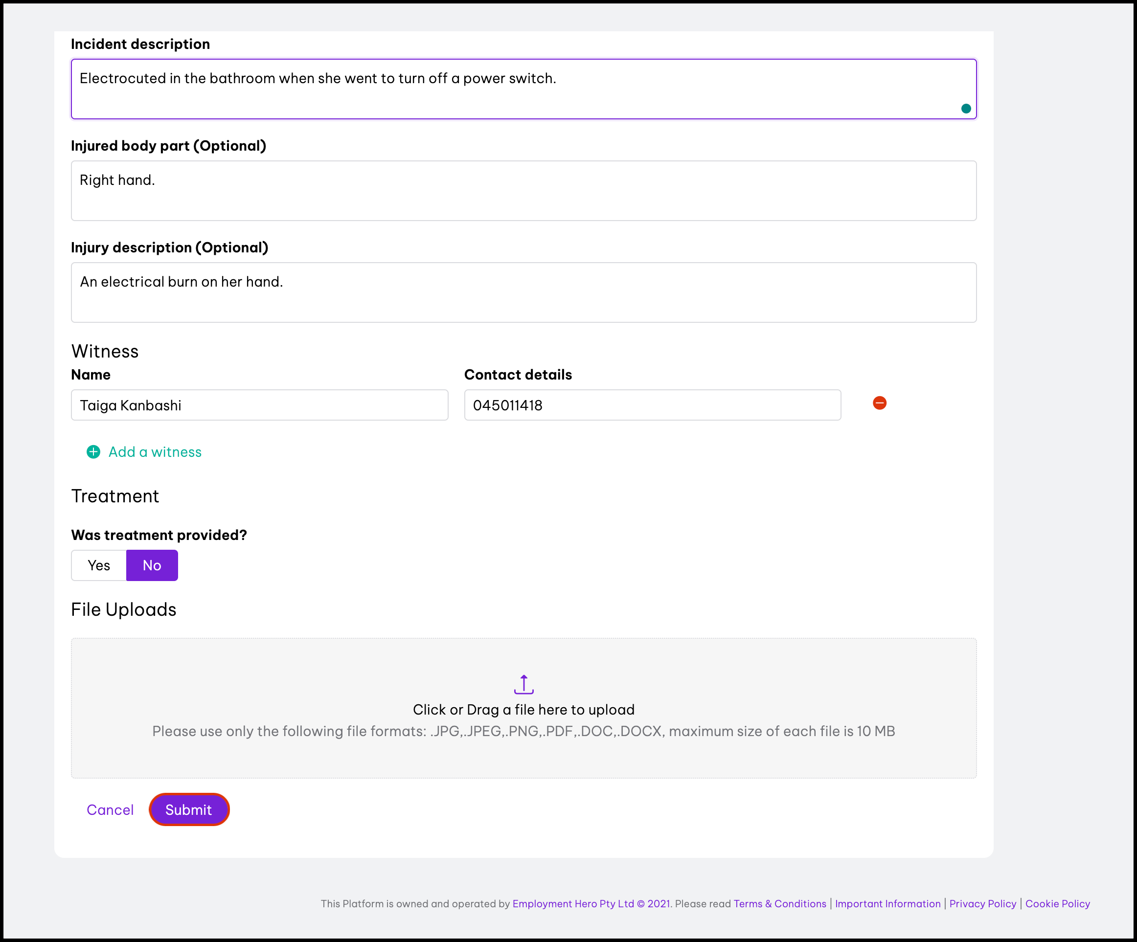 Kaimahi submits an incident. Once submitted, they can edit or delete it until it is closed by an admin/Safety admin.