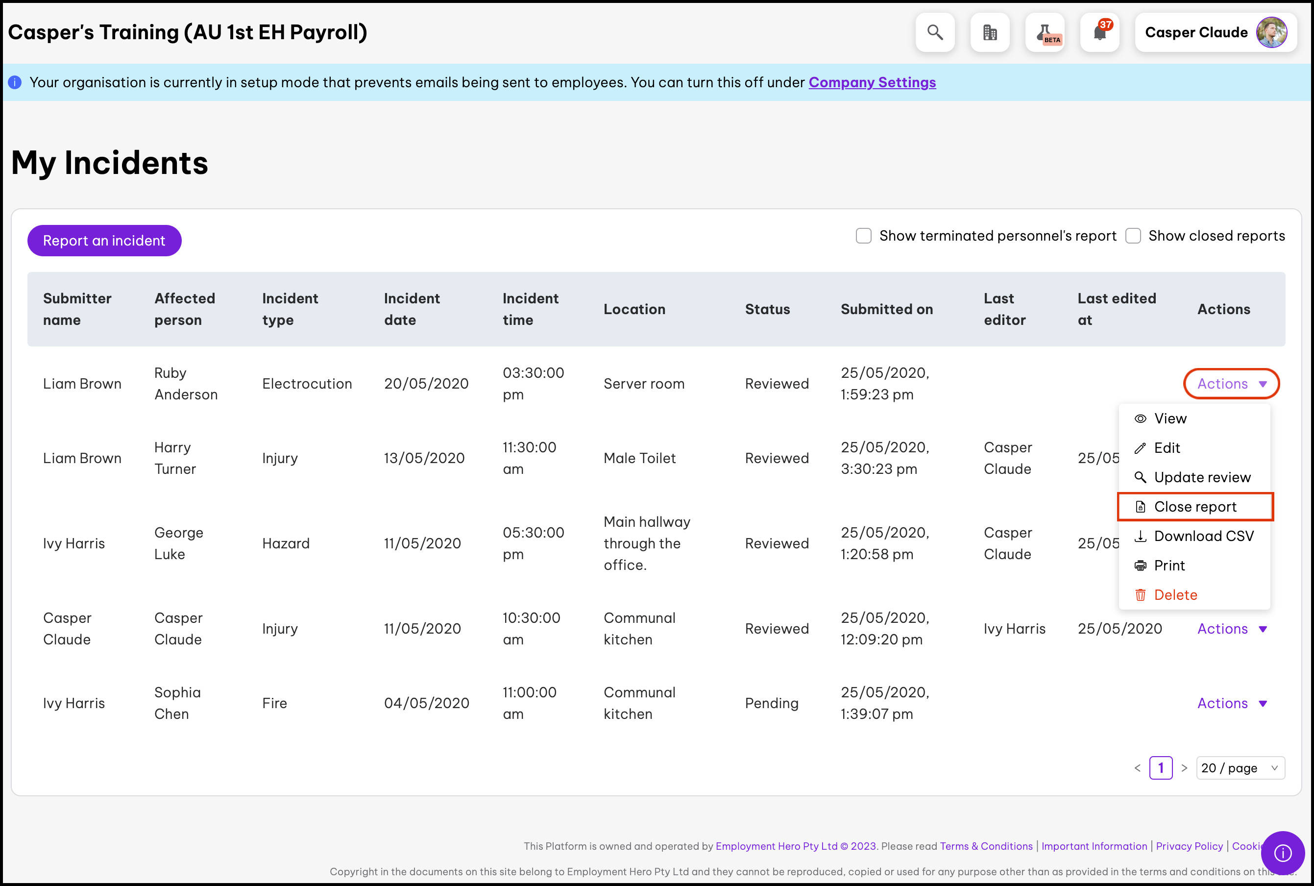 Only Admins, Owners and/or employees listed as a health and safety contact can manage the My Incidents module in full. Employees who meet any of the following criteria can view and delete reports within the My Incidents module: