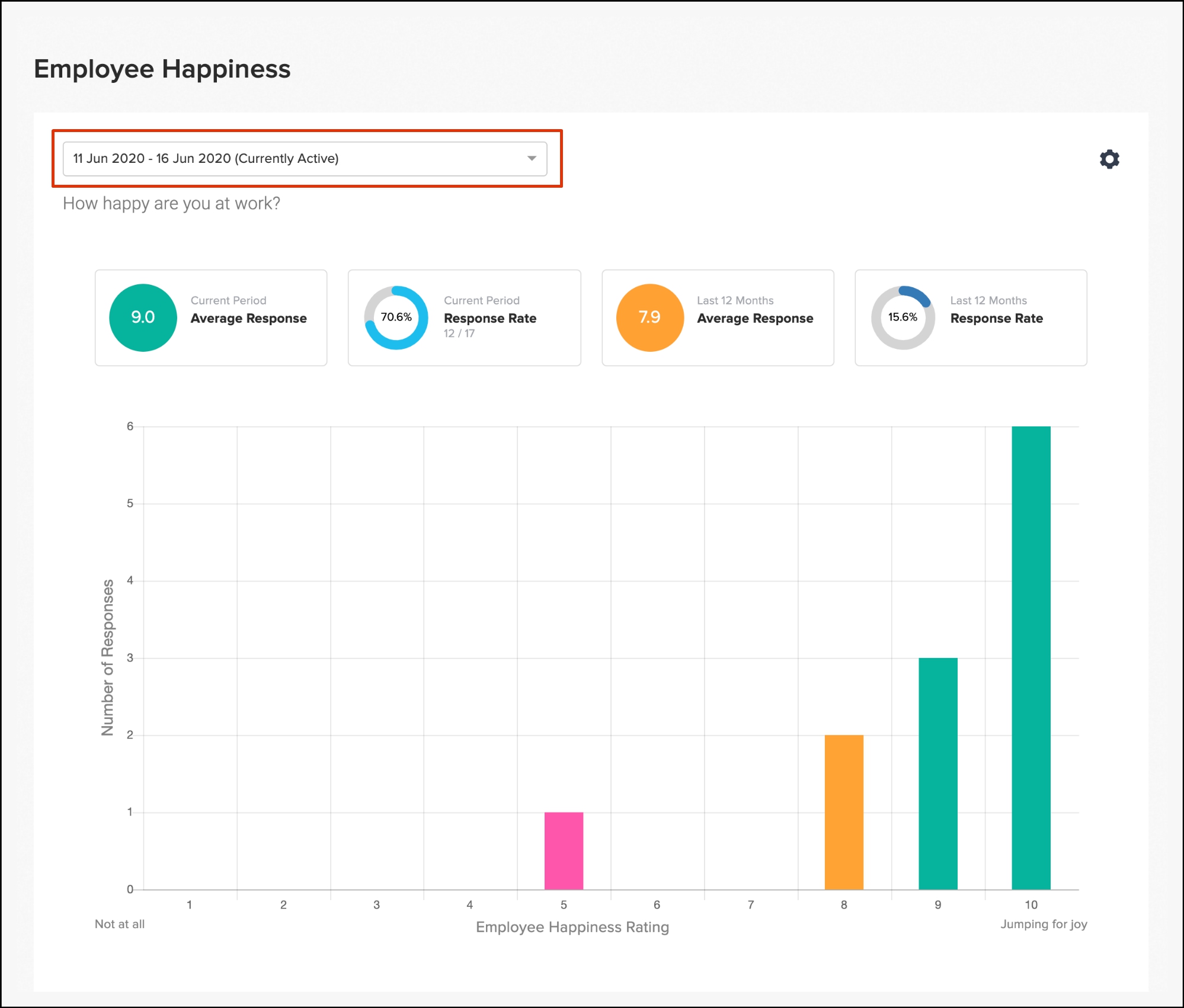 | Current period: Average Response. | This metric will display the average happiness score for the chosen survey period. |