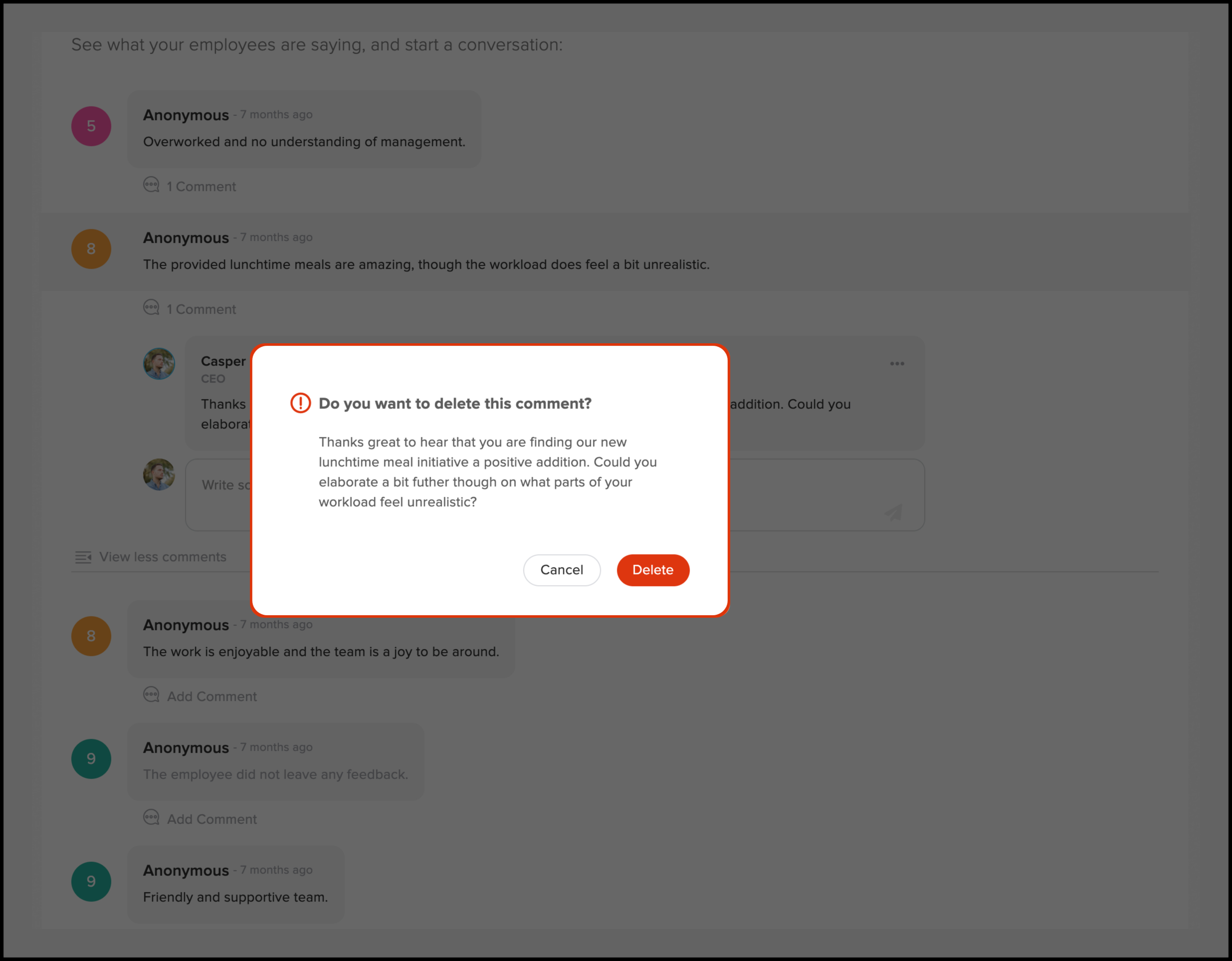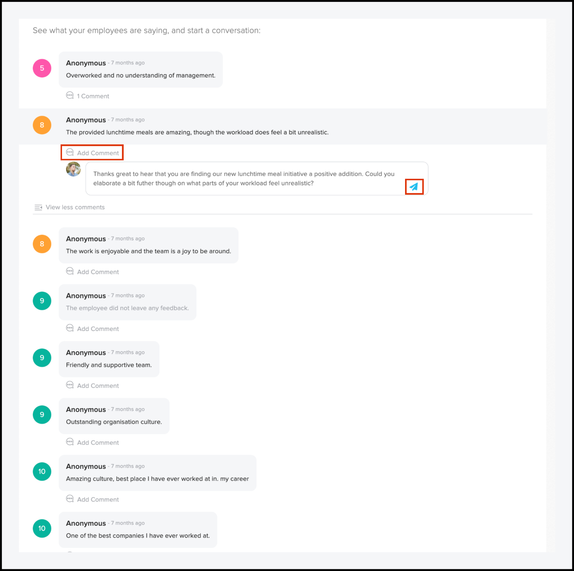 The ability to add a comment to an anonymous response is only available on our platinum pricing tier. You can comment on an employee survey even if they have not provided a comment and have only offered a happiness score.