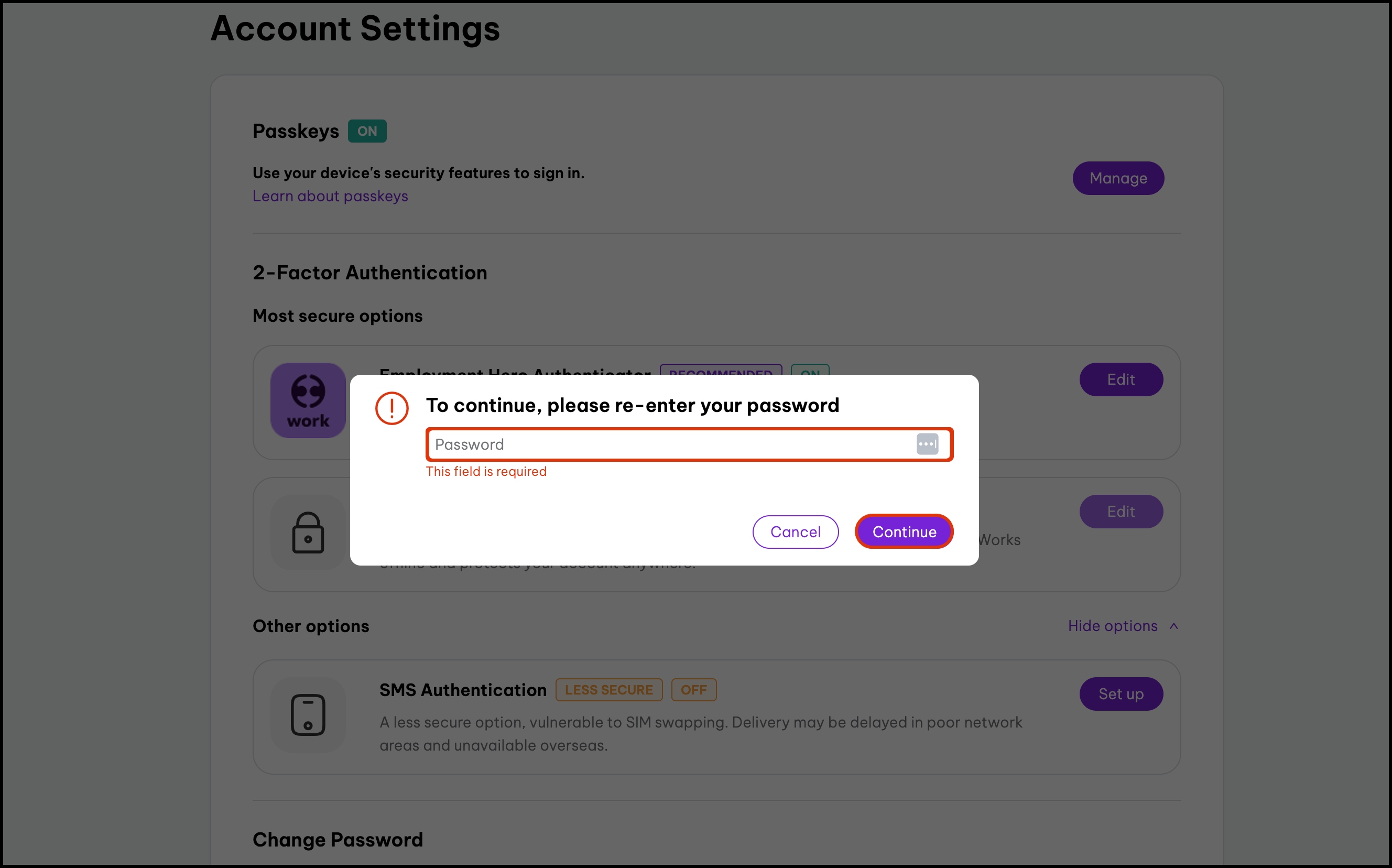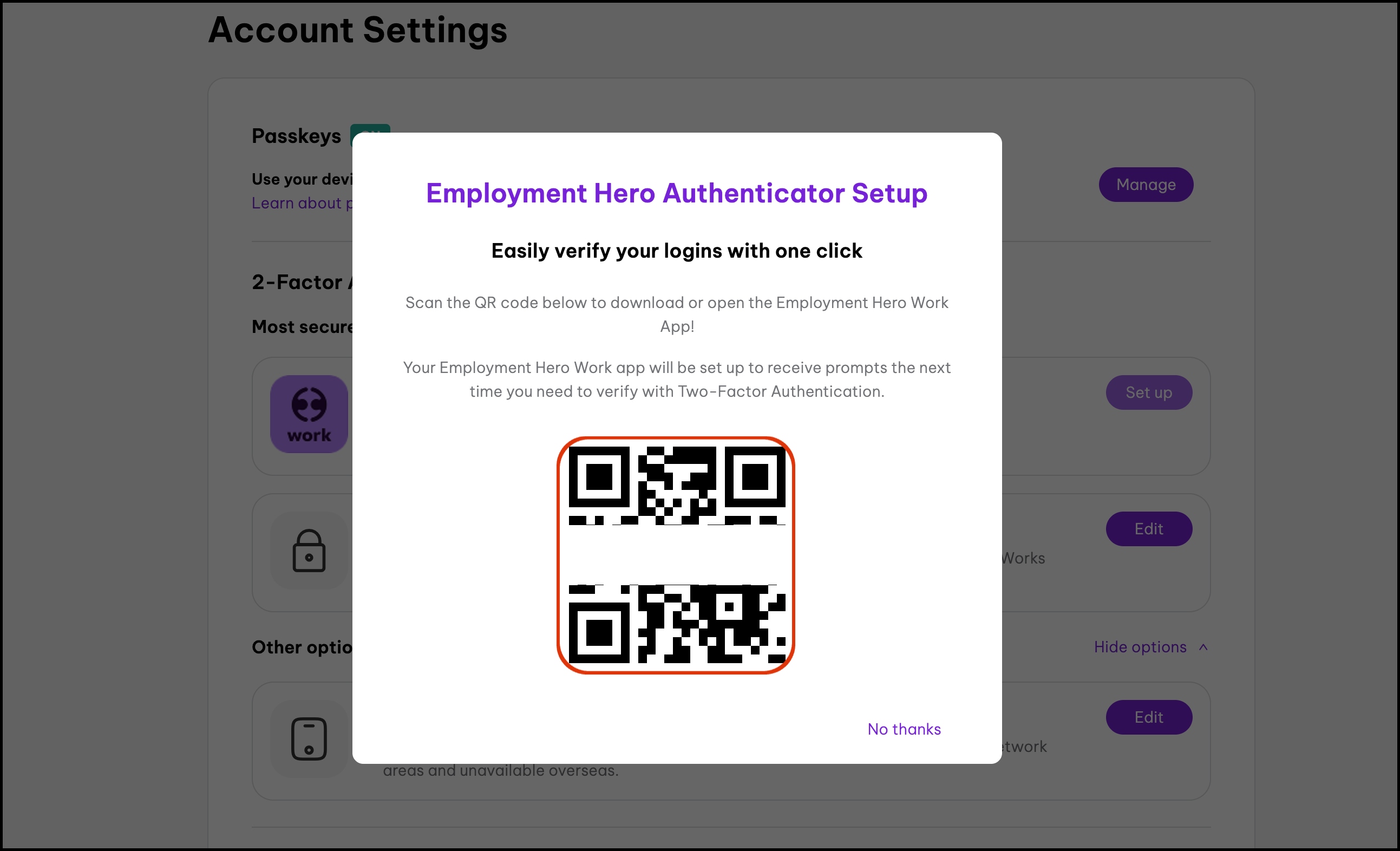 Employment Hero uses 2FA to help keep your account secure. This article explains how to set up 2FA using an authenticator app or an SMS authentication method to receive the required passcode. For more details on enabling 2FA for your employees or organisation, refer to this article.