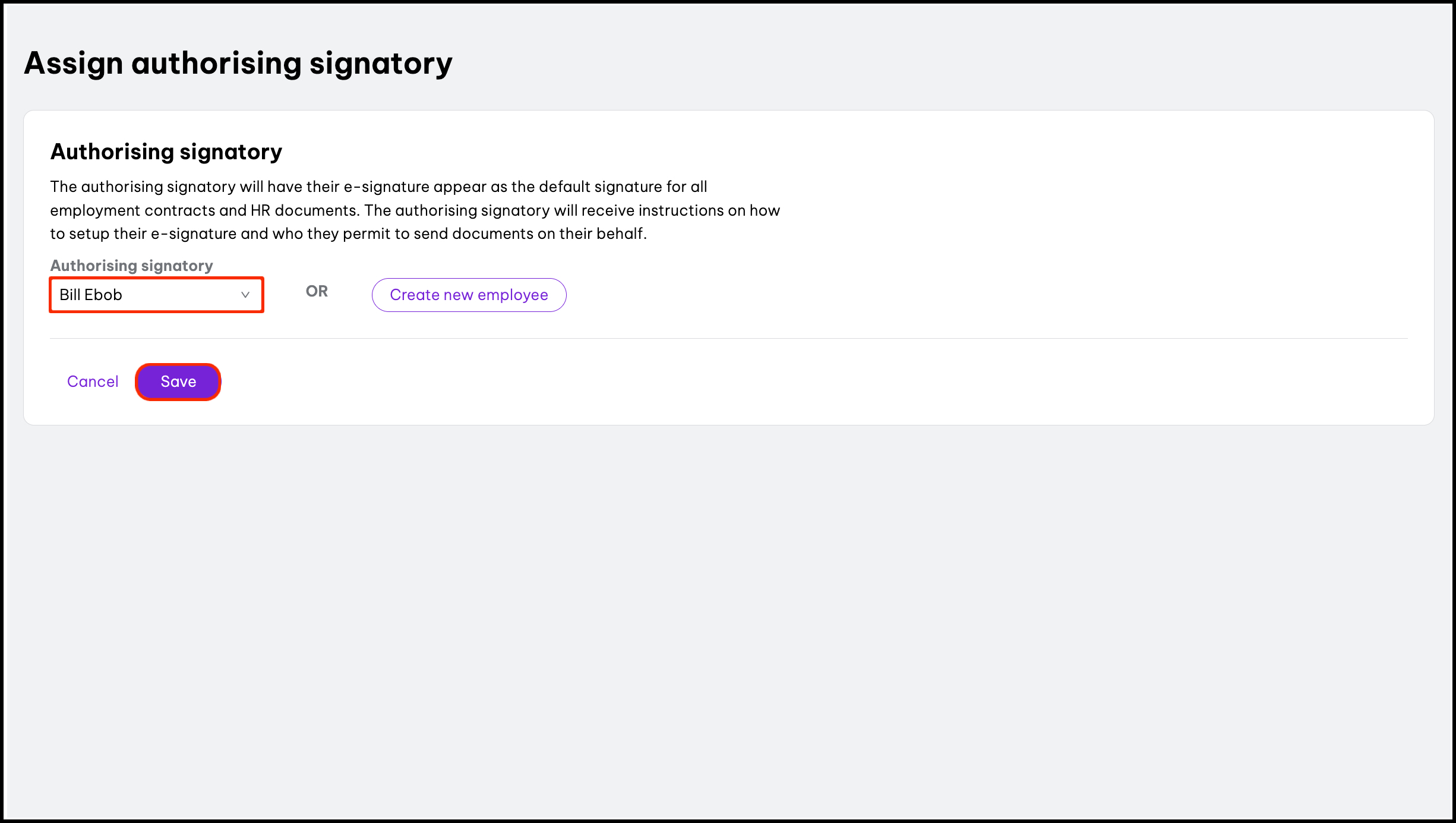 - Select an employee from the Authorising Signatory field.