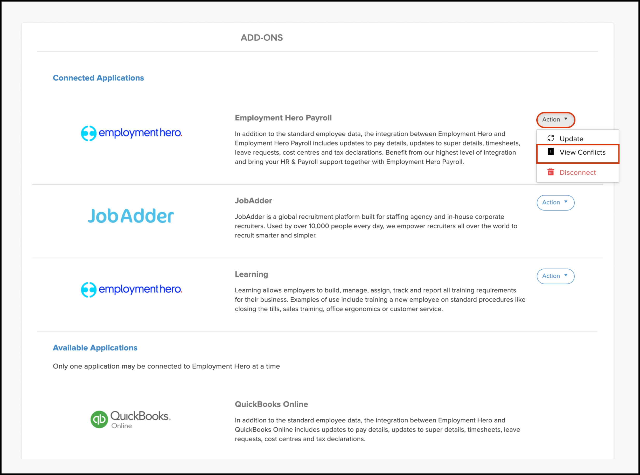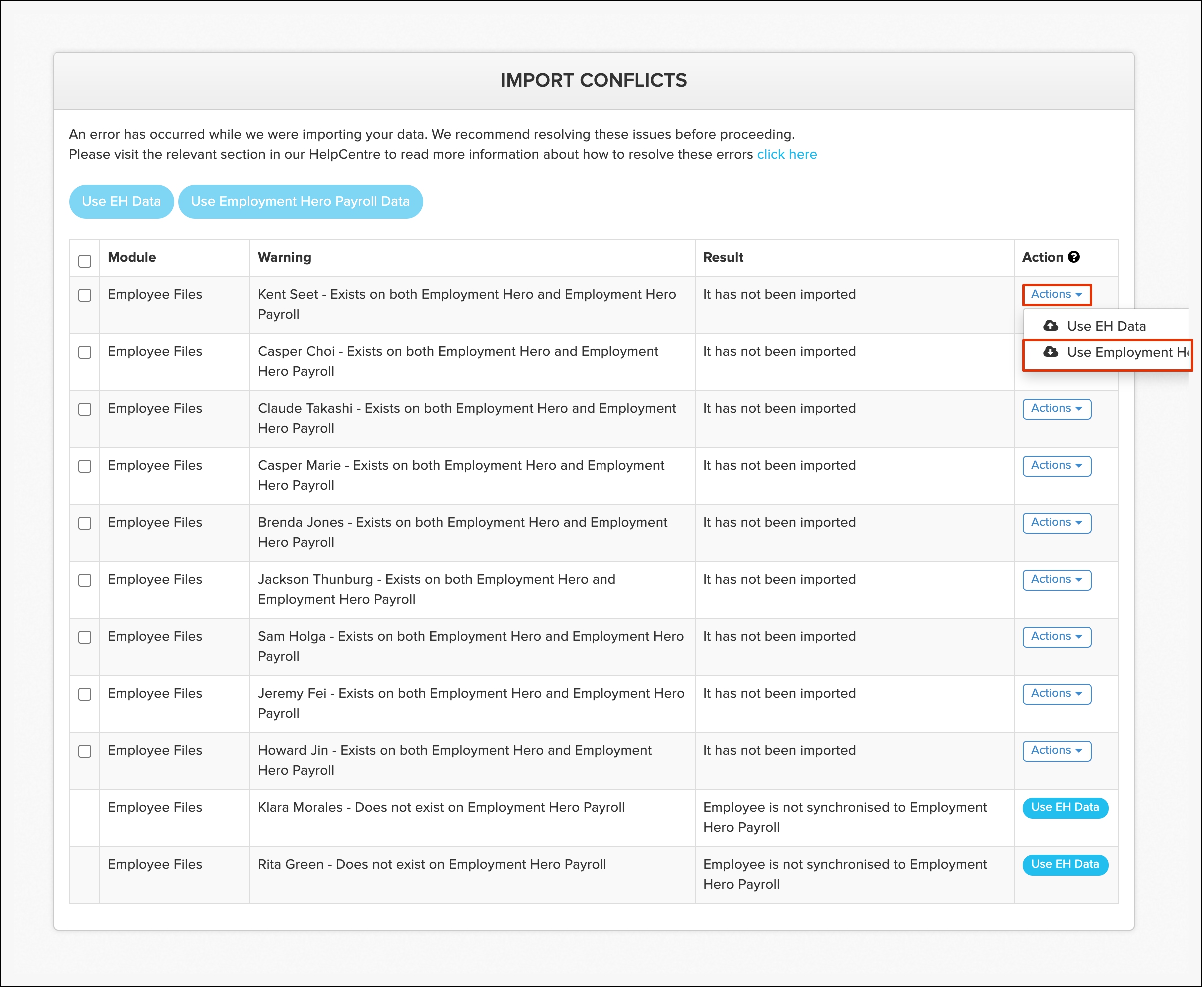 | Import conflict. | Employee File. | Employee exists on both Employment Hero HR and Employment Hero payroll classic. |