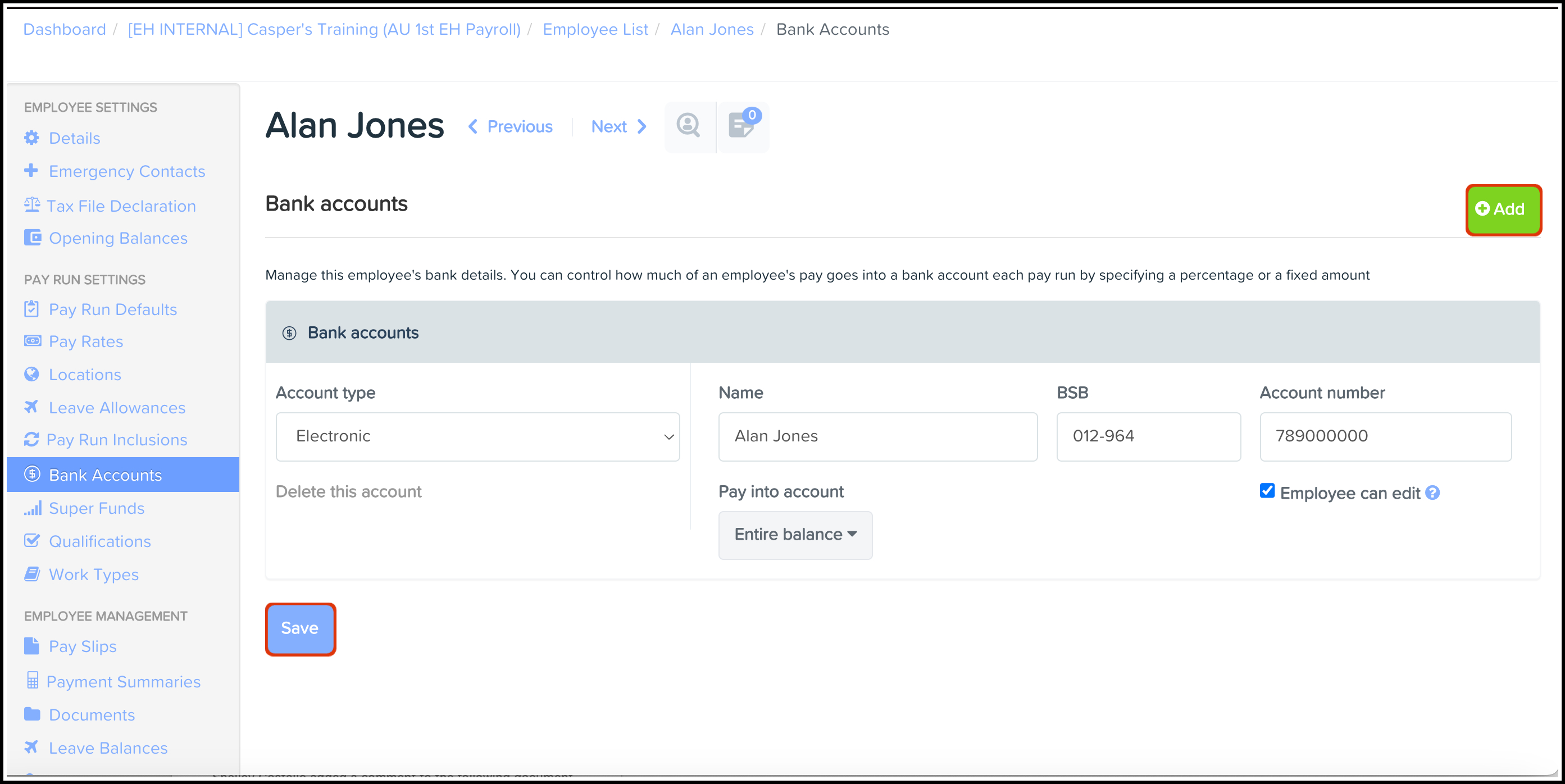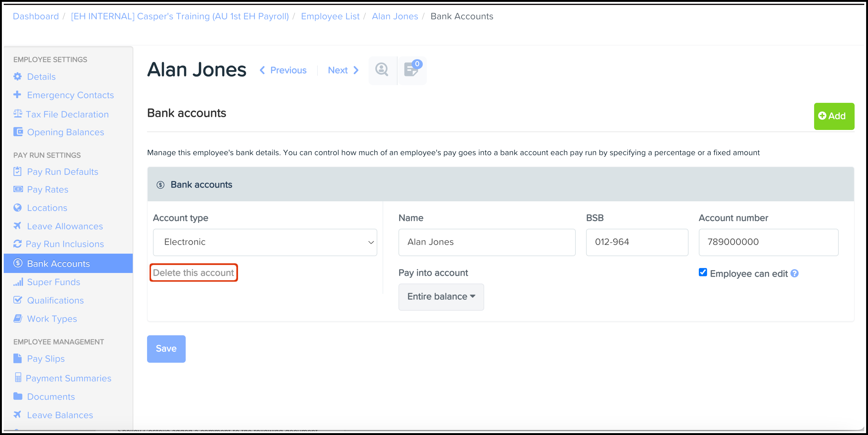 There may be examples where an employee's banking details may change, such as moving to a new bank or merging your bank accounts into one account. In these cases you can use the Banking Details feature to update these details if they change. Employment Hero will reflect the changes you made in your personal file throughout the entire Employment Hero platform.