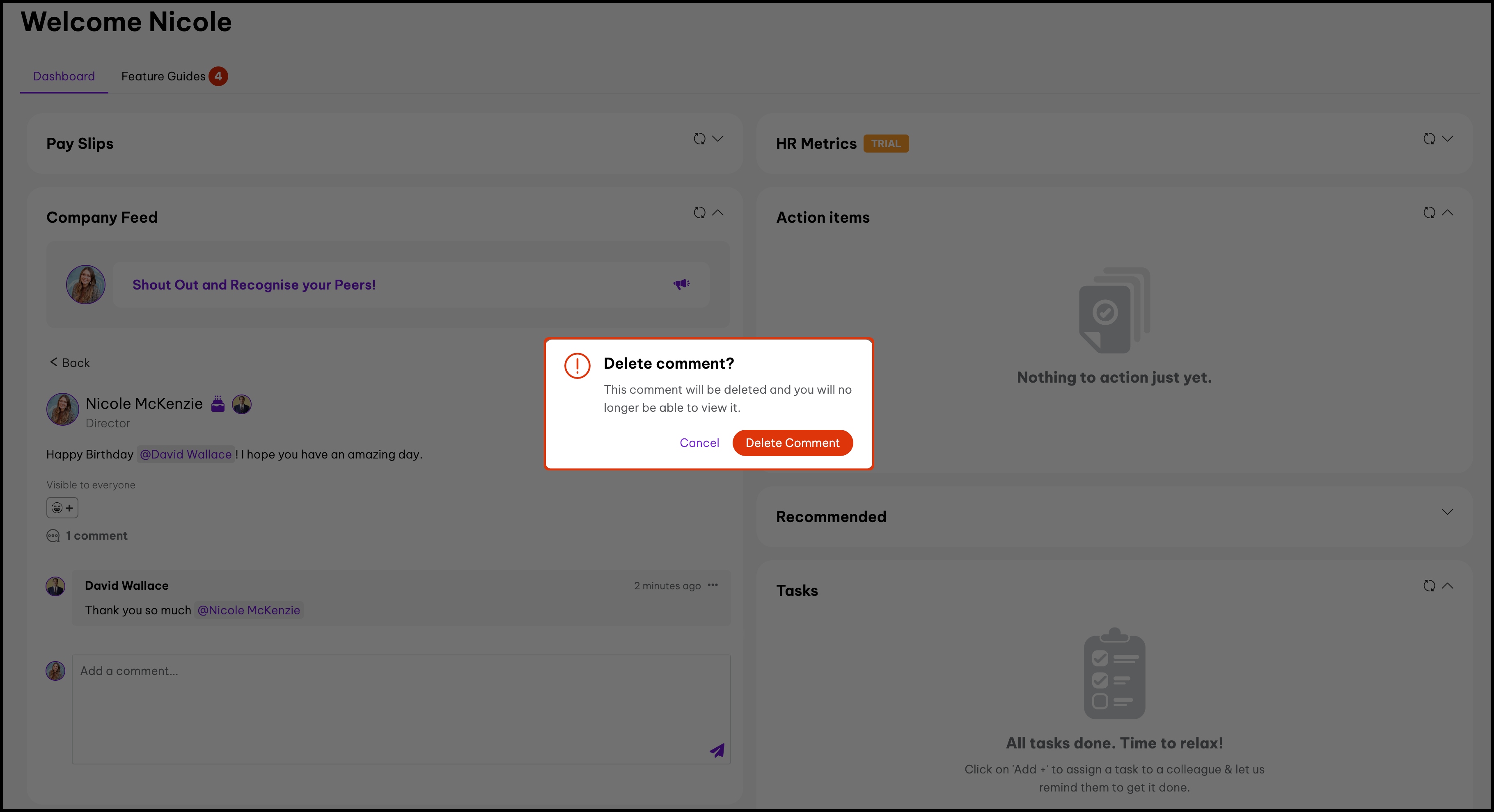 Your coworkers may go above and beyond to support you, whether by assisting with challenging customer calls or staying late to help you meet deadlines. The Recognition feature on the company feed lets you show appreciation by posting a public message highlighting a coworker who embodies your organisation’s values. You can also comment on or delete a recognition post if needed. Before being able to use the recognition feature, you will need to have: