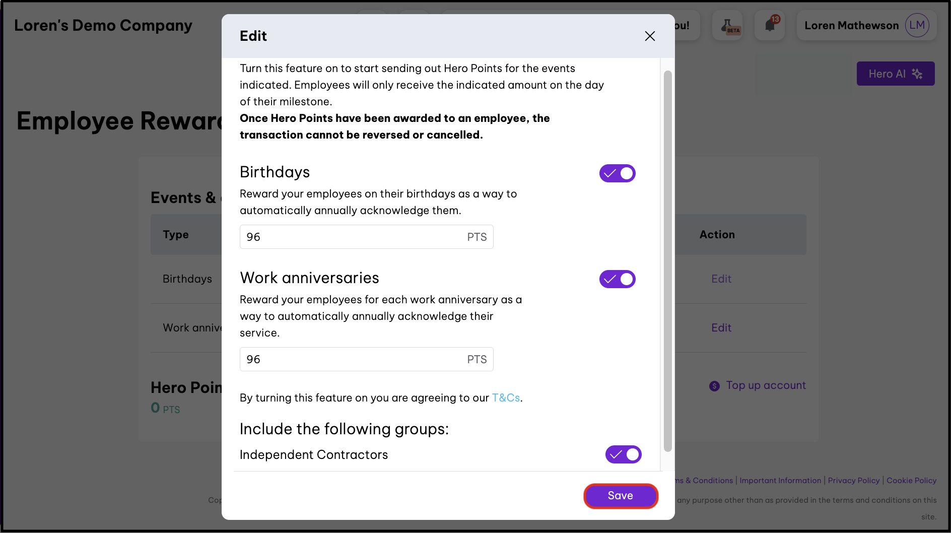 How do I enable rewards for birthday and work anniversary milestones?