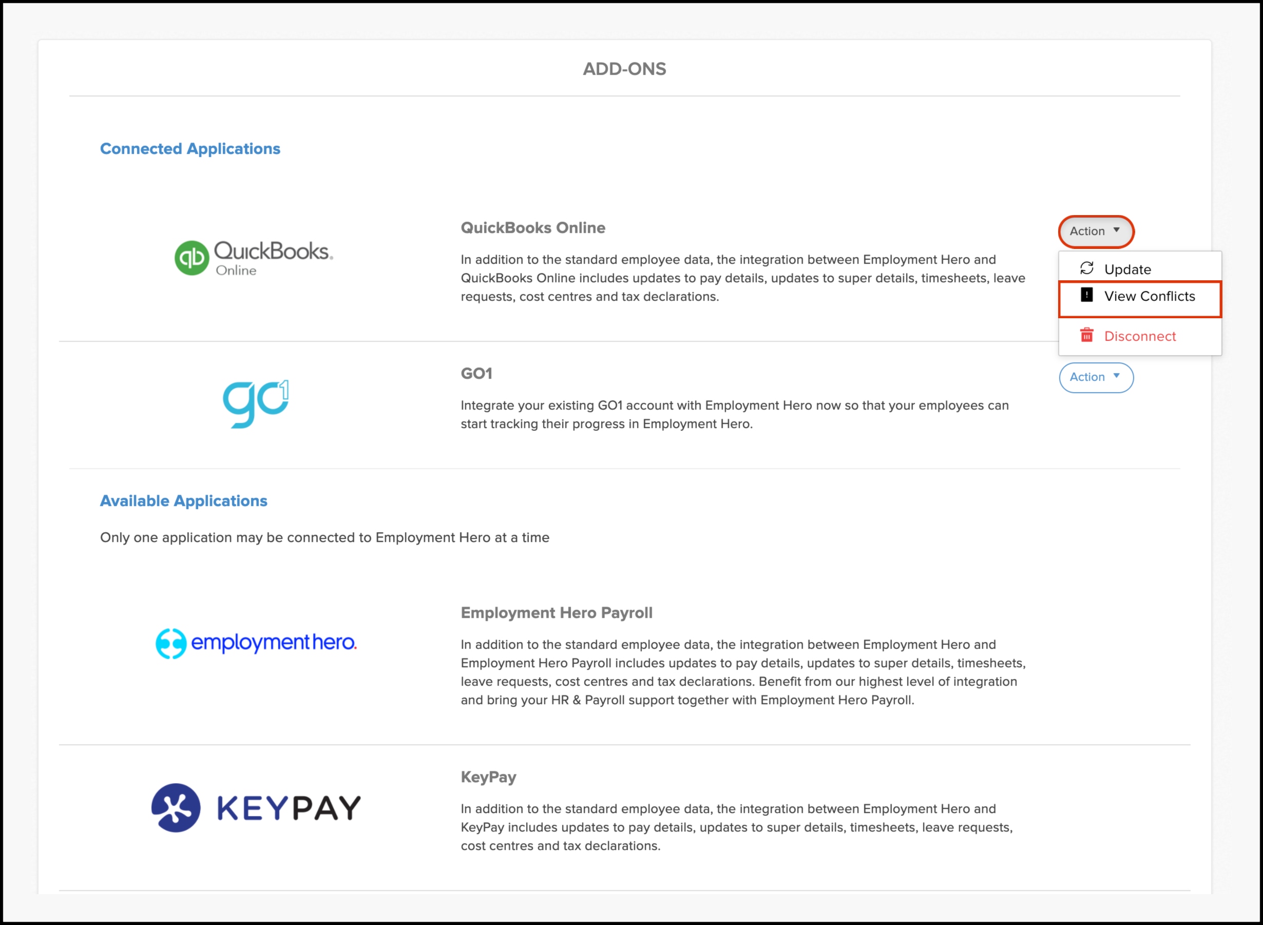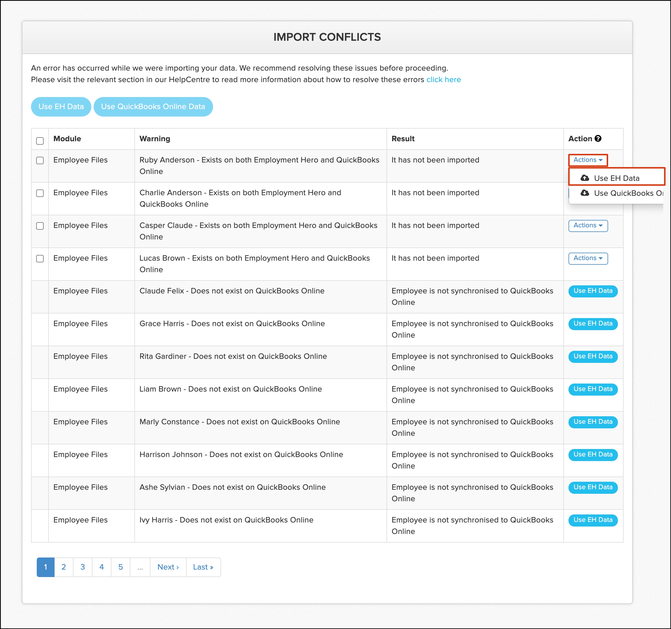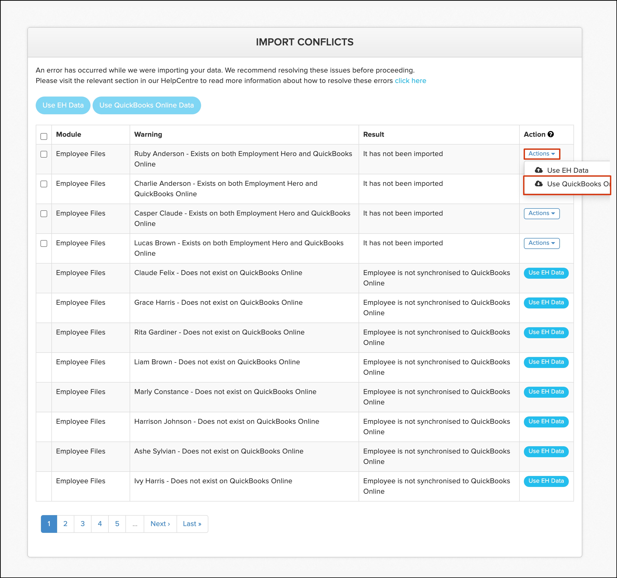 | Import conflict | Employee File | Employee exists on both Employment Hero and QuickBooks Online |