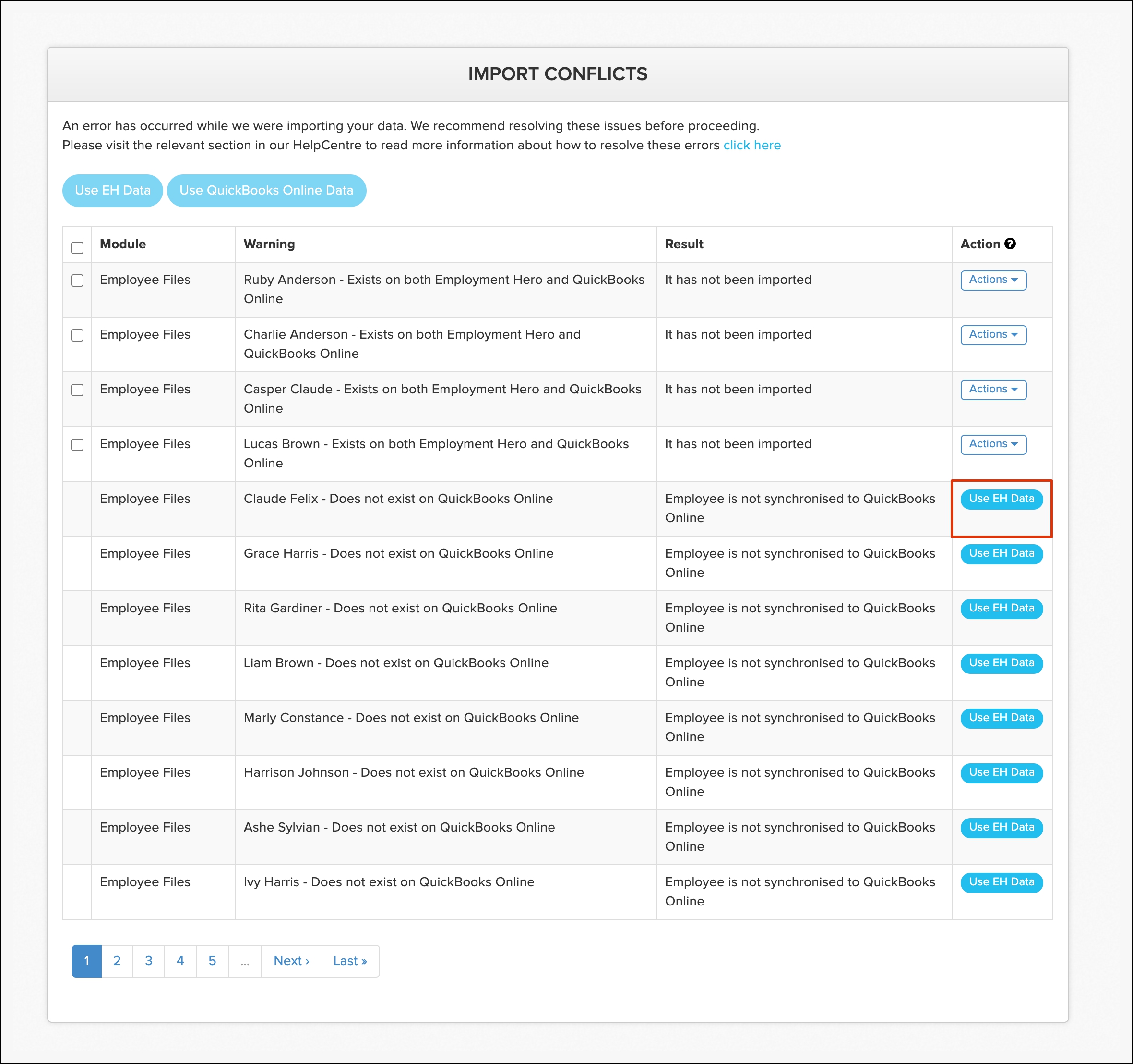 | Import conflict | Employee file | Employee file does not exist on QuickBooks Online |