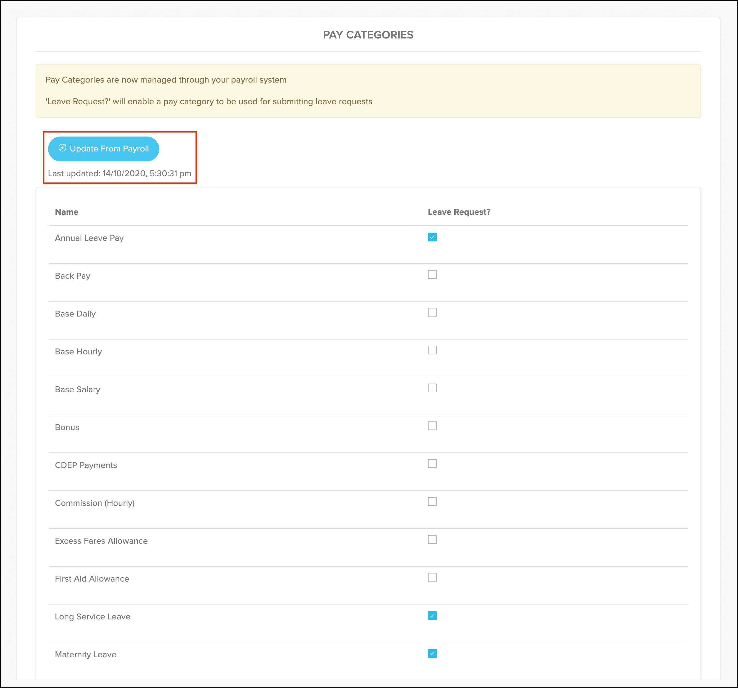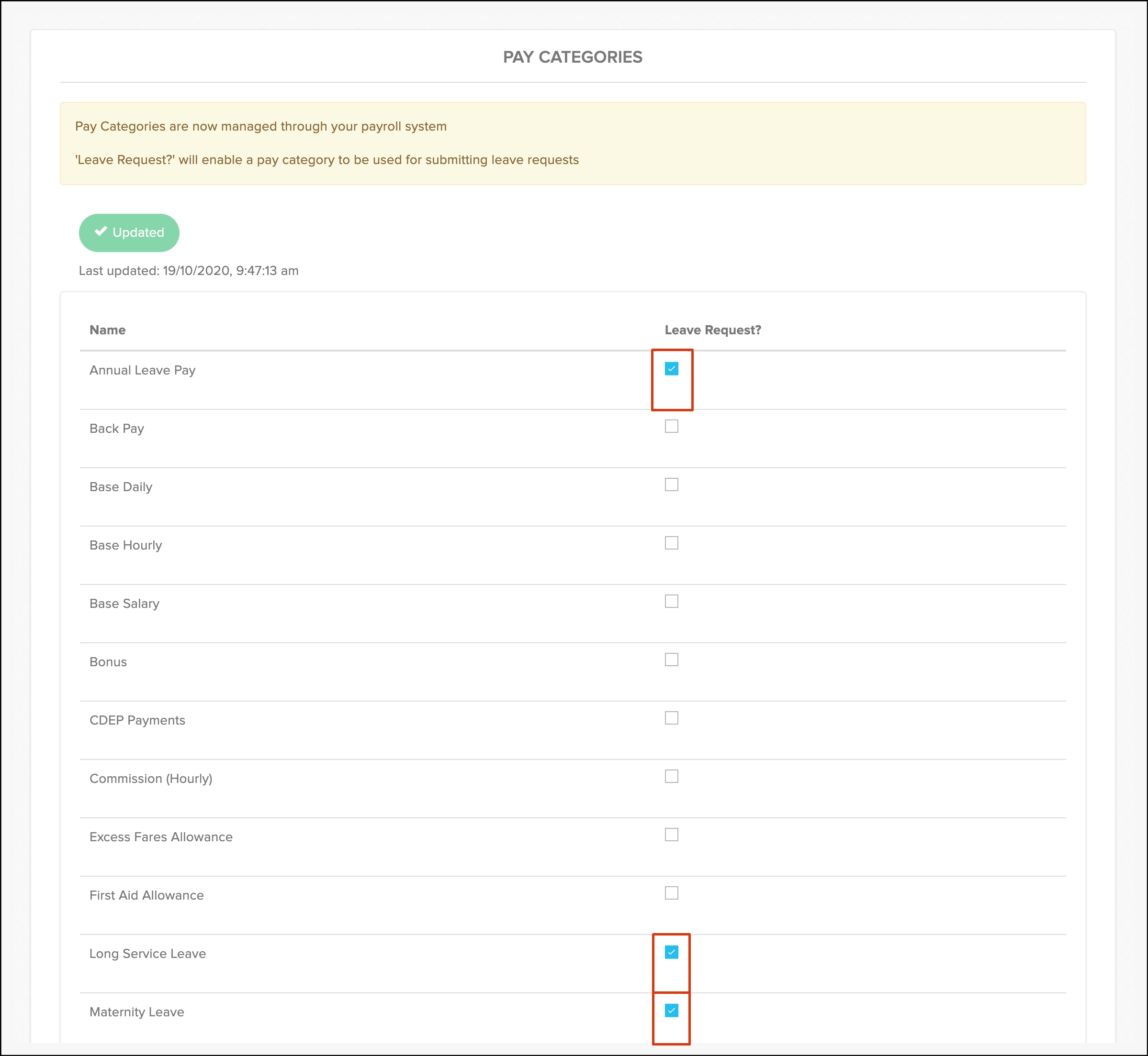 - Click the Leave Request tick box next to each pay category that you want to use as a leave submission category.