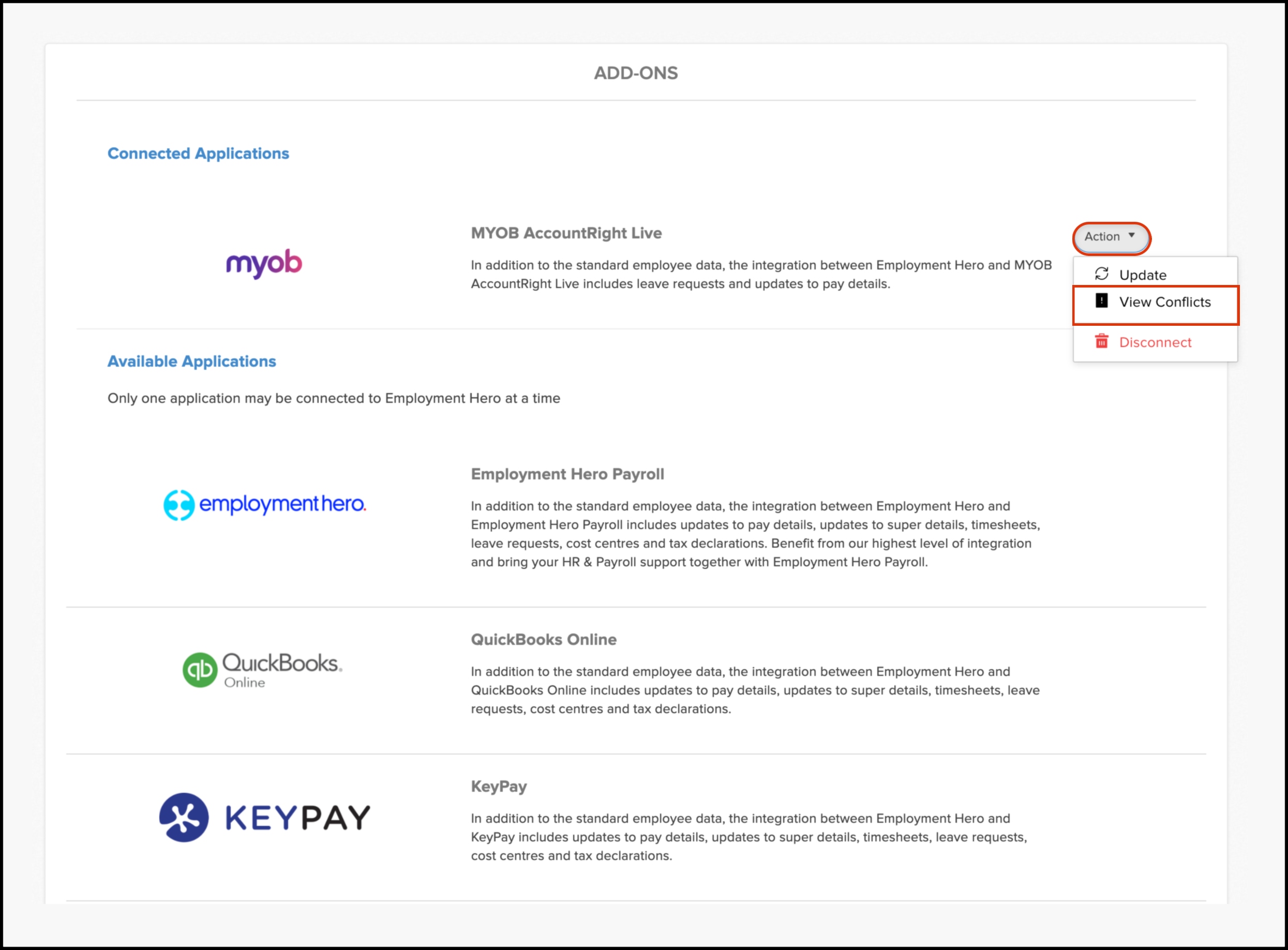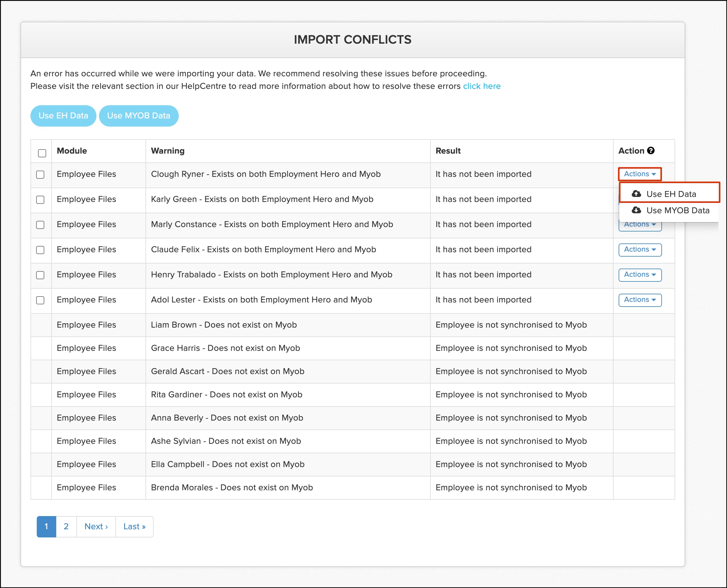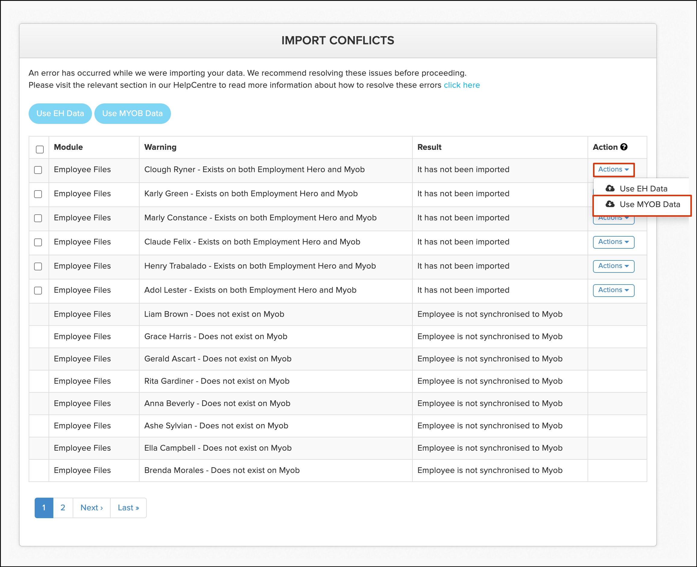 | Import conflict | Employee file | Employee exists on both Employment Hero and MYOB. |