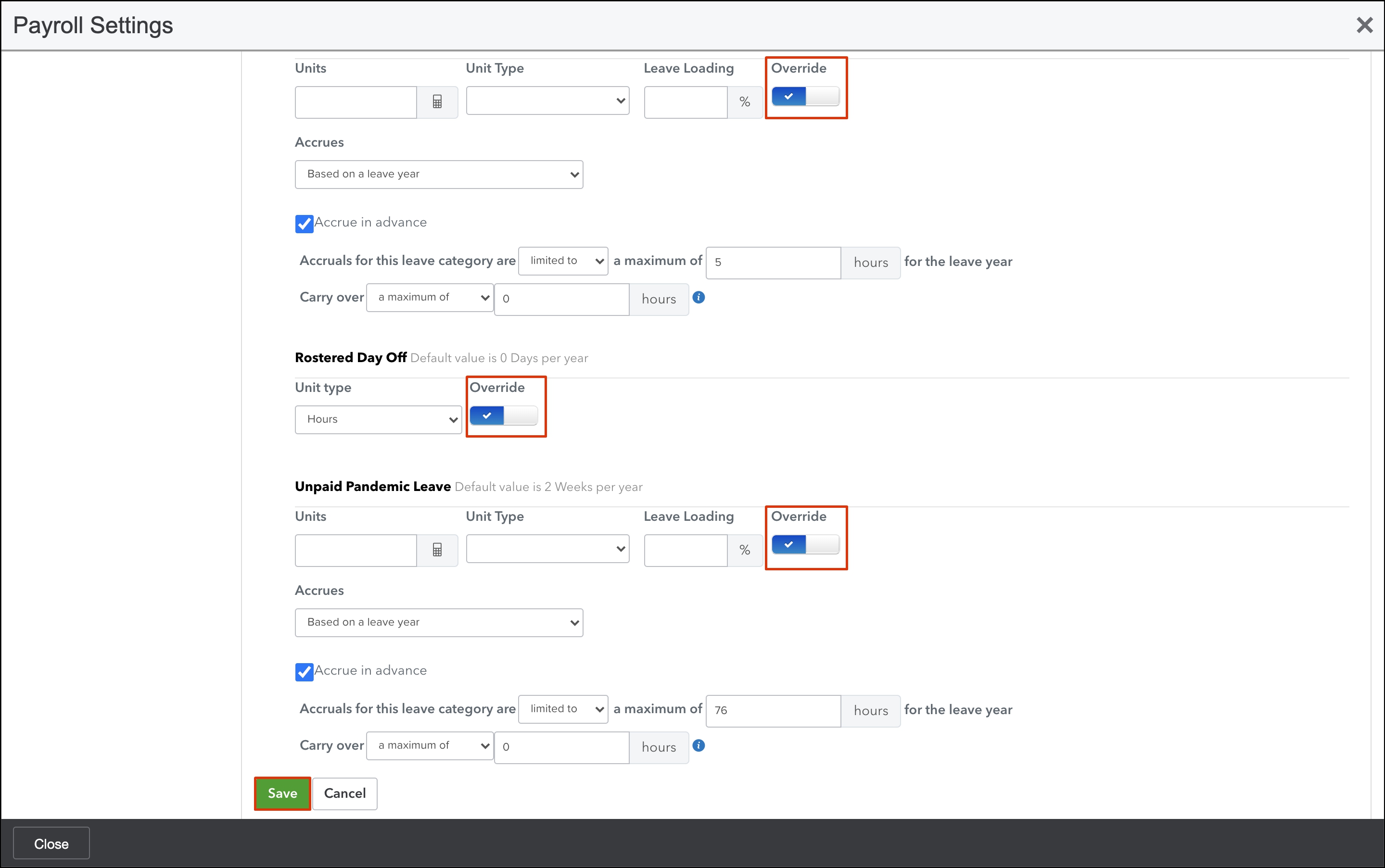 - In the Leave Allowance section, use the override toggle switch to change the data if required.