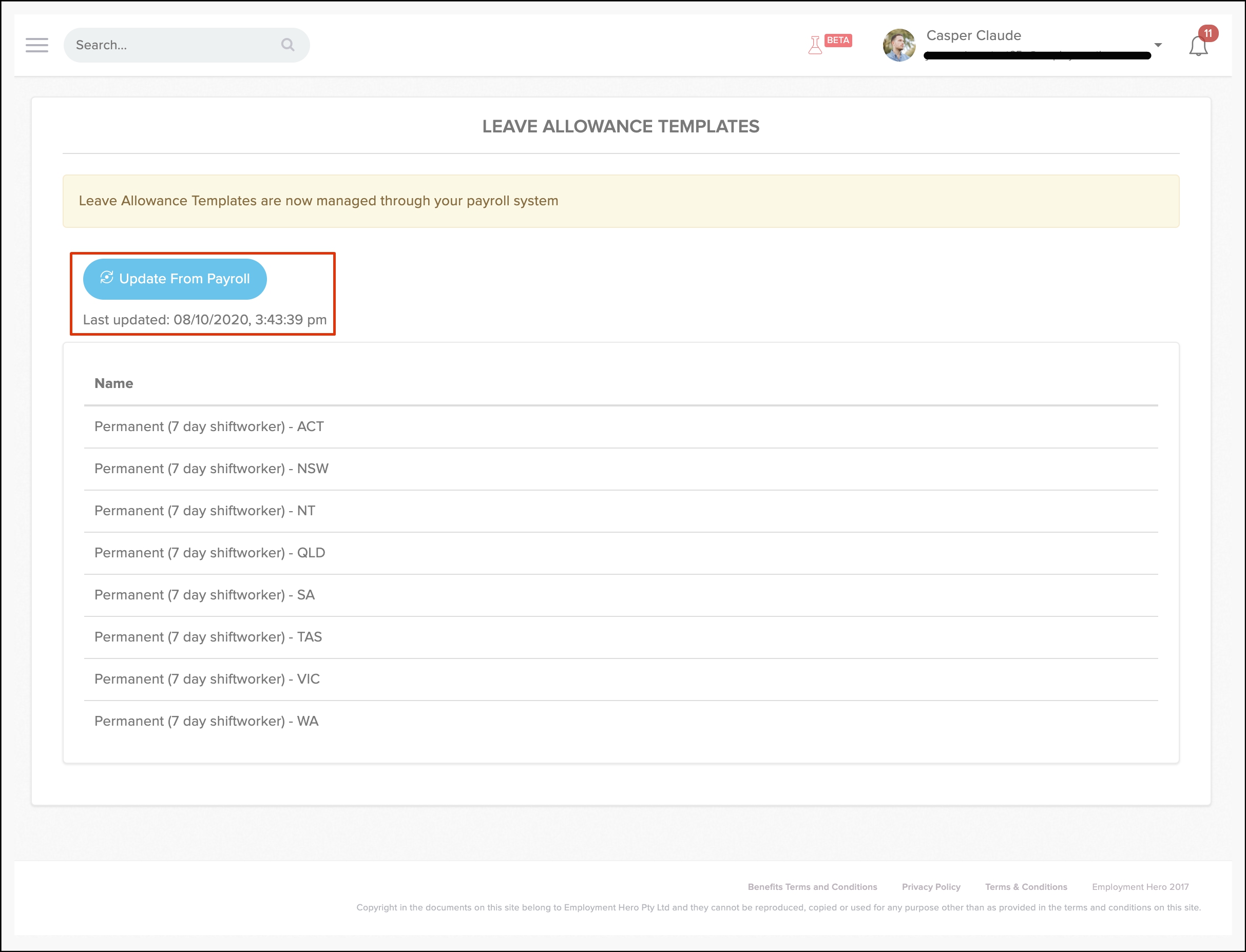 The Leve Allowance Template page will now show a grey Updated button. It means Employment Hero has successfully imported your leave allowance templates from your QuickBooks Online platform.