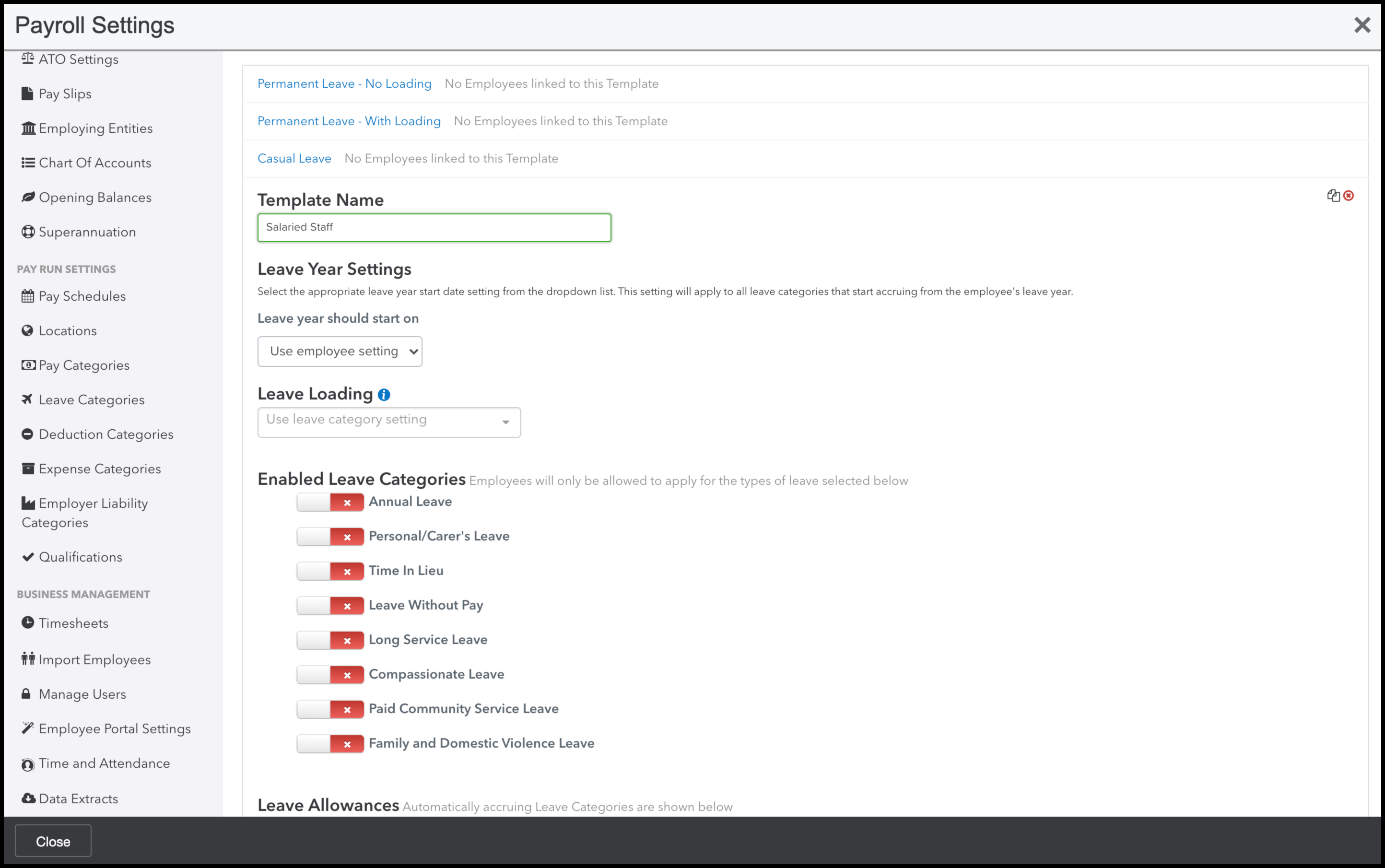 - Select the leave categories that need enabling.