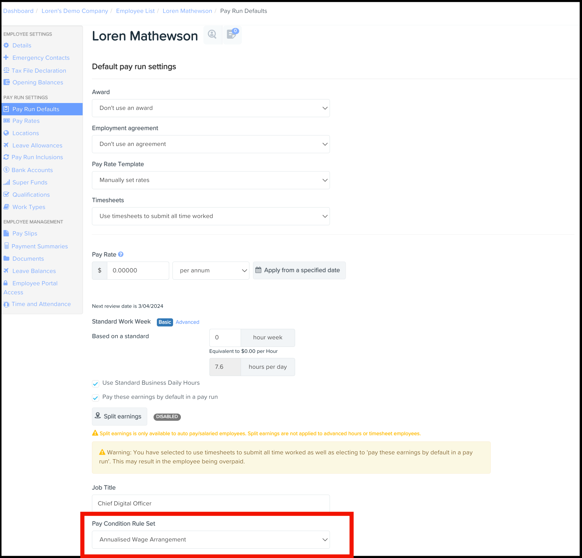 - Navigate to the employee's file and go to the Pay Run Defaults page.