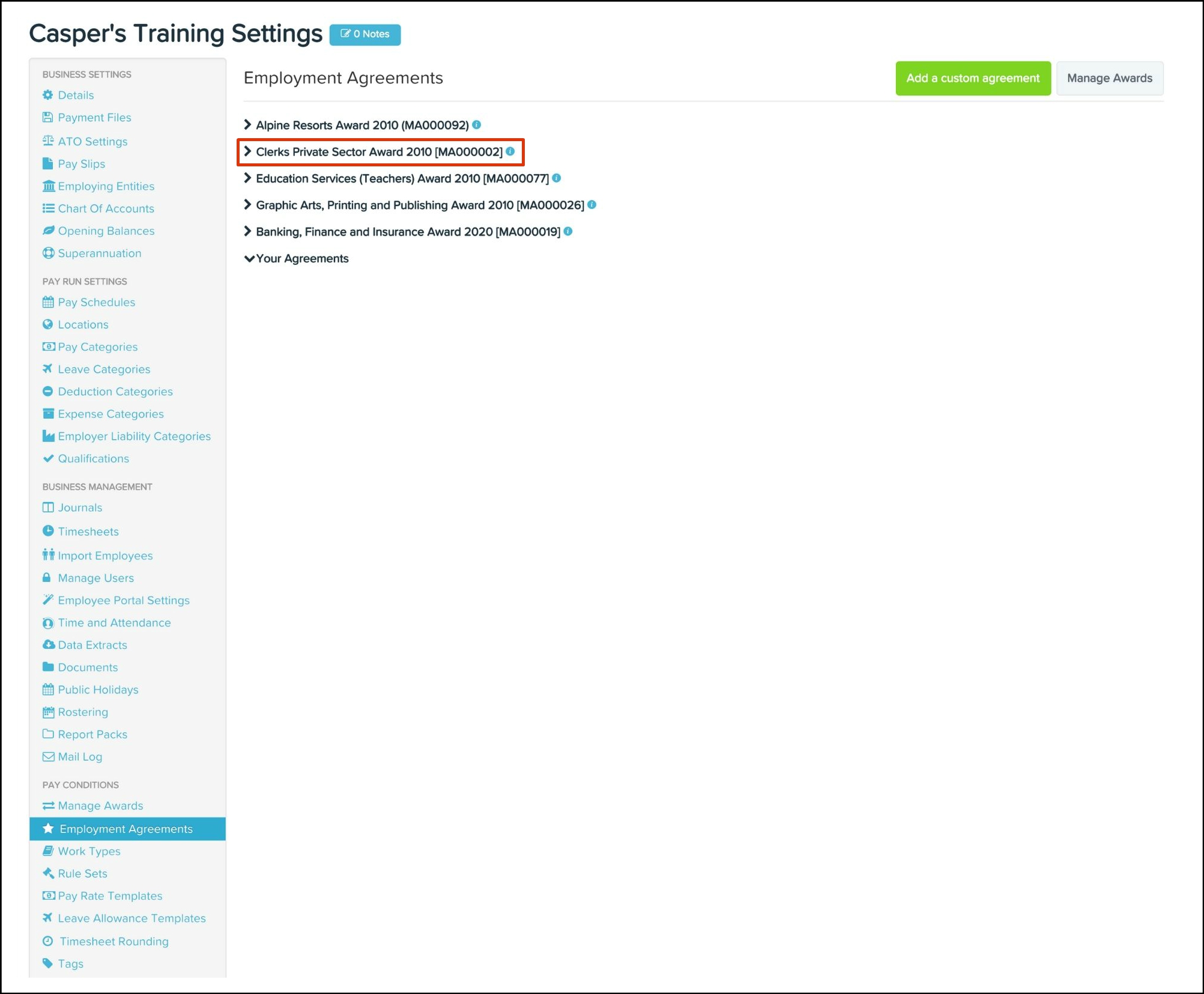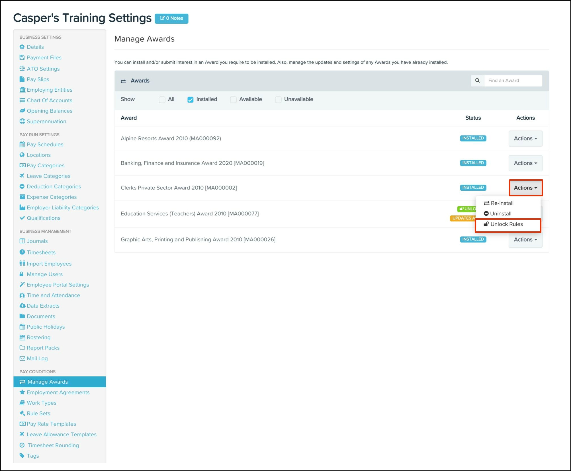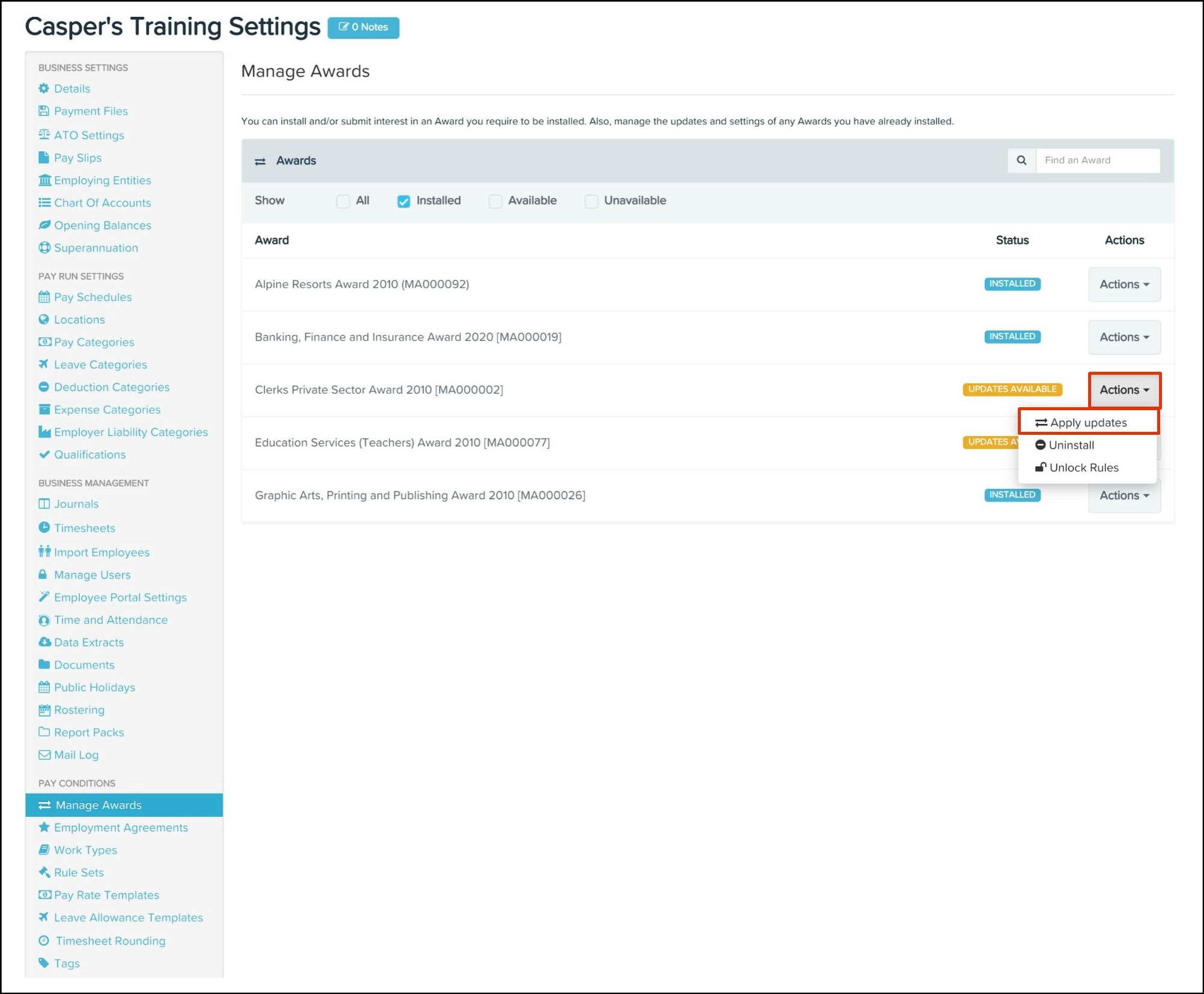 Any changes made to your awards and classifications will need syncing over to your HR platform. To read further details on how to undertake this, refer to the following article.