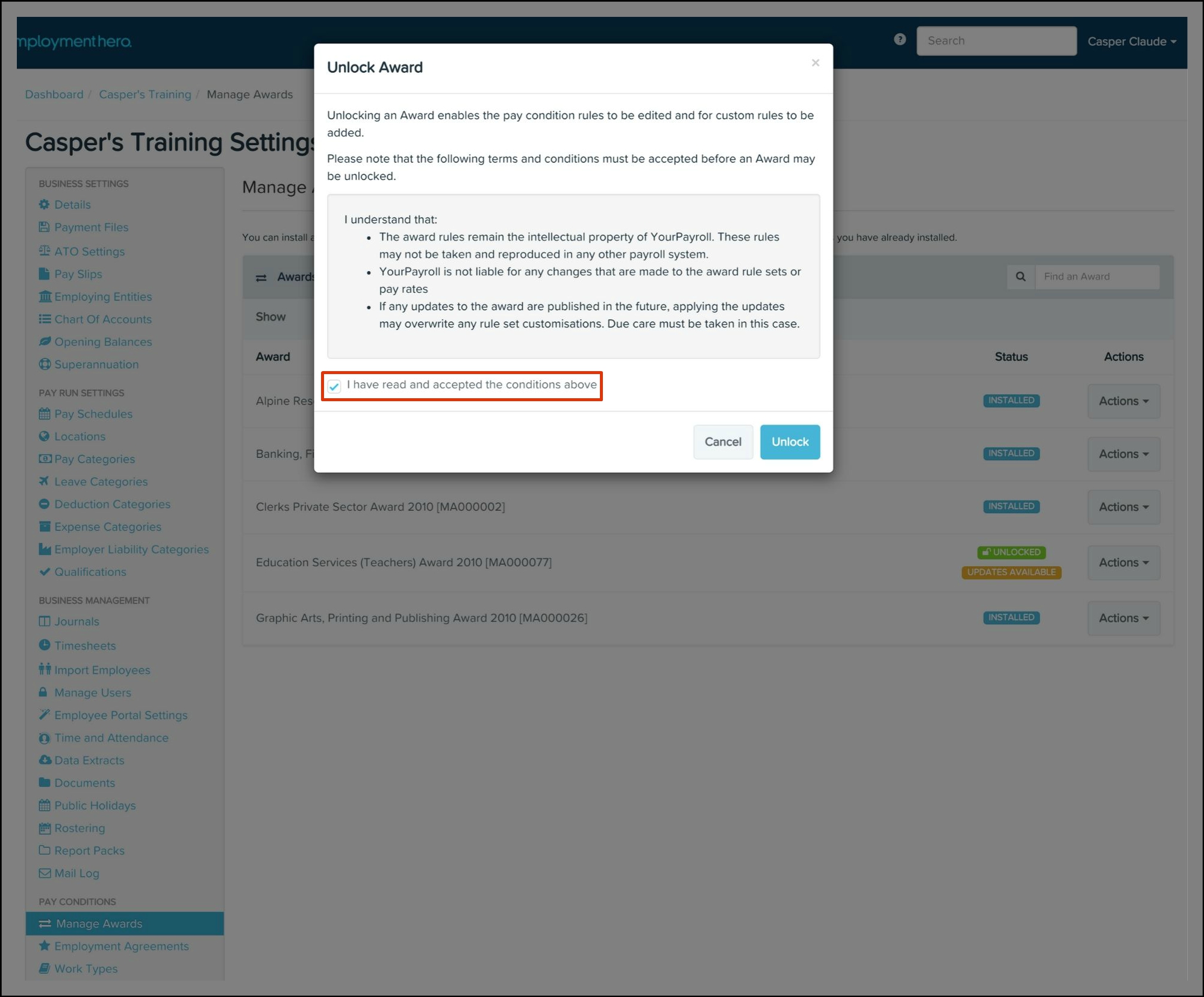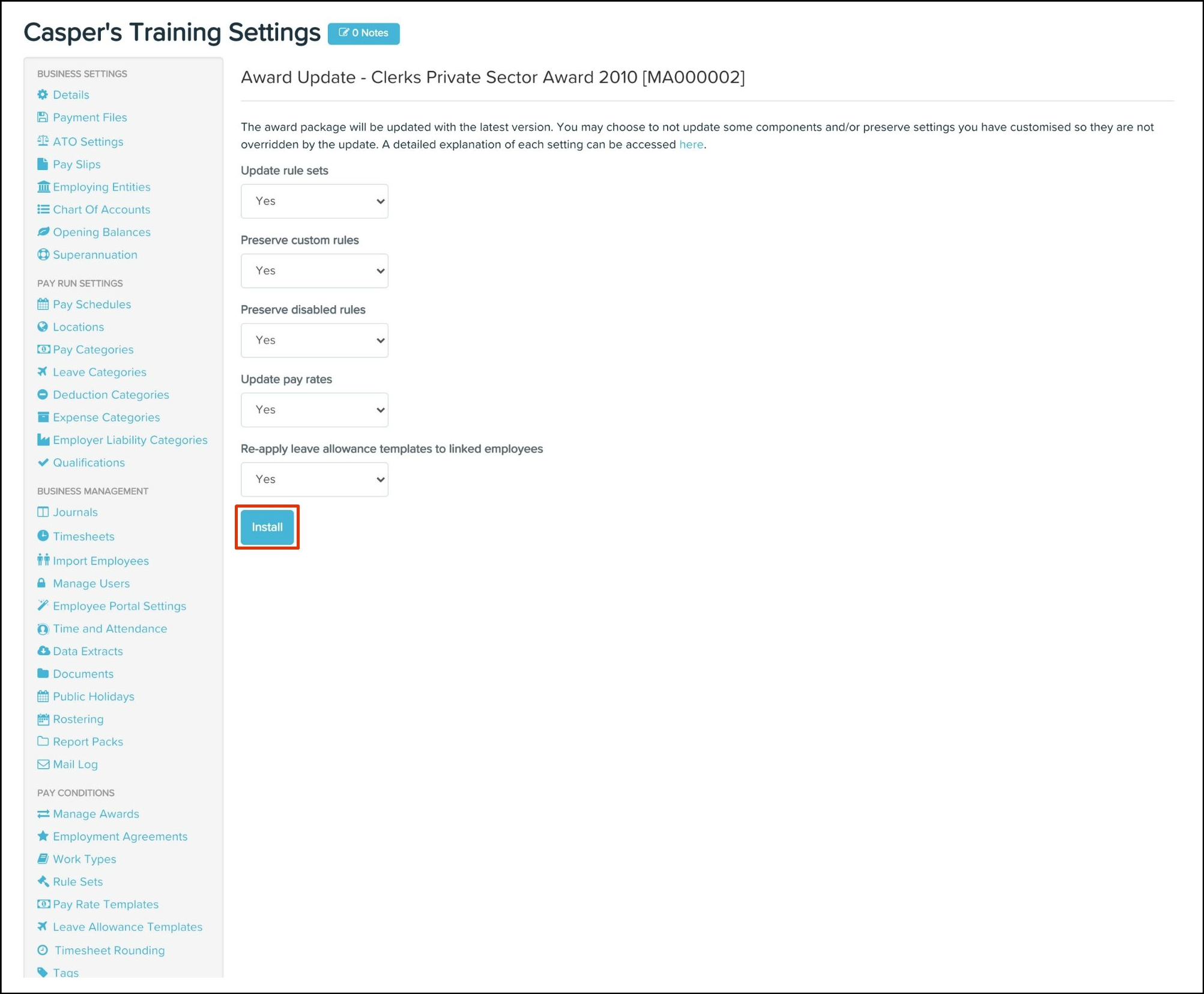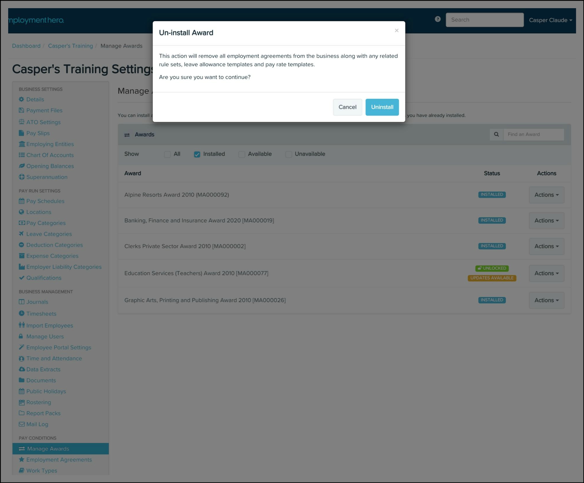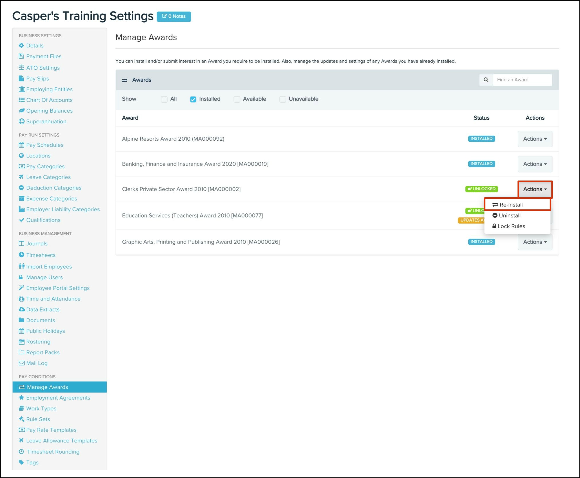 Any changes made to your awards and classifications will need syncing over to your HR platform. To read further details on how to undertake this, refer to the following article.
