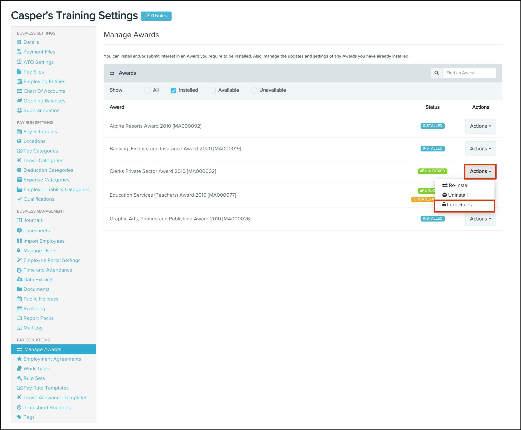 If you want to customise the award rules, you will need to use the unlock feature. If you lock the rule set after undertaking any form of customisation, then the award will revert to its default settings and erase the customisation options you made.