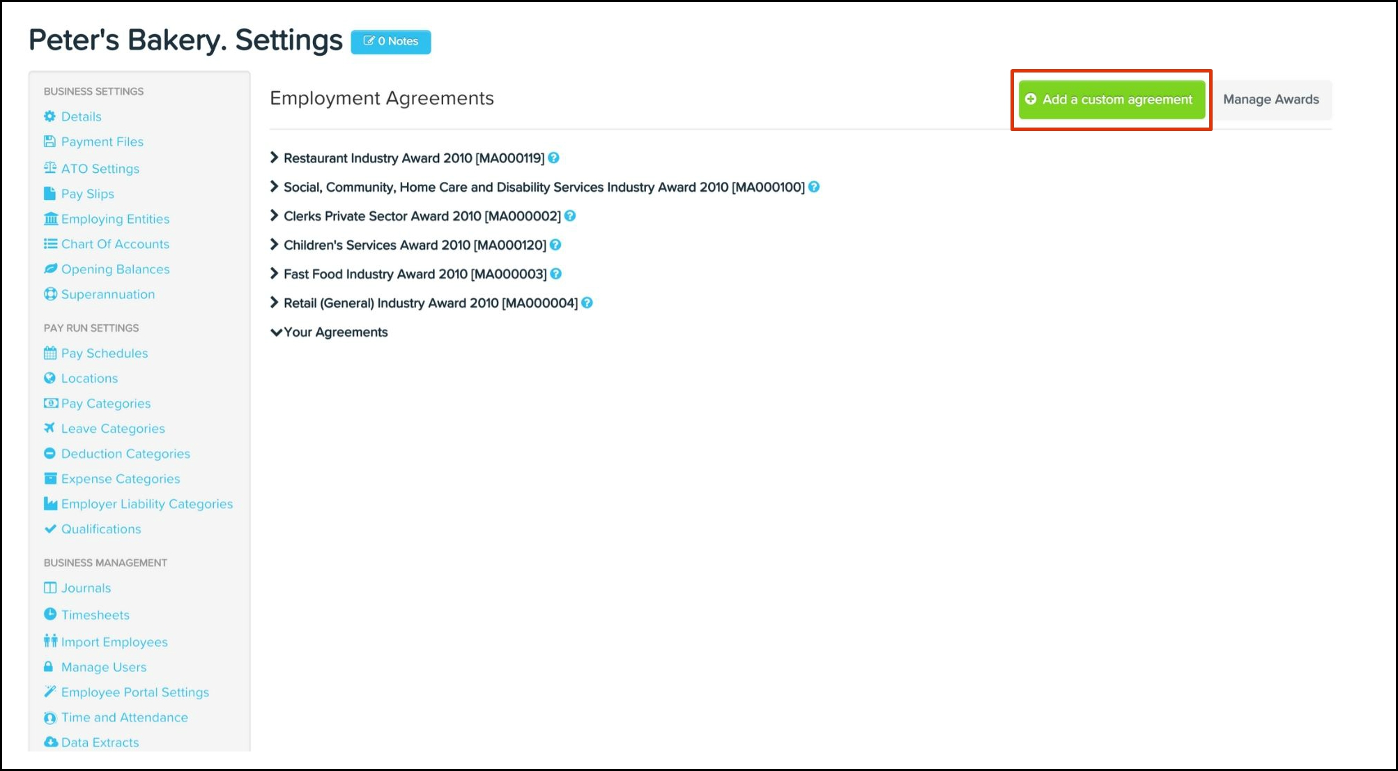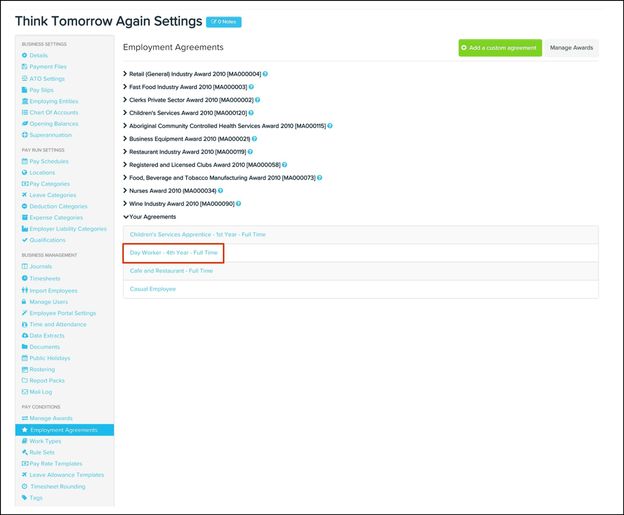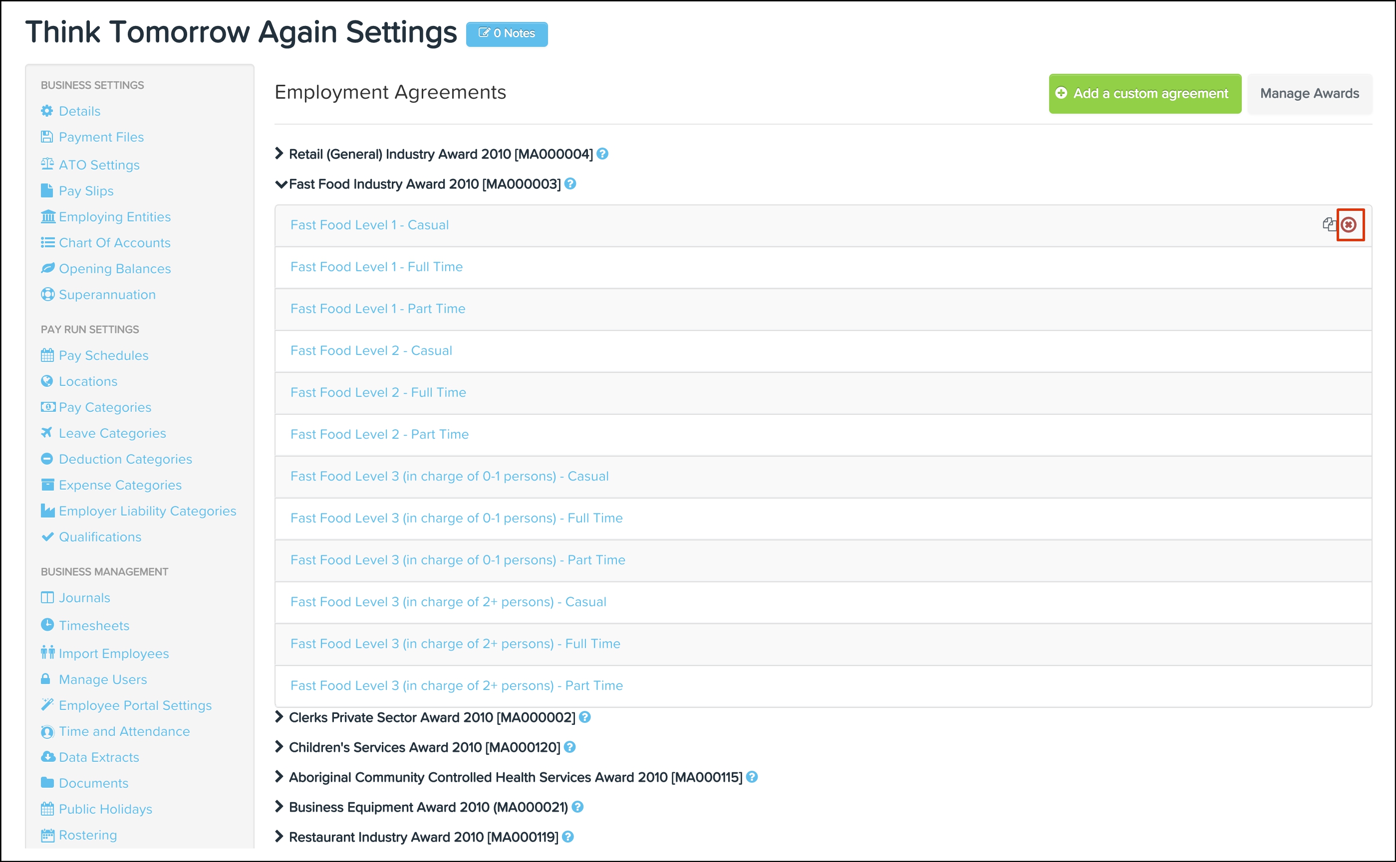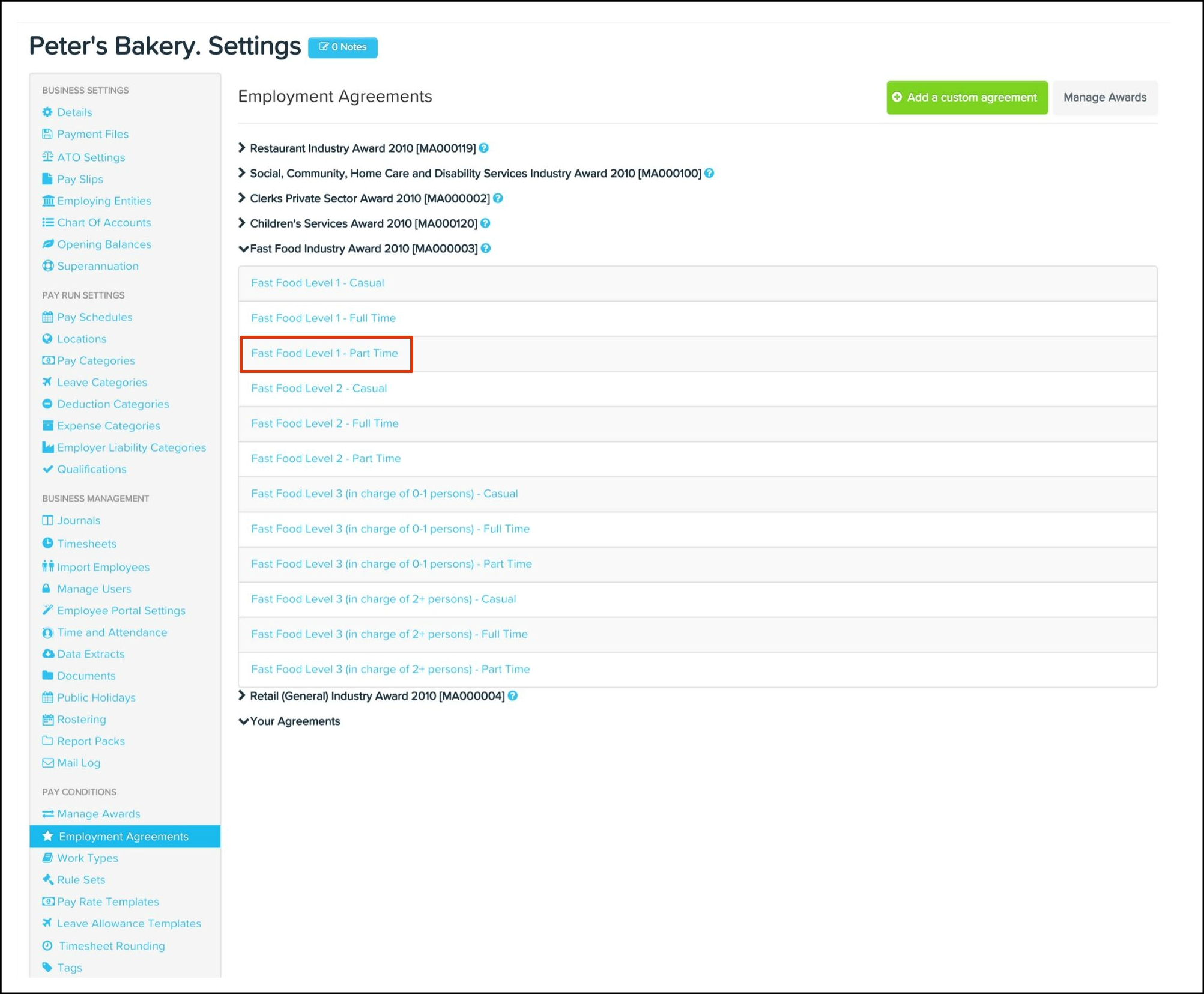 The employment agreements feature allows you to add customised agreements, edit award components and delete your own customised agreements along with any non-required pre-built award component.