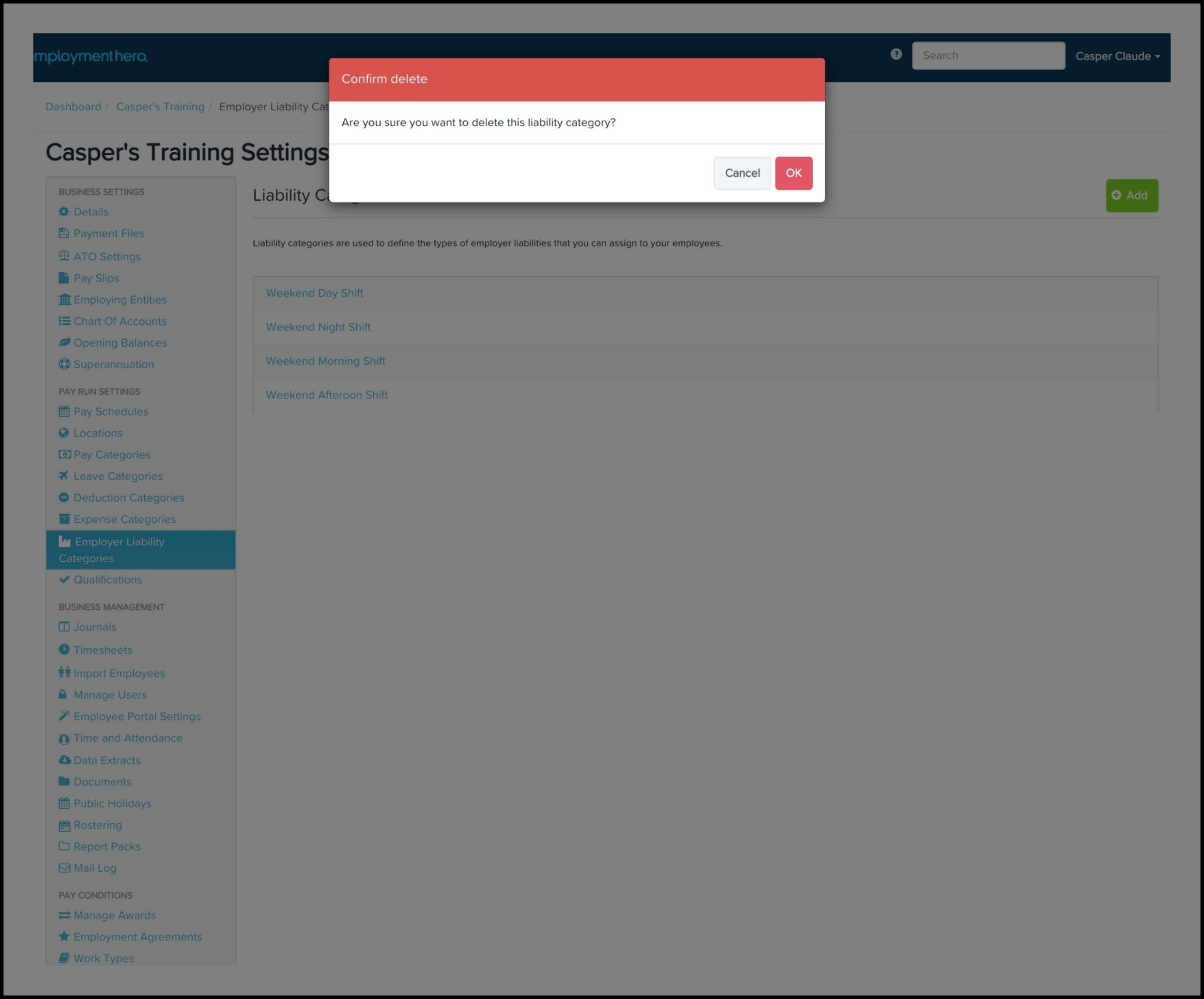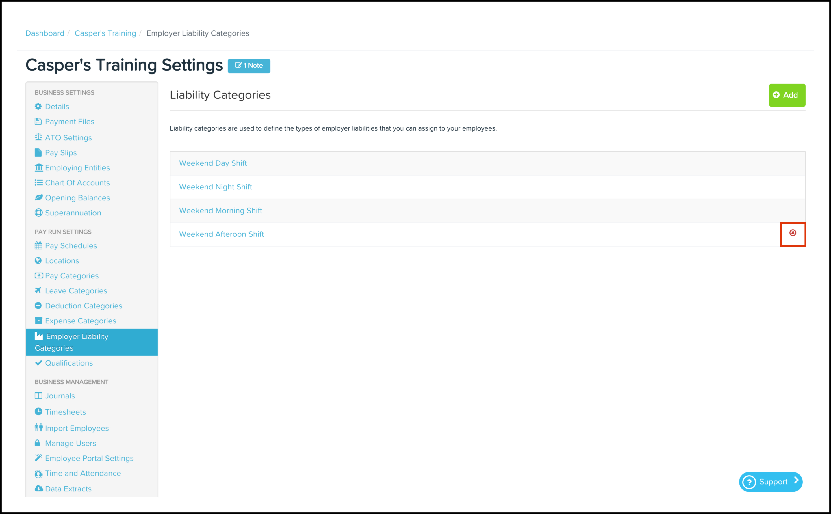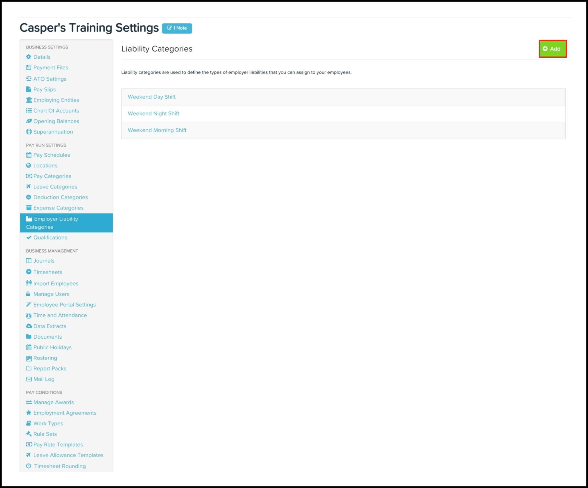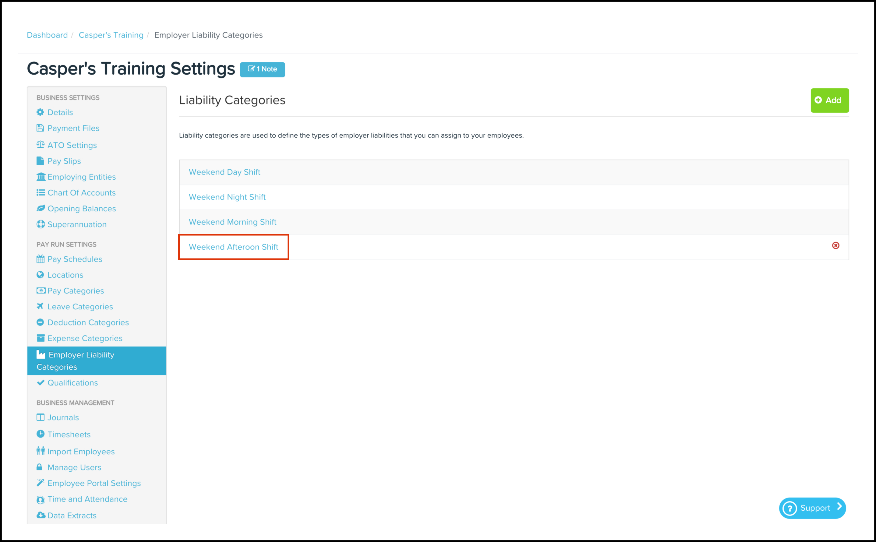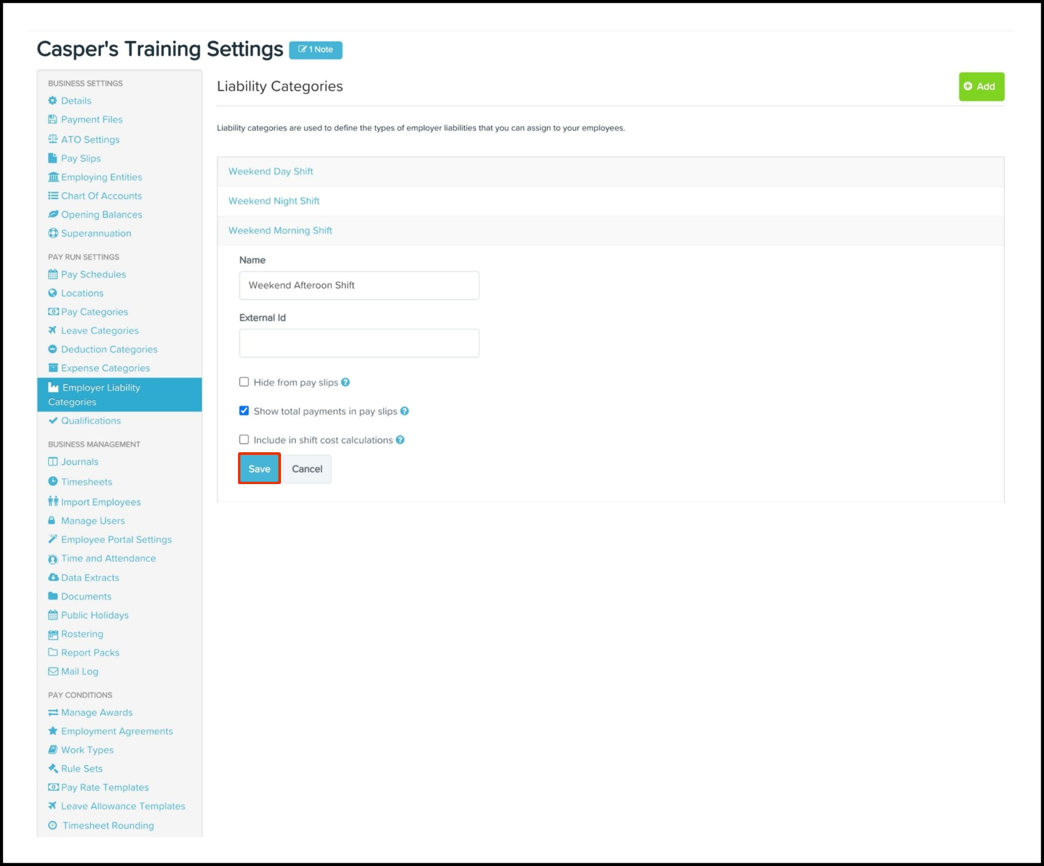 The Employer Liability Categories feature allows you to create a new employer liability category and specific details such as its name, external ID, whether to hide it from employee pay slips and whether to include it in shift cost calculations. You can also use this feature to edit any information if it changes and delete a record if it is no longer required.