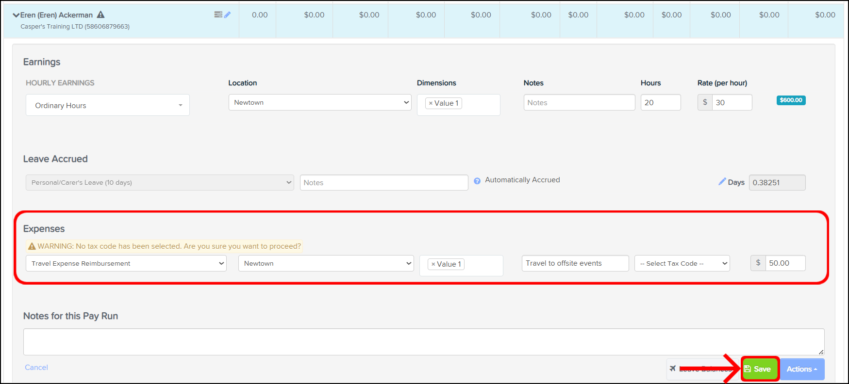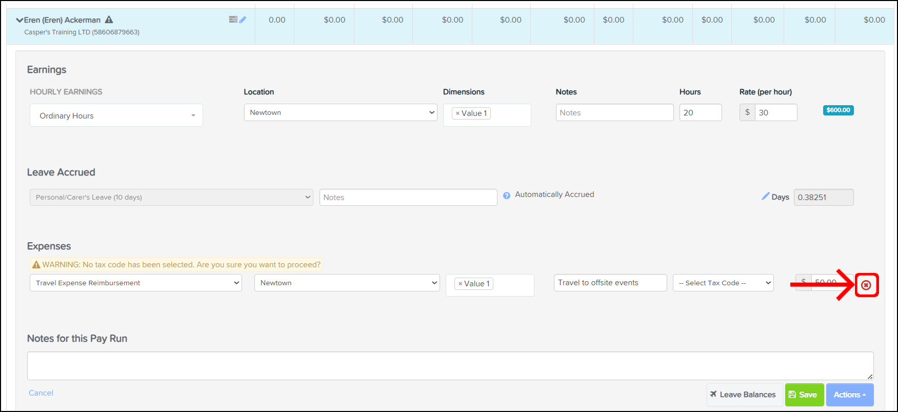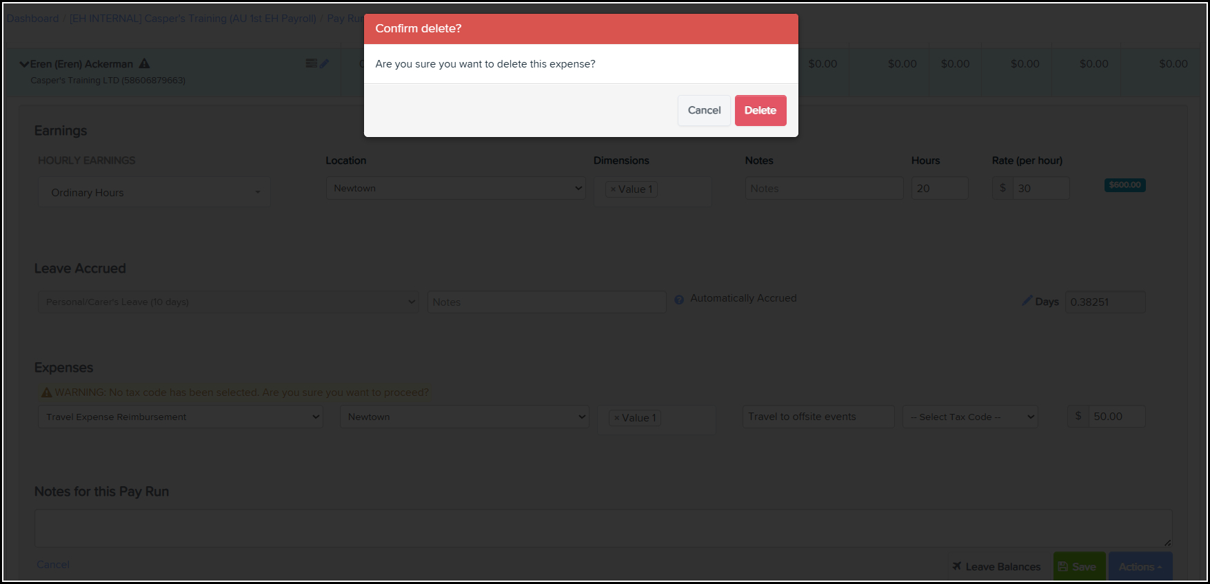 You can use this feature to add expense lines for an employee during the Pay Run. You can also use this feature to delete an entry added in error. However, expense categories need creating before you can add them into the Pay Run. Once you have created an expense category, a Pay Run needs to be created next, before you can add or remove an expense line.