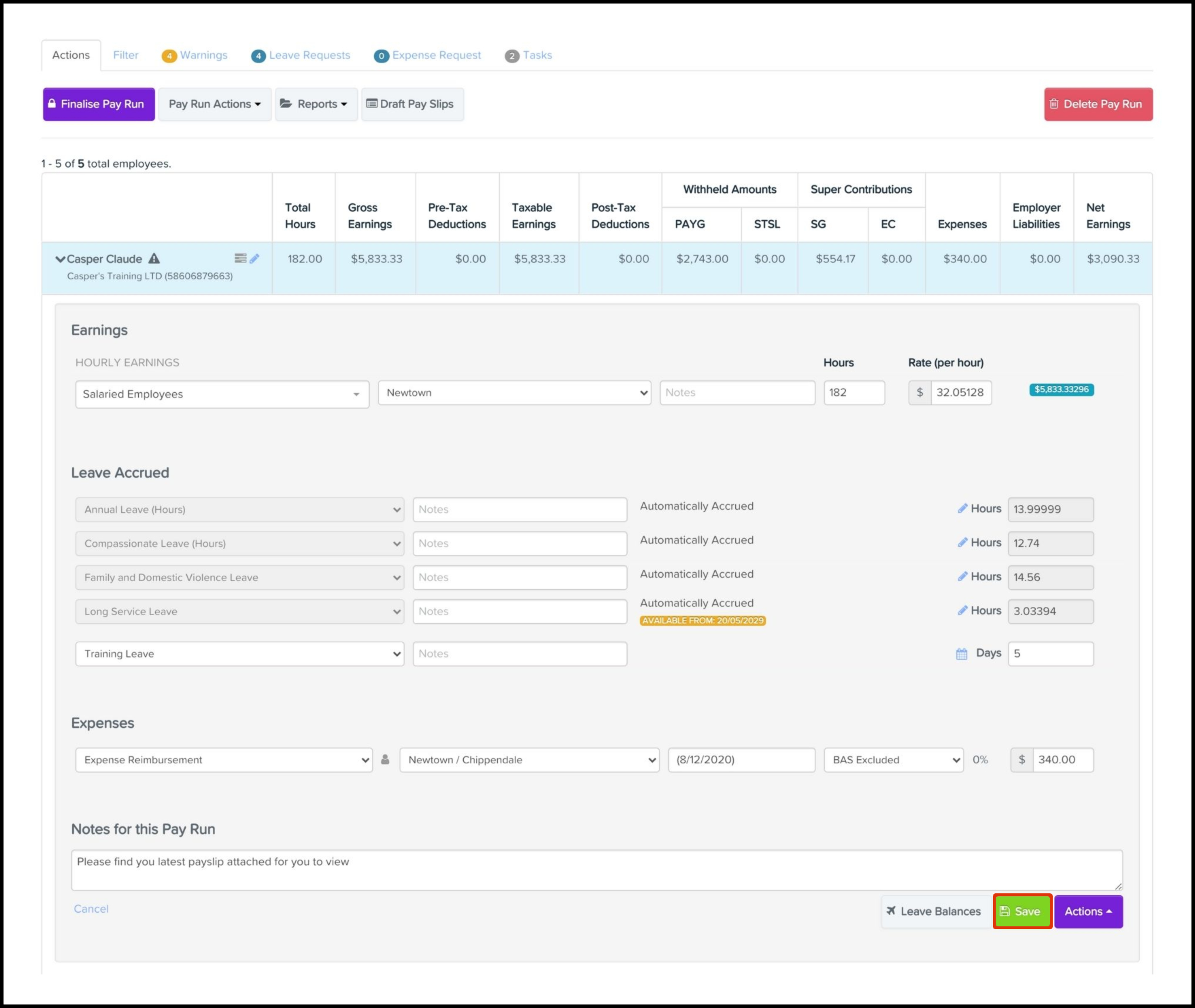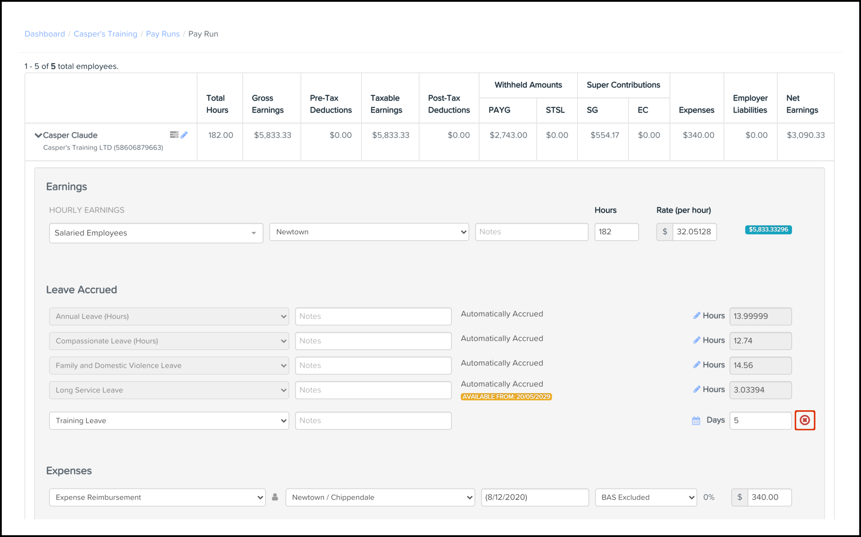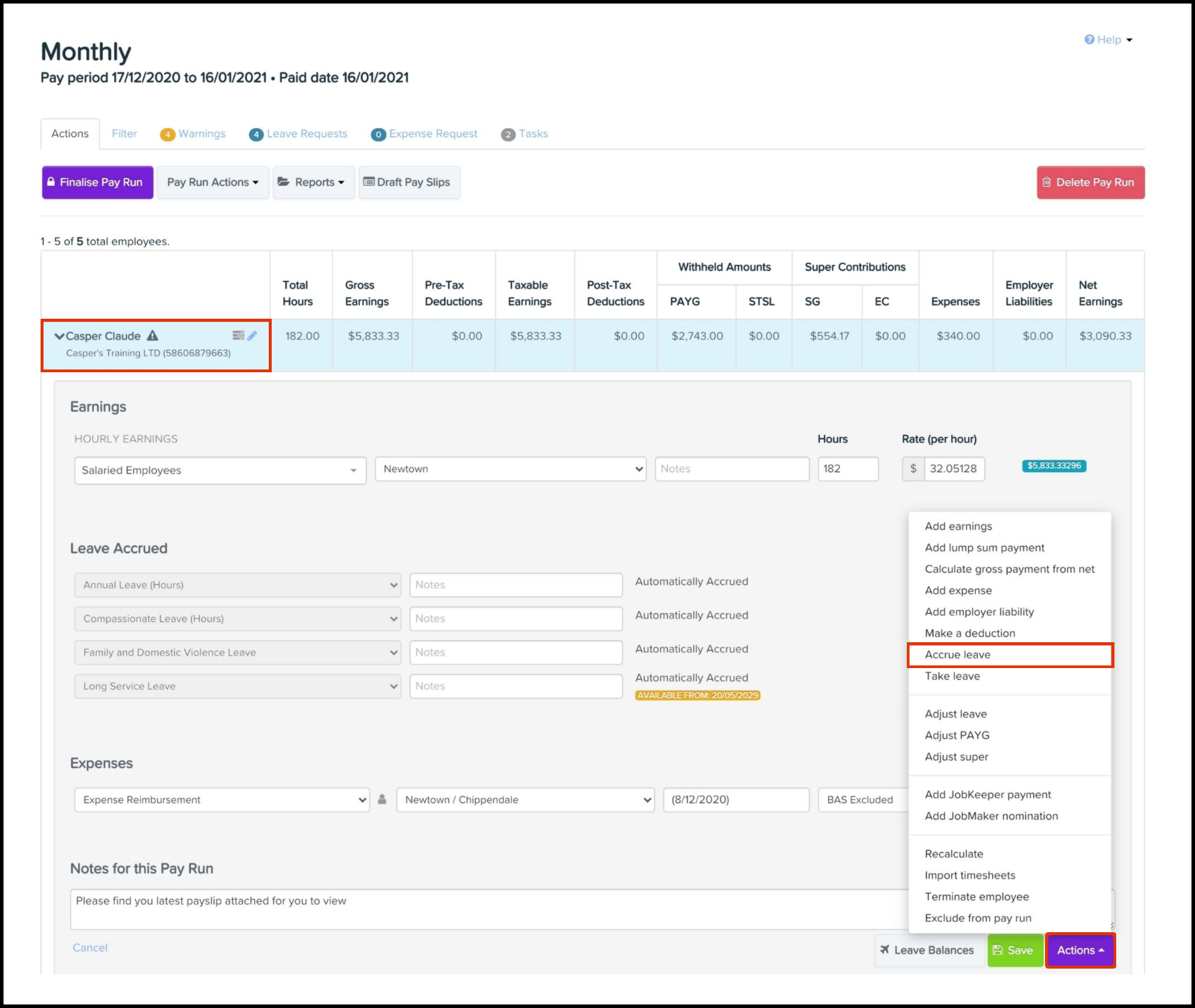 You can use the Accrued Leave feature in the Pay Run module to add an extra accrued leave line. You can also set up details like the leave category, leave value, and any needed supporting notes. You can also use this feature to delete a leave-accrued line if you added it in error. A pay run needs creating first, before you can add or remove employee-accrued leave lines. To read further details on how to create a pay run, refer to the following article.