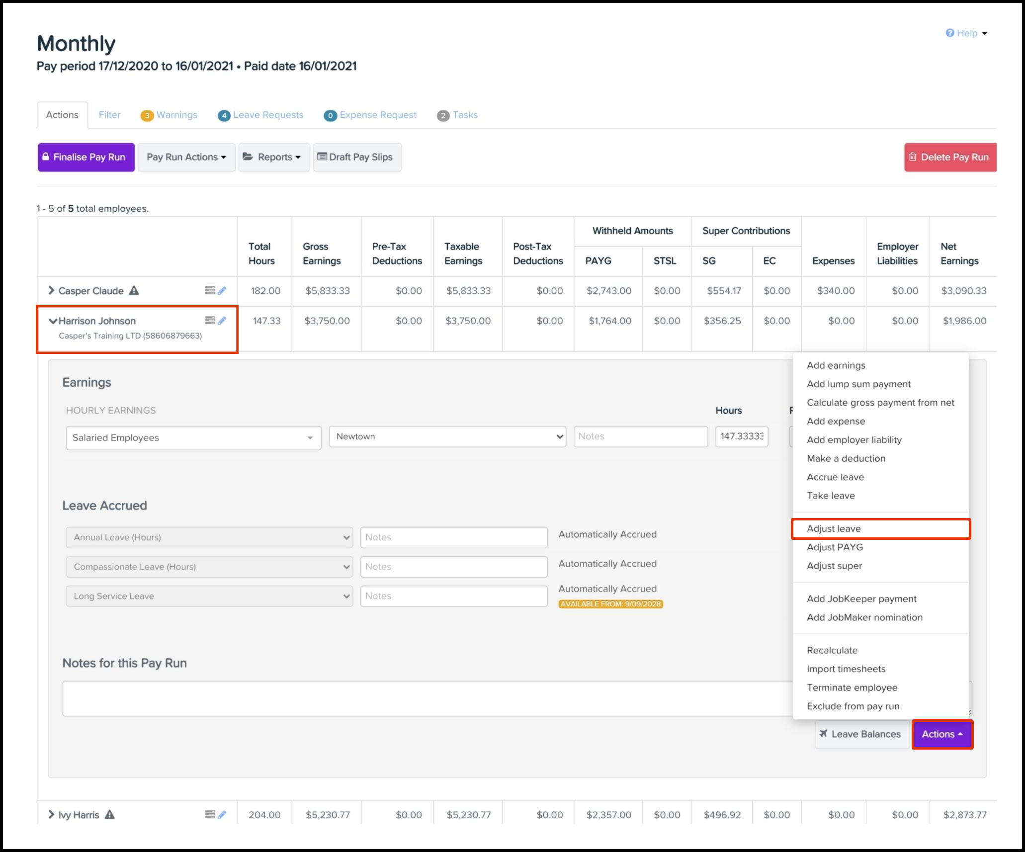 - Leave adjustments can only be made after your next pay run.