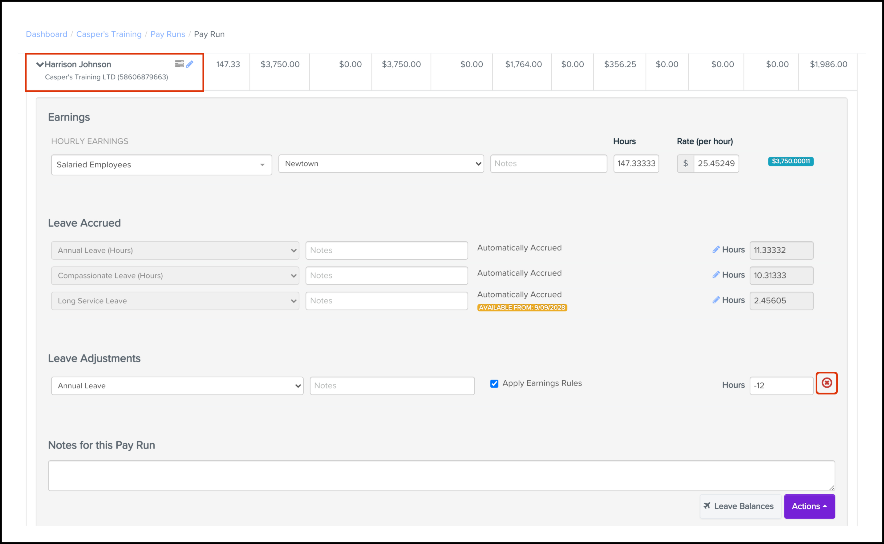 This will offset previous leave taken, earnings figures, and correct both the pay category and balance. The resultant Leave Adjustment will also create an earnings line for the employee, effectively showing that adjustments were made to their leave.