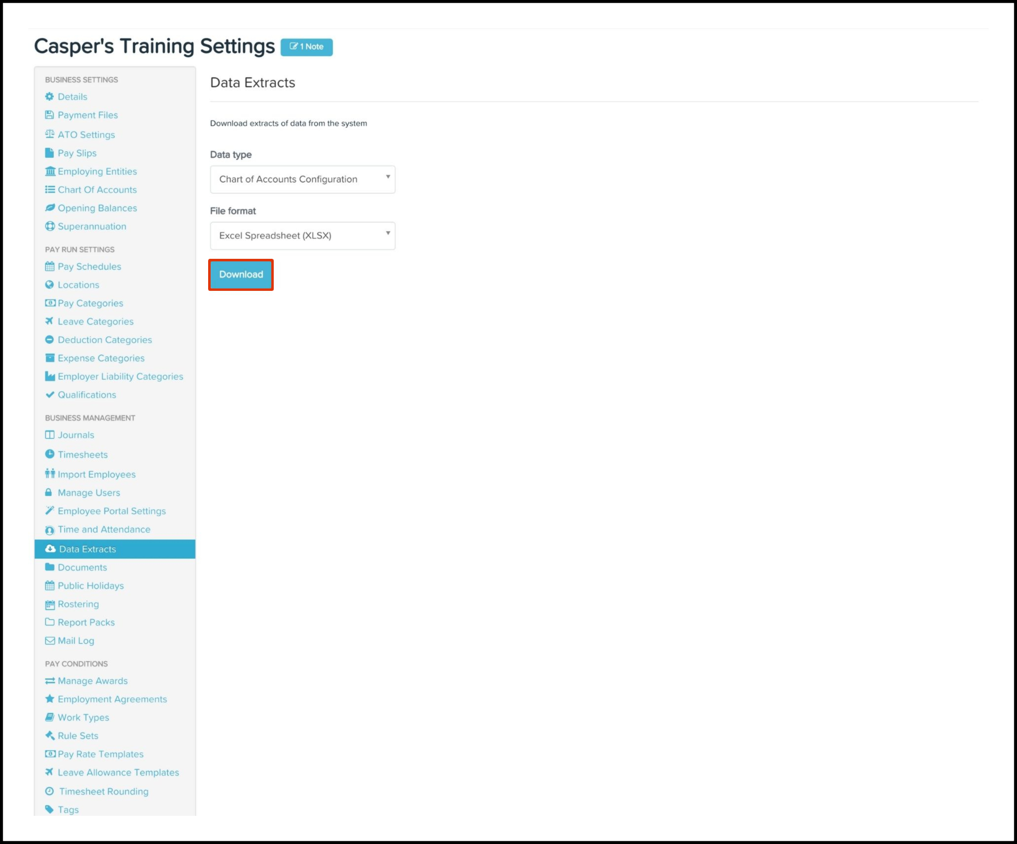 The Data Extract feature enables you to download your chart of account configuration data stored within your Payroll classic platform as either a XLSX or CSV file.