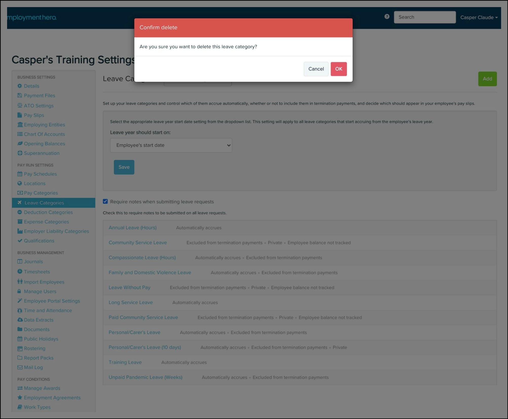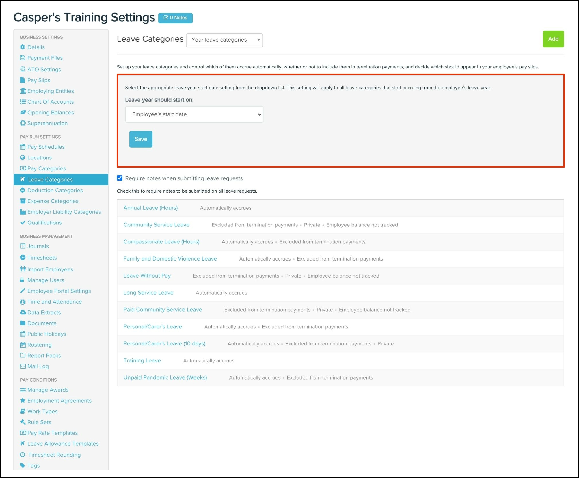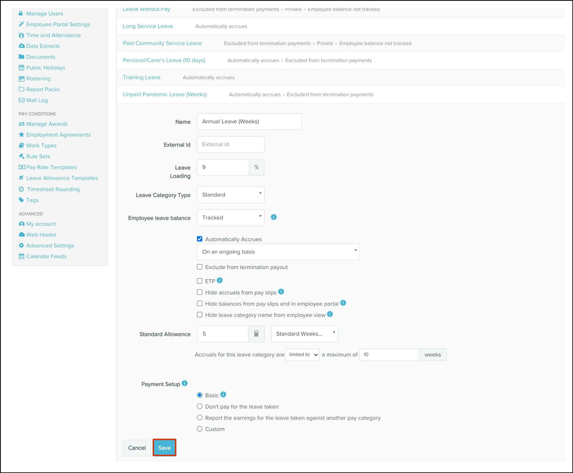 The Leave Category feature allows you to create a new leave category, determine what type it will fall under, choose a payment setup, and what leave loading rates will apply. This feature also allows you to edit any of the information if it changes and delete a category if it is no longer relevant.