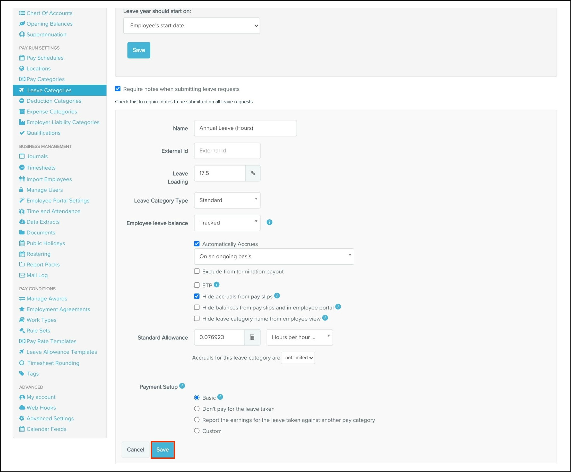 - Payment Setup - This determines whether the employee is paid for the leave taken and the pay category that is assigned when leave is taken. (The default setting for Payment Setup on the Annual Leave - leave category used to be basic, but this has been updated in later releases so that the leave is reported against a separate pay category called Annual Leave Taken - you are free to change this if necessary)