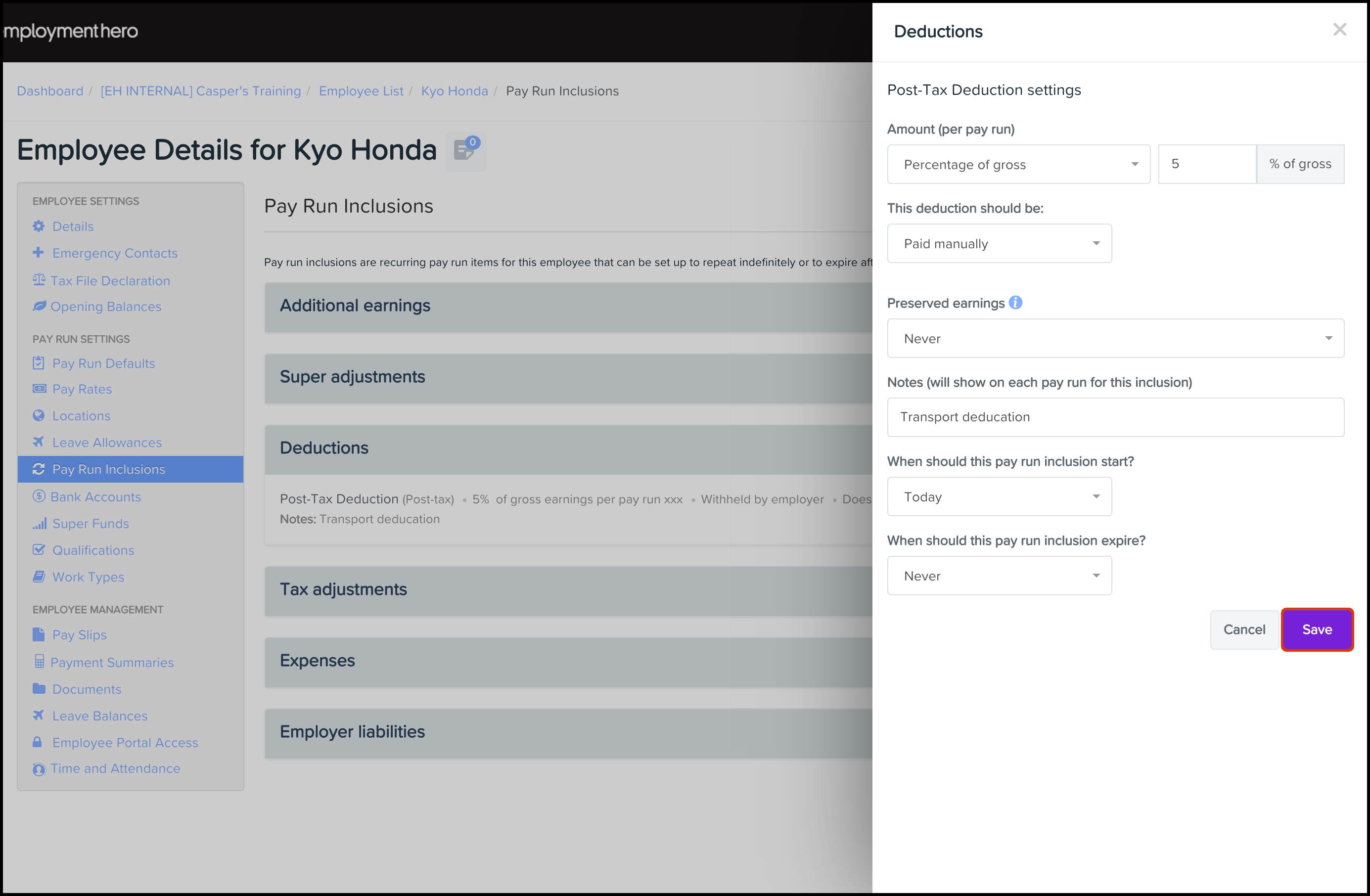 - Set Up and Manage an Employee's Expense Pay Run Inclusion This feature allows you to set up an automated expense where you can choose the category, the date the inclusion starts on, and the expense amount.
