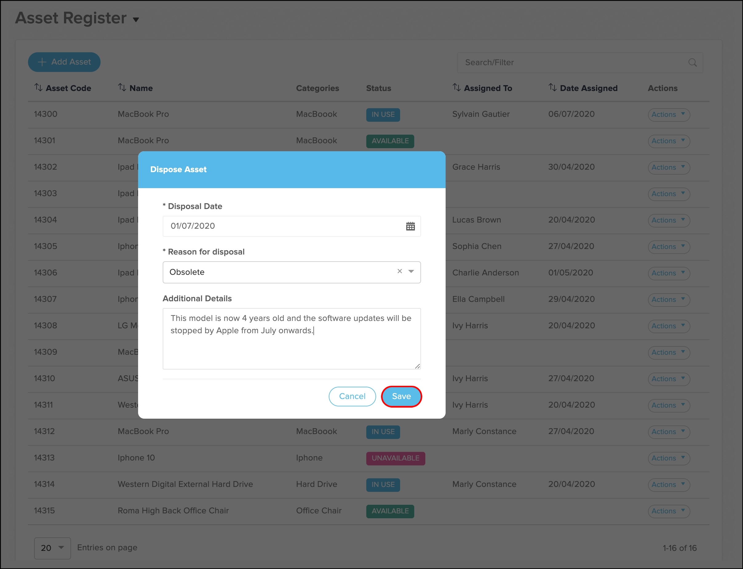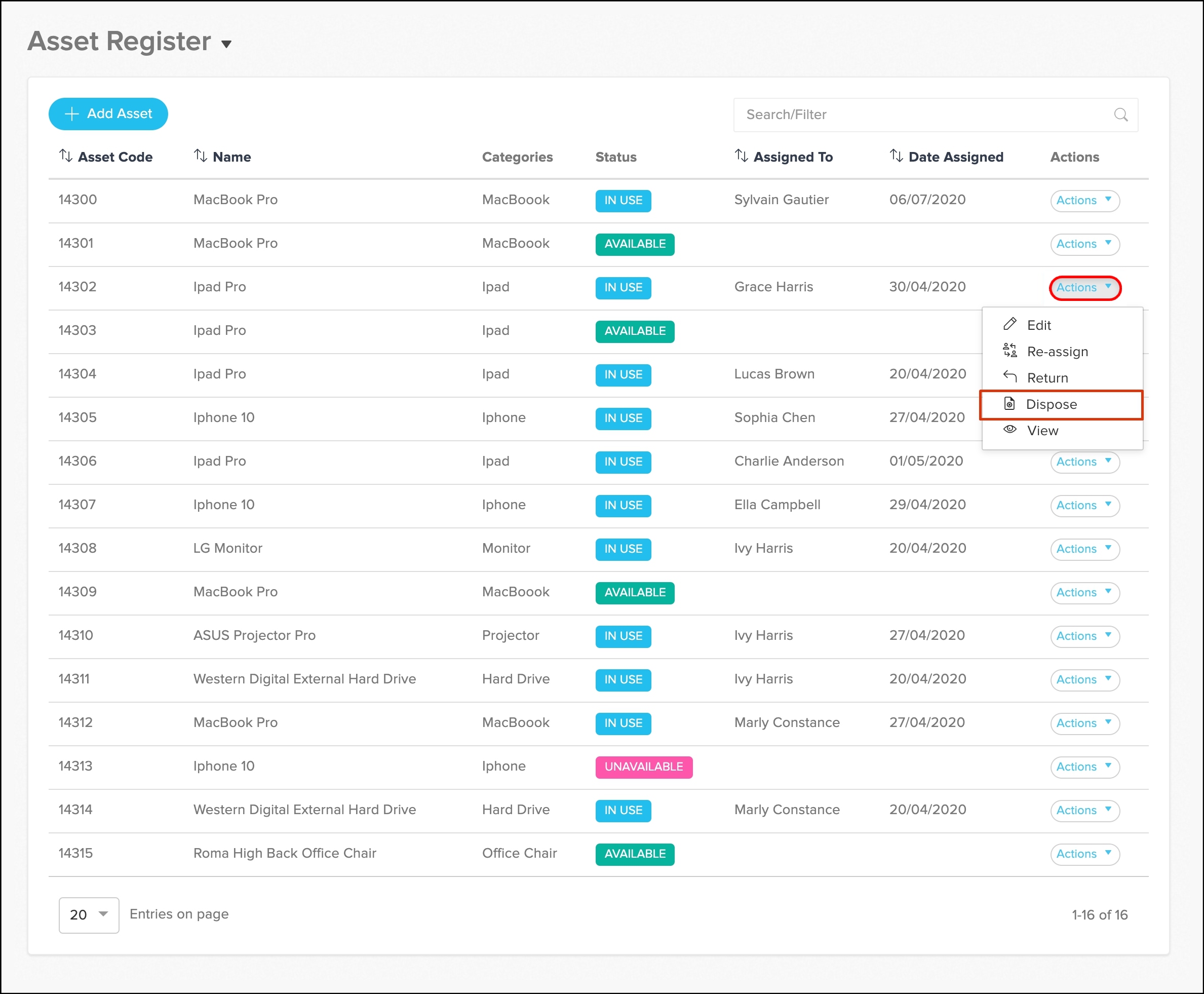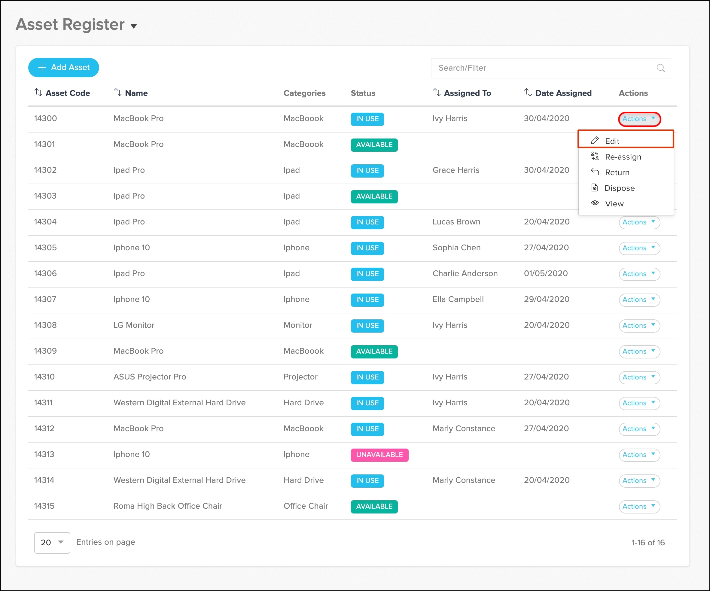 The Asset Register feature allows you to create a list of assets owned by your organisation. With the ability to specify the code, the category it falls under, the purchase amount, and the name of the item owner. You can also use this feature to edit the asset details, update the category information, re-assign an item, and dispose of a piece of equipment if needed.