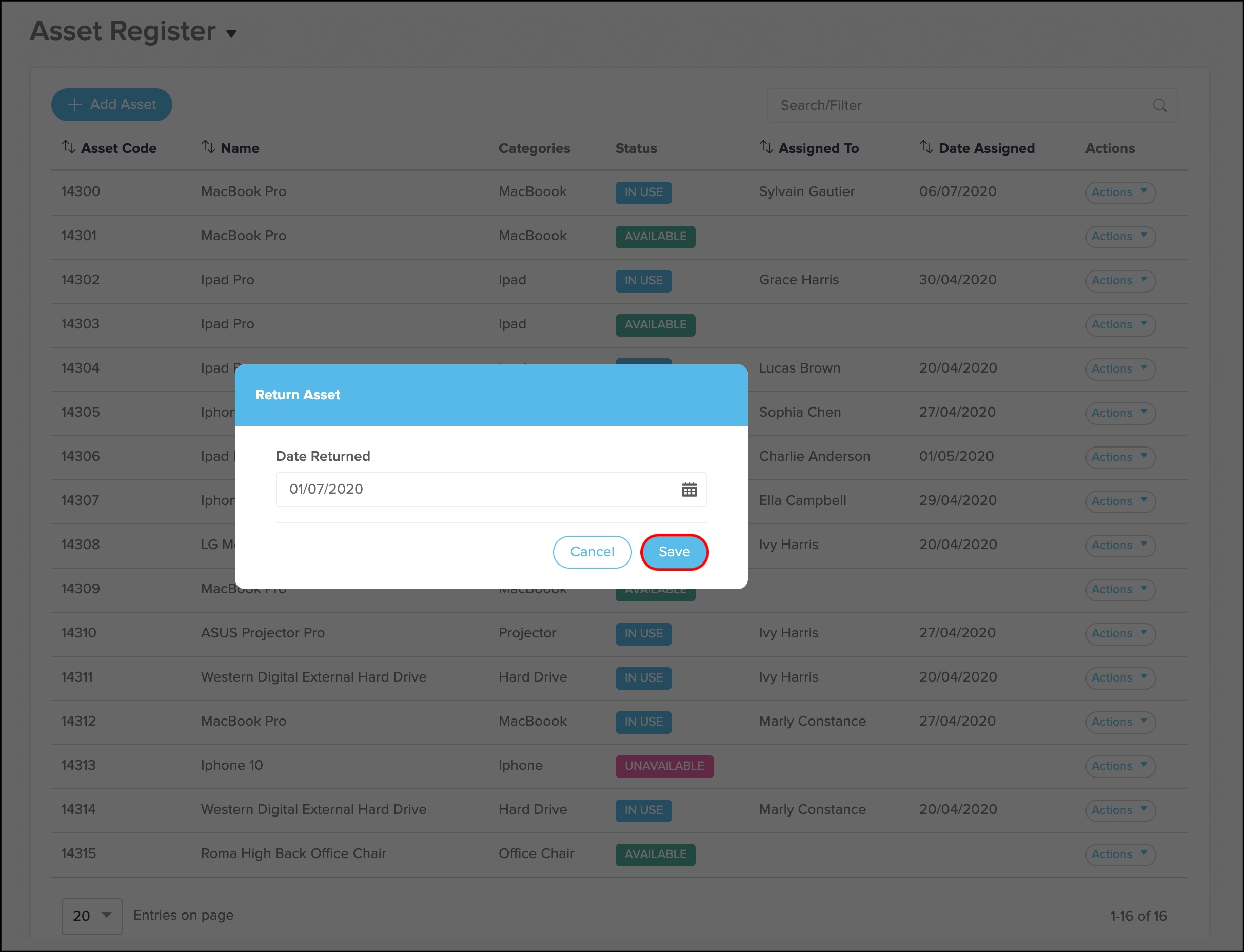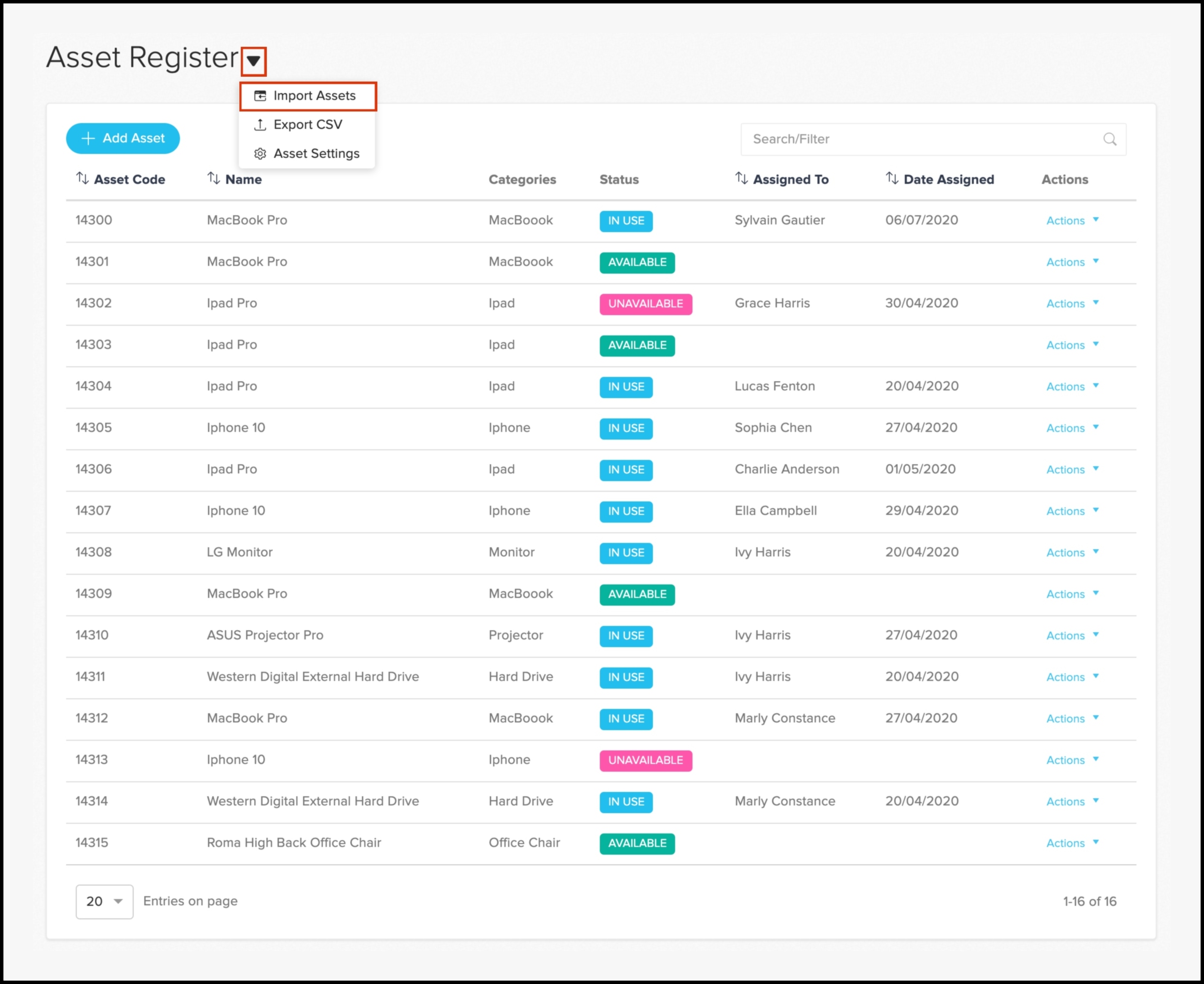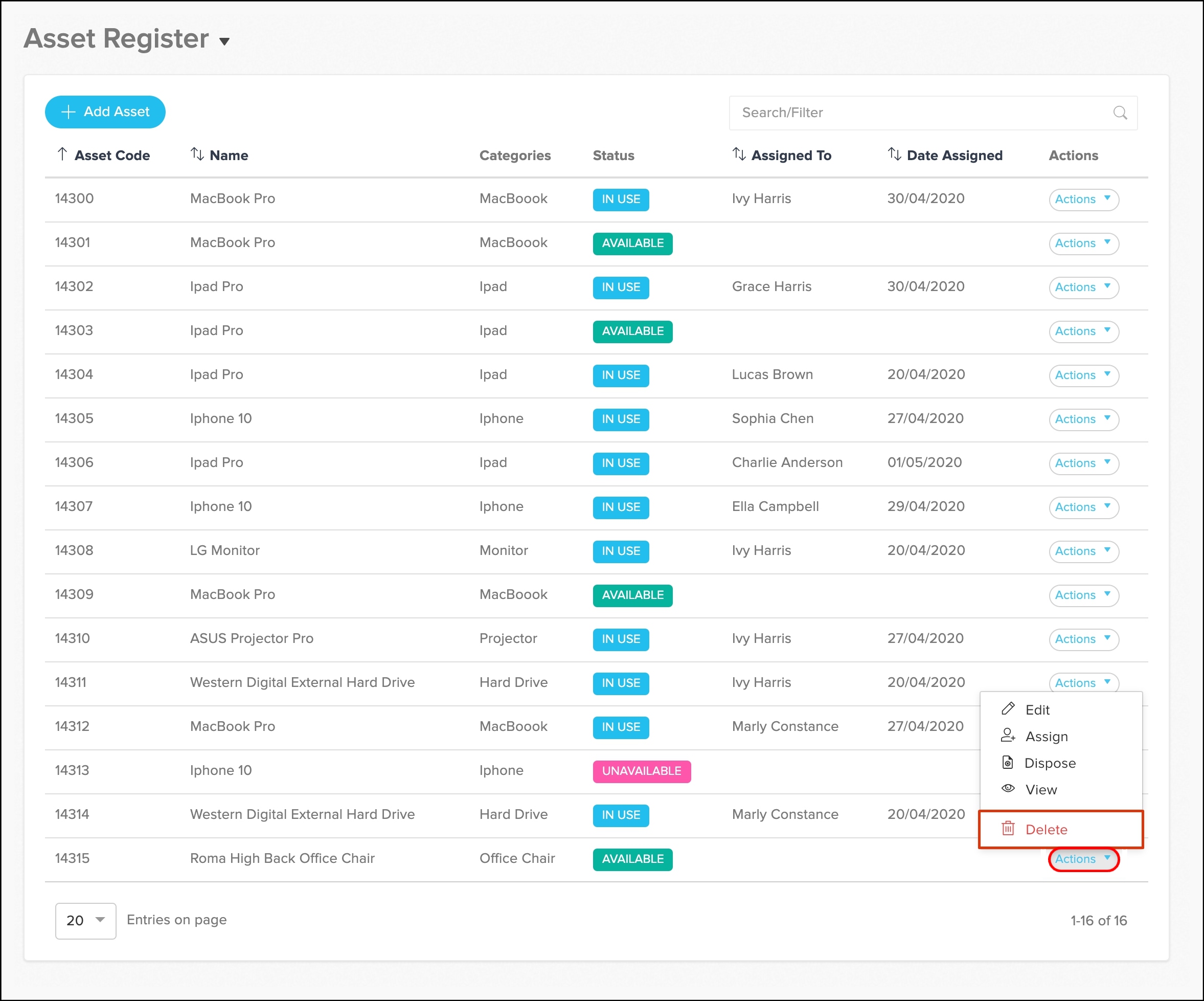 The Asset Register feature allows you to create a list of assets owned by your organisation. With the ability to specify the code, the category it falls under, the purchase amount, and the name of the item owner. You can also use this feature to edit the asset details, update the category information, re-assign an item, and dispose of a piece of equipment if needed.