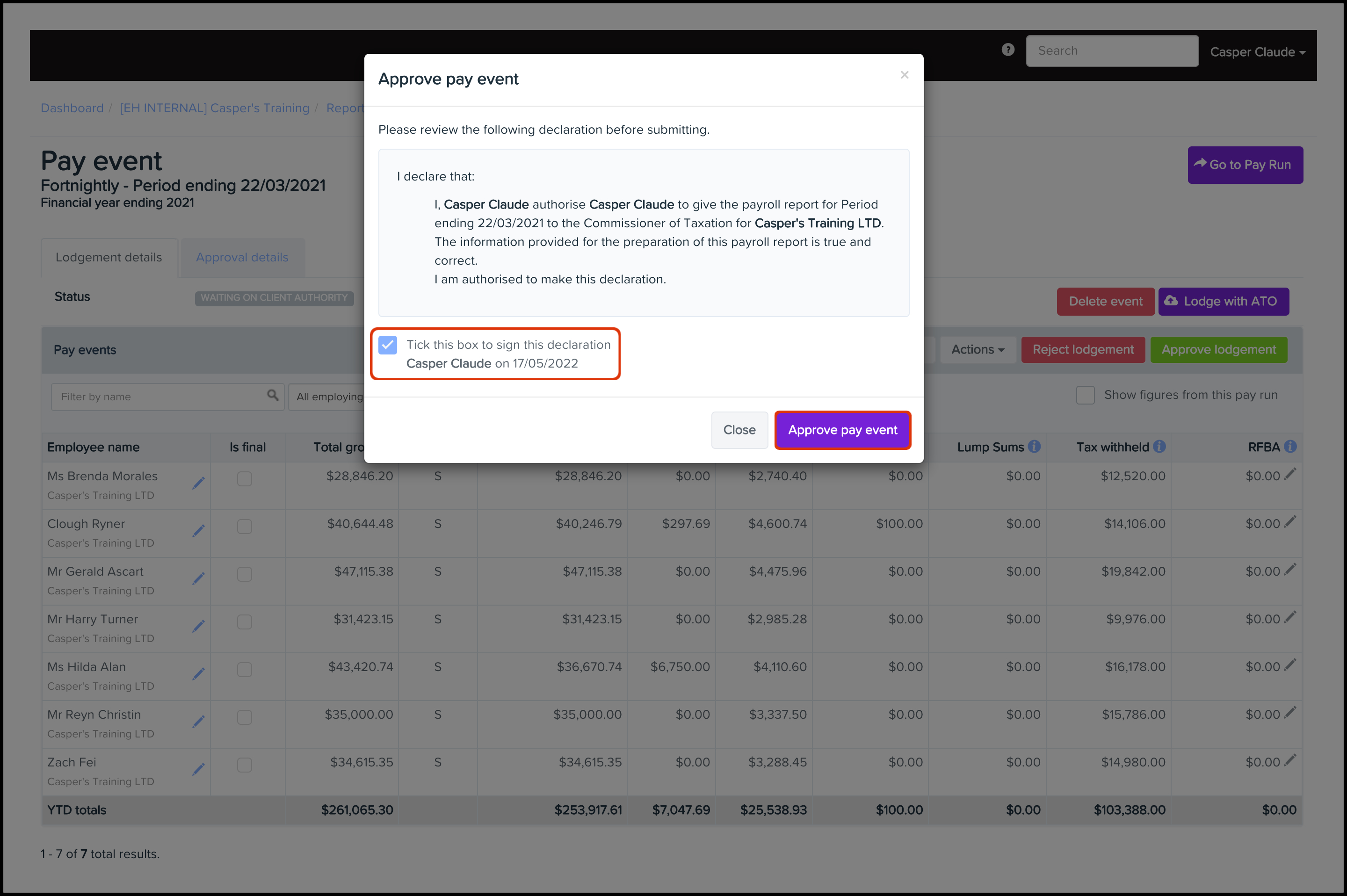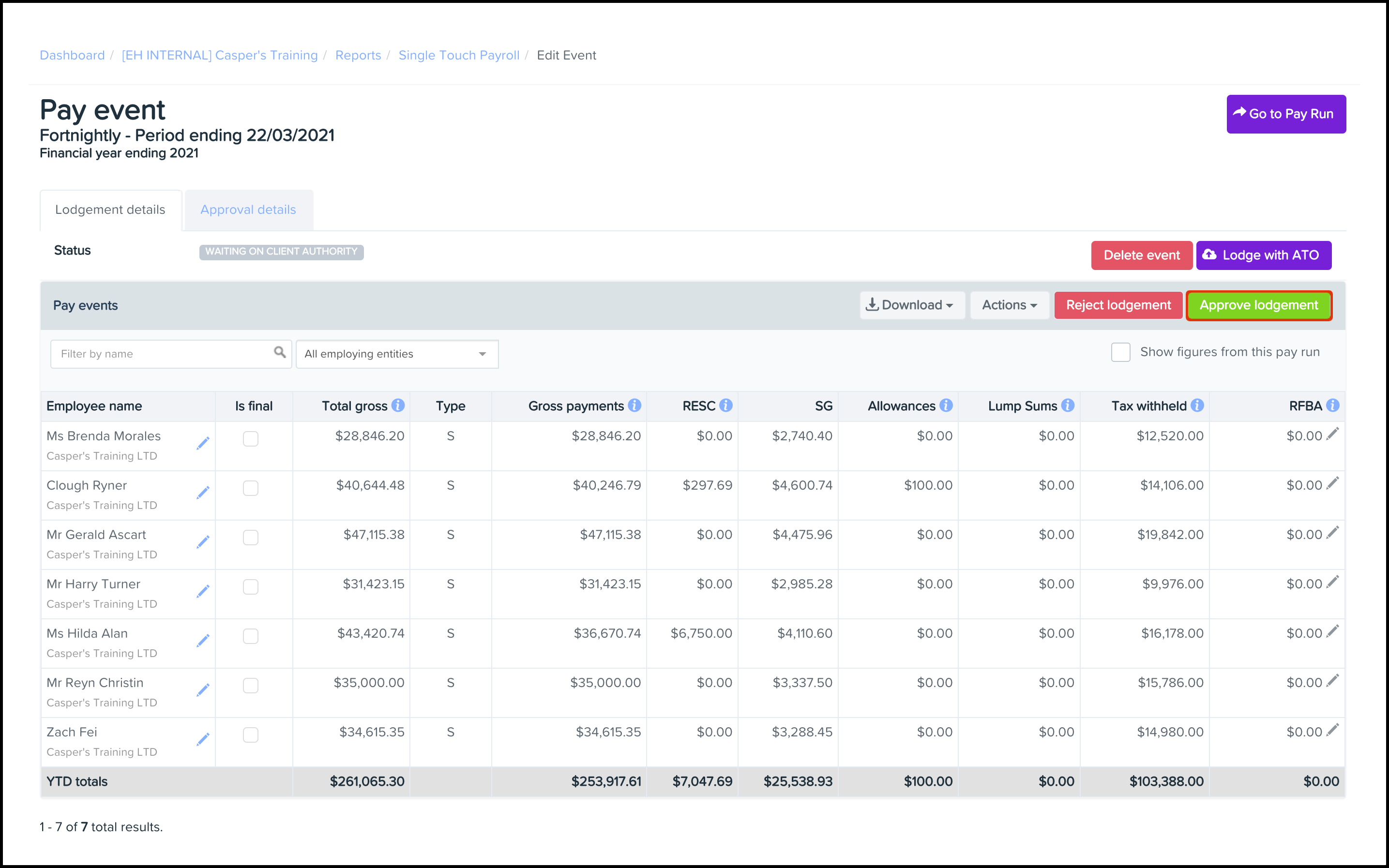 This feature allows you to submit a pay event for client approval and then either approve or decline said submission. You will need to have selected the Tax/BAS Agents ATO Lodgement option via the ATO Settings page first, before you can use this feature. You will also need to have created a pay event before you can use this feature. To read further details on how to create a pay event, refer to this guide.