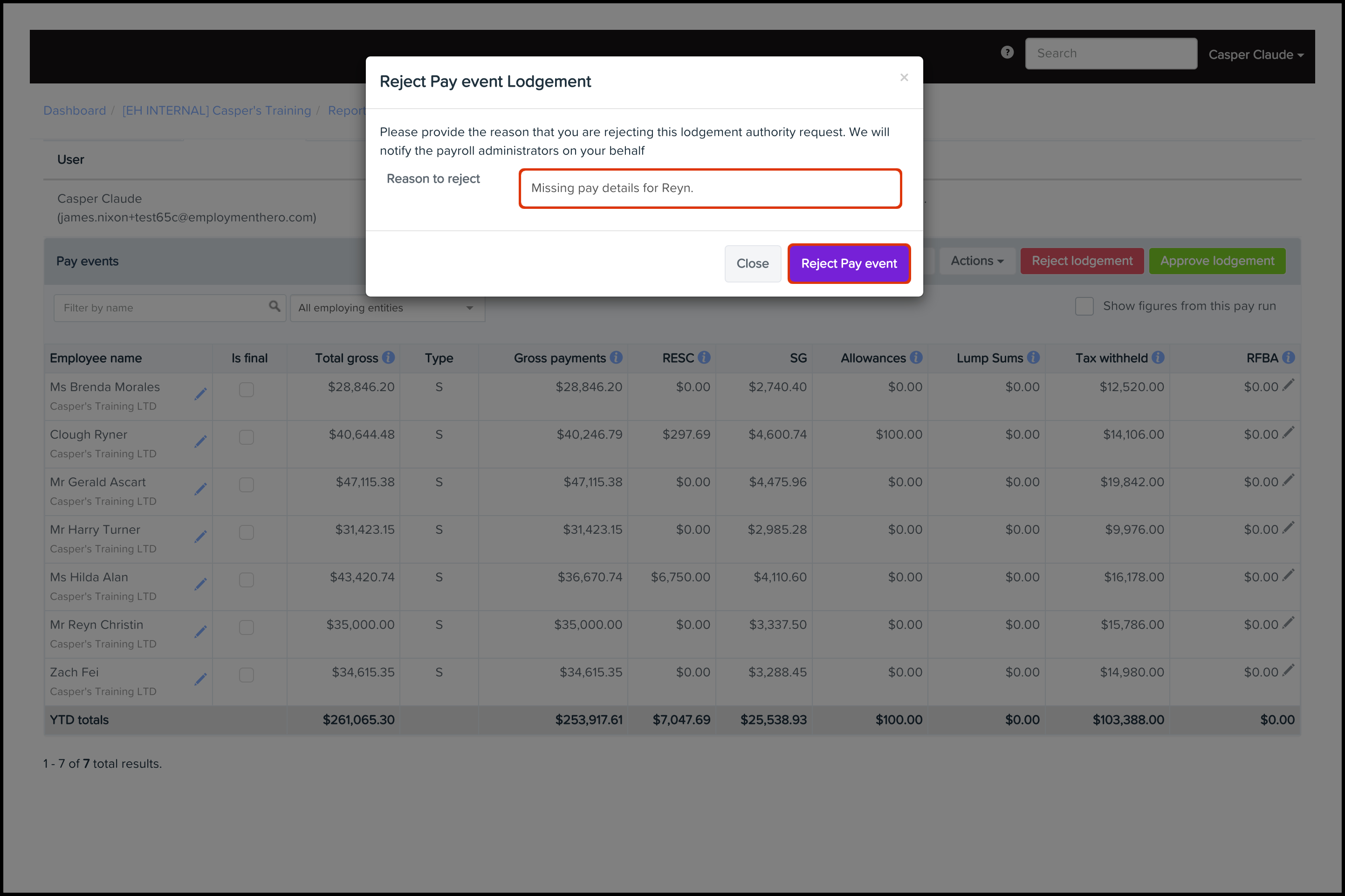 - Click the Reject Pay Event button.