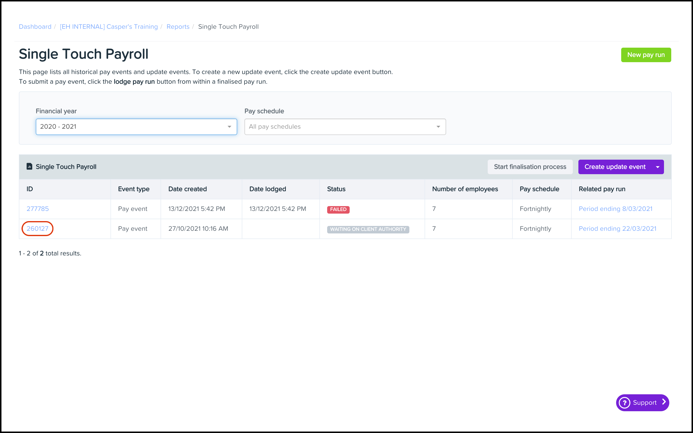 - Click the pay event that needs client authority requested.