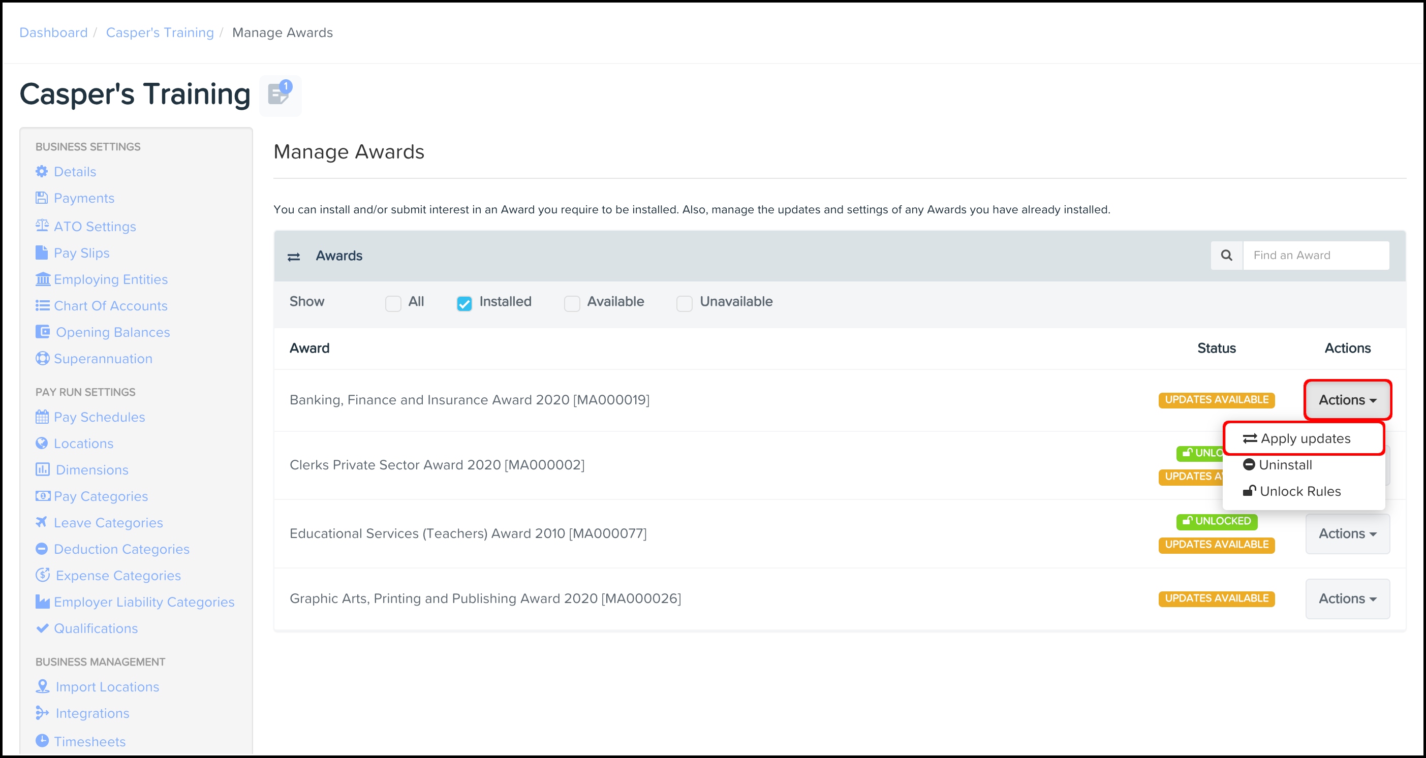 screenshot of the manage awards page, highlighting the actions dropdown and apply updates buttons for the award you need