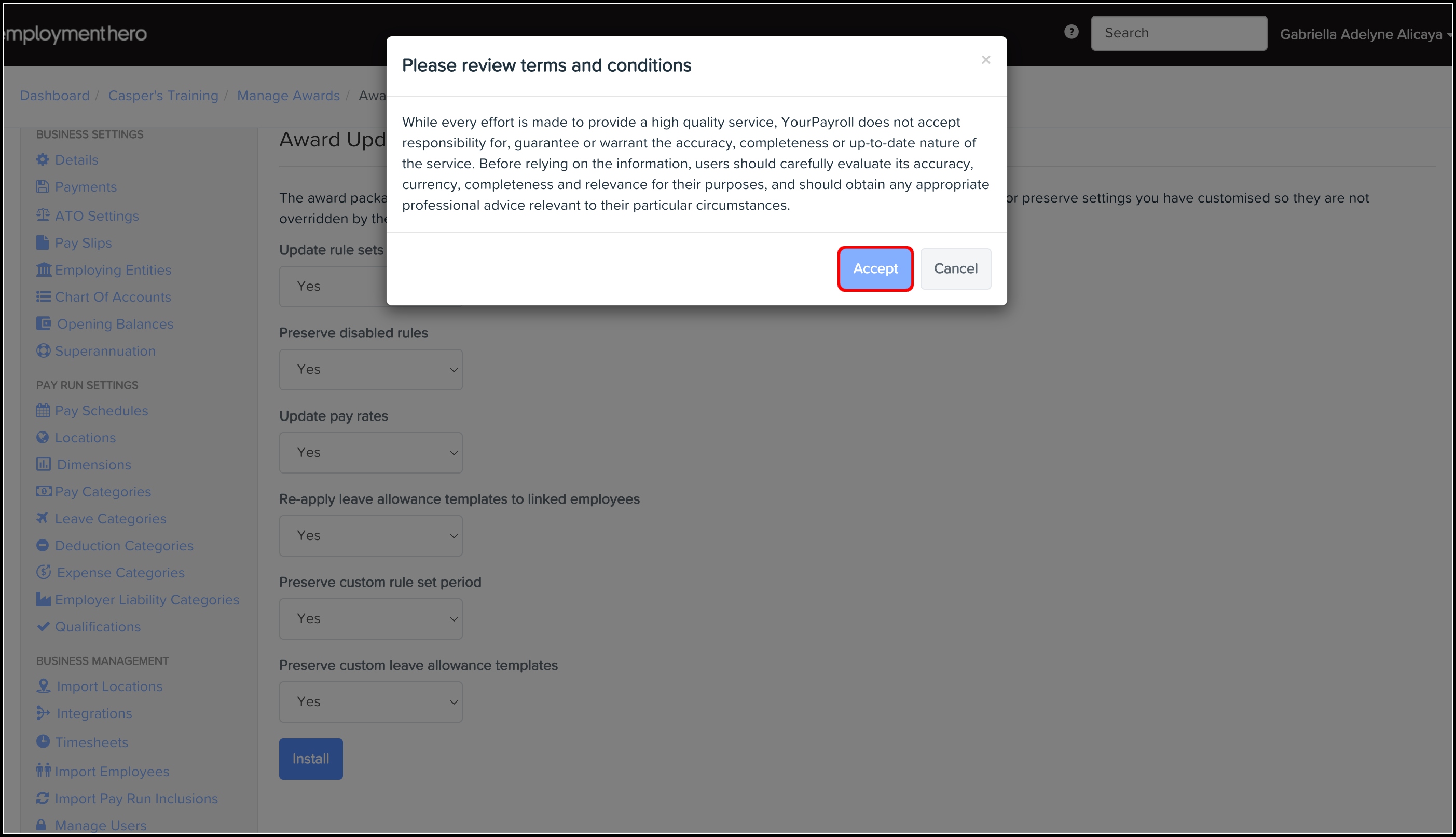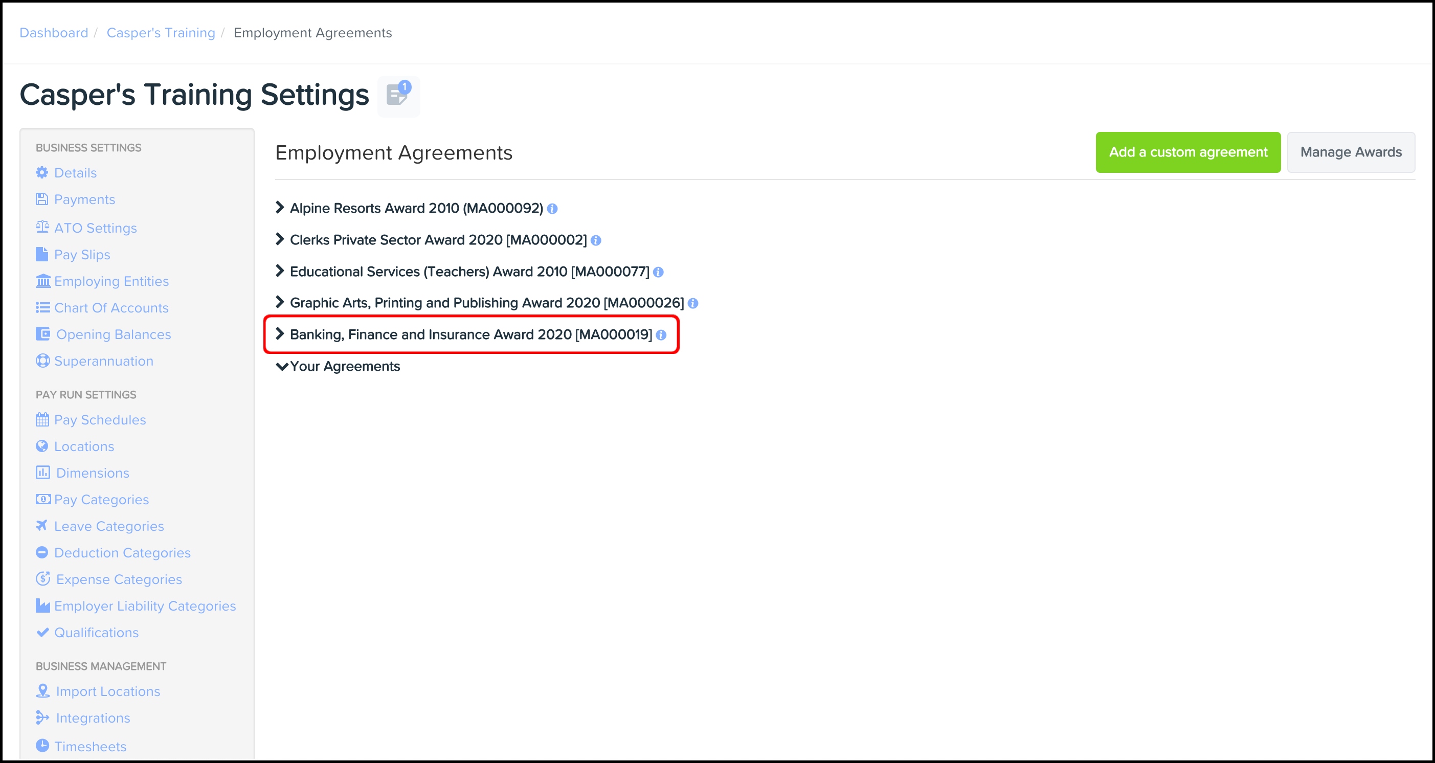After this, the payroll platform will take you to the Employment Agreements screen where you can see the updated award.