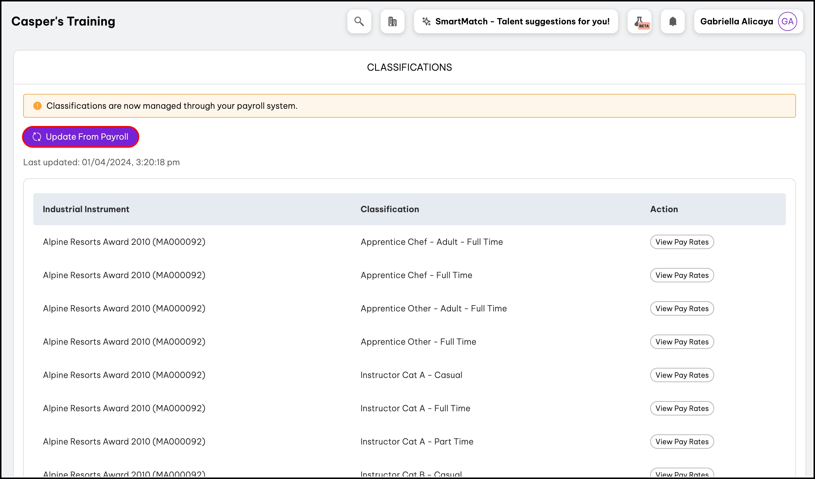 The Classifications page will now show a green   Updated button. This means the HR classic platform has successfully imported your classifications from the payroll platform. You can click the View Pay Rates button to see further details about the classification, such as pay rate, pay type, and pay category.