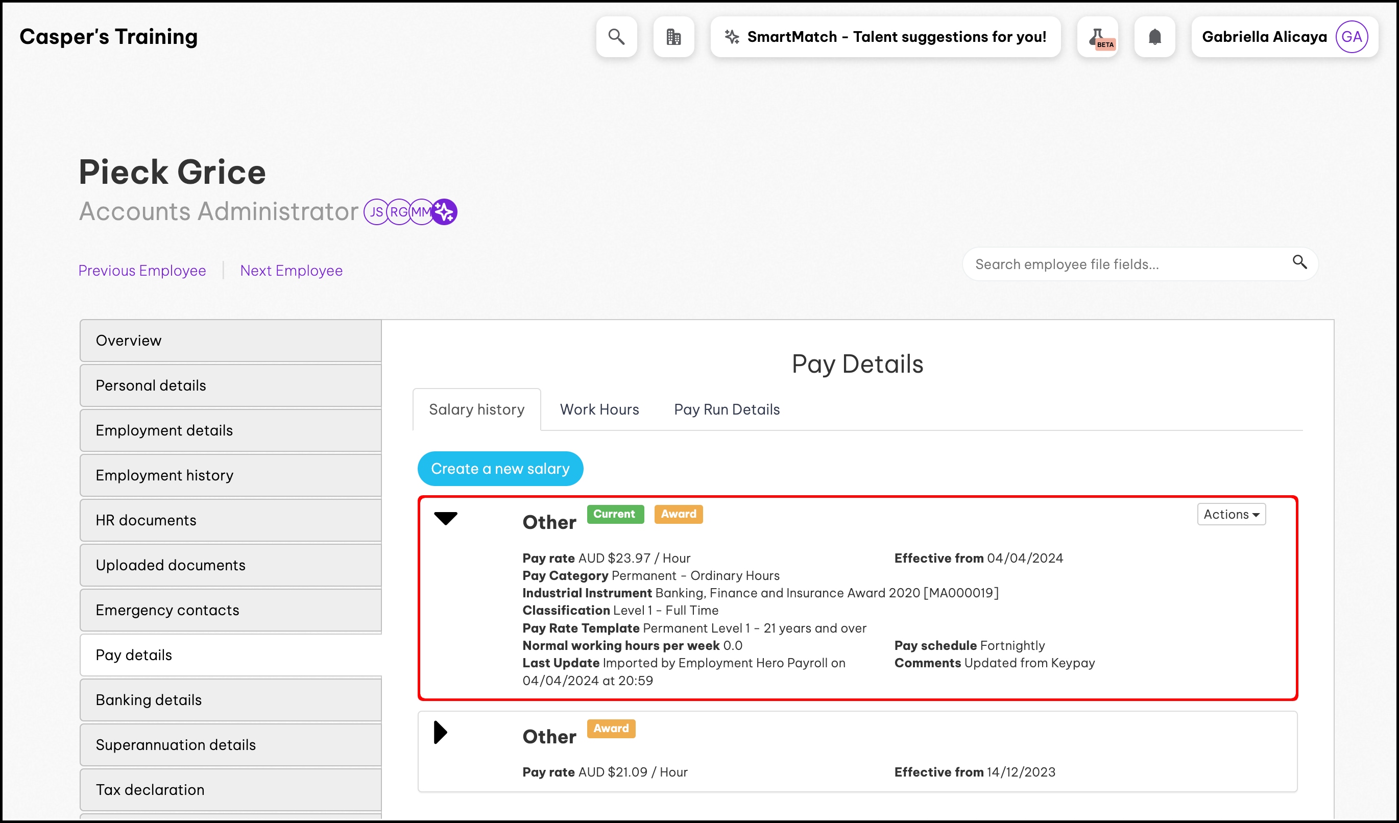 screenshot of the employee's pay details page, highlighting the new salary from the award update