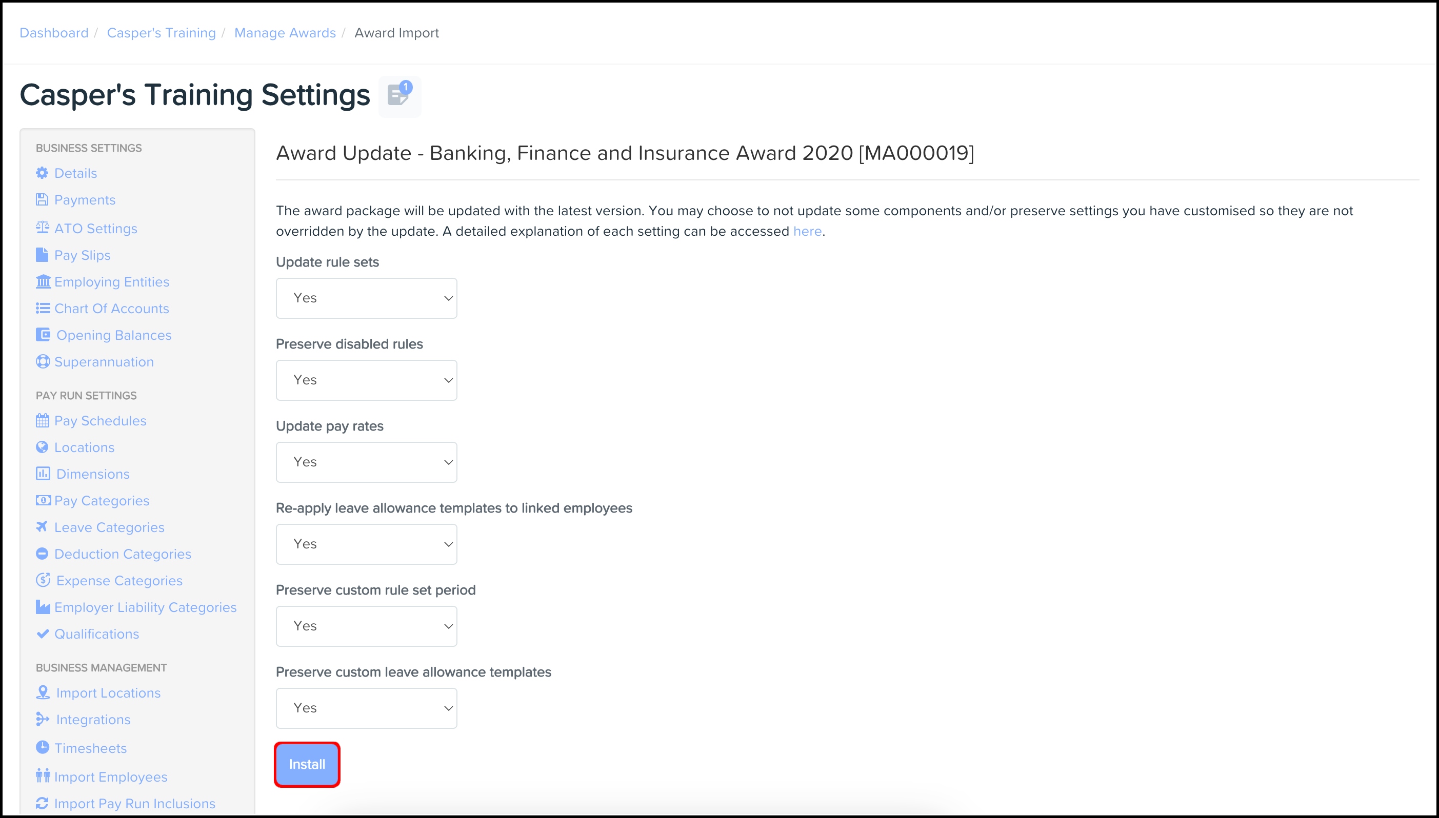 screenshot of the award update page, highlighting the install button