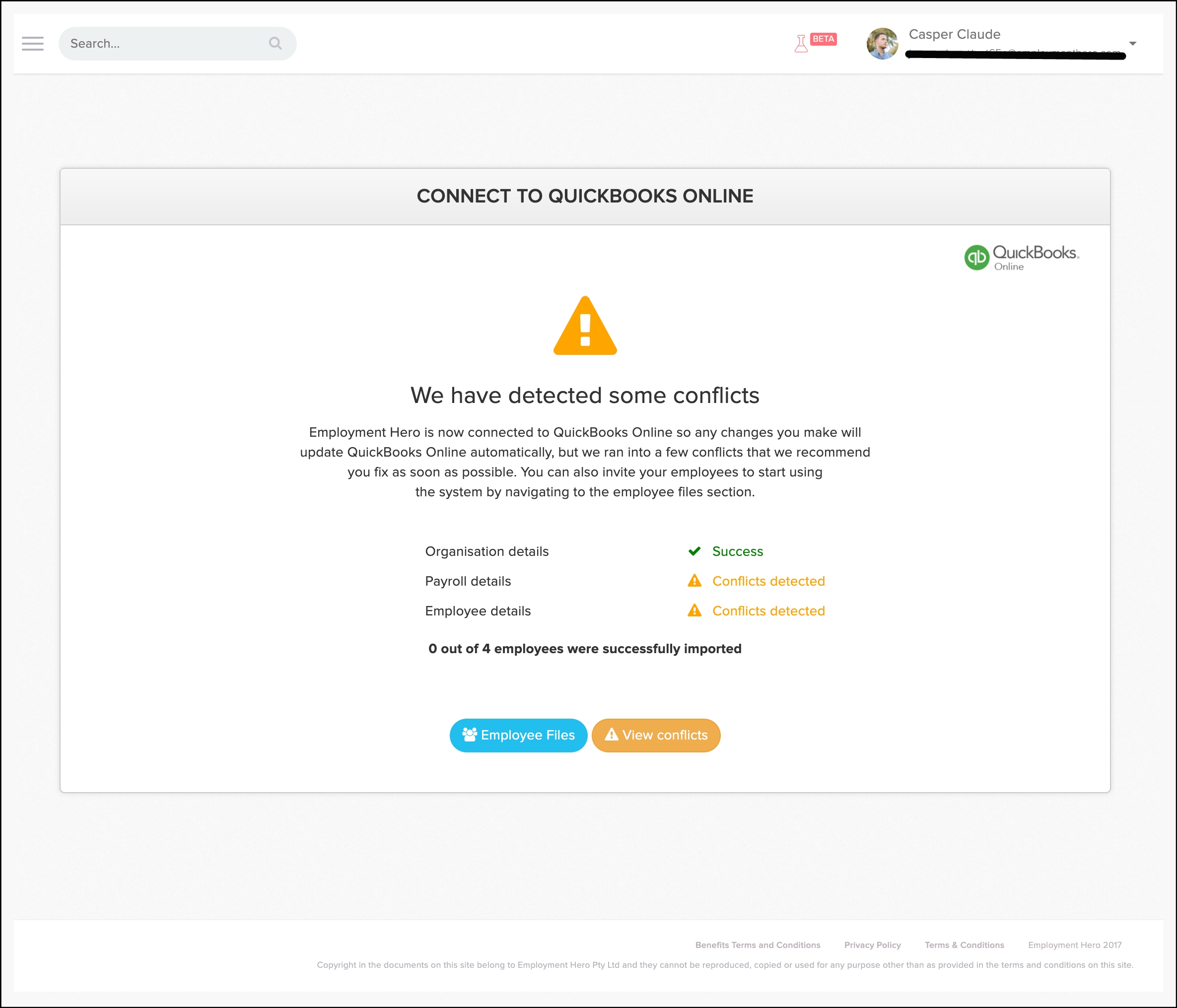 Once Employment Hero has imported the data from your QuickBooks Online platform, you will see a status screen. From this page, you can see if there are any integration errors. If there are integration errors, you can click the View Conflicts button to see detailed information on the import conflicts.