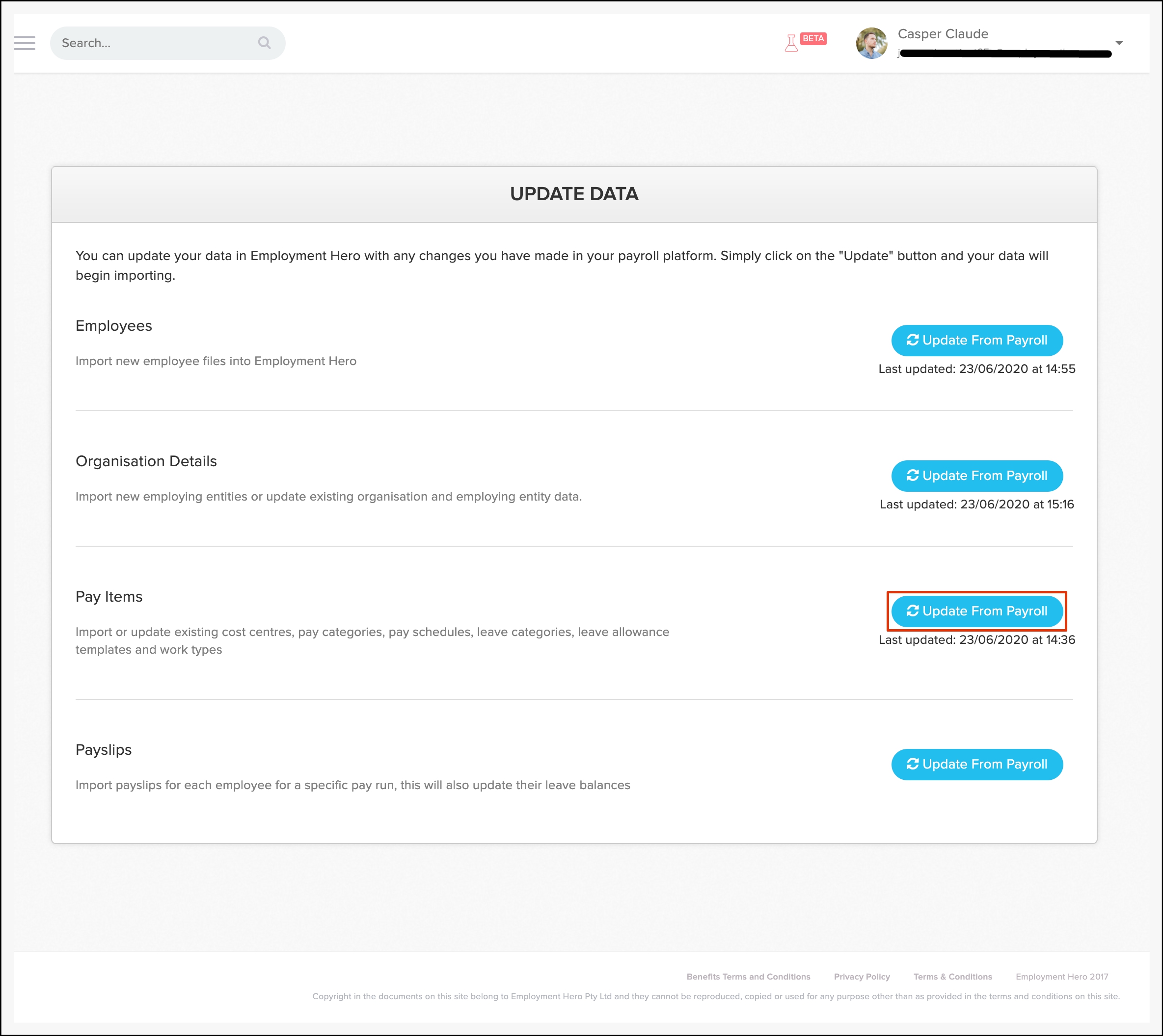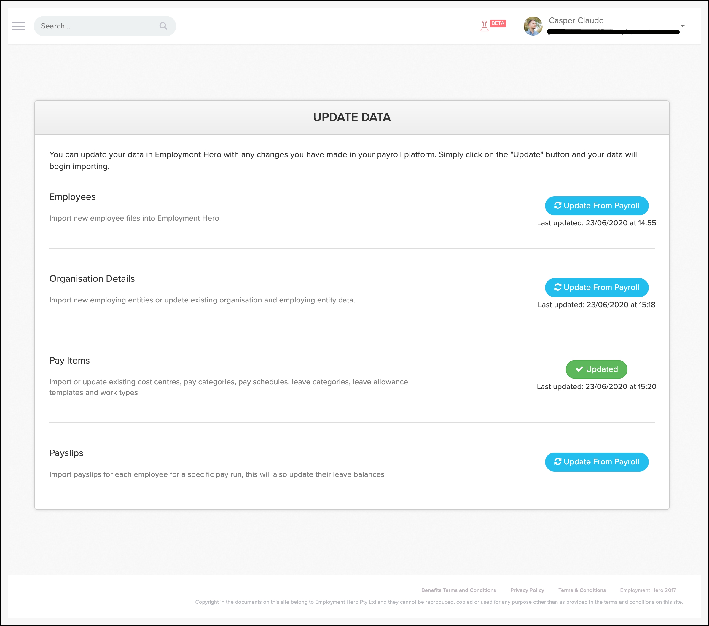 The Pay Items section will now show a green Updated button and means Employment Hero has successfully imported your pay items from your QuickBooks Online platform.