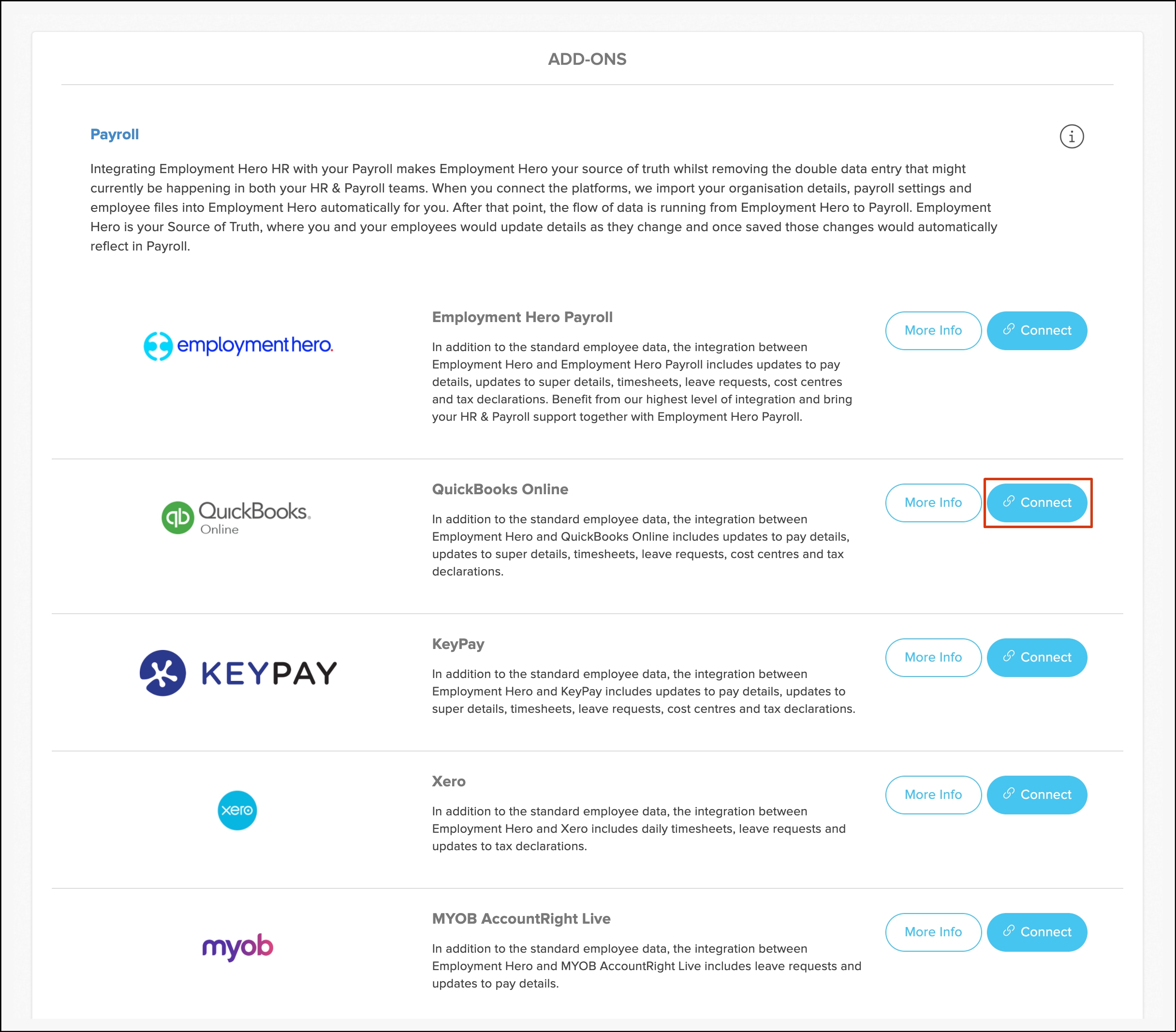 Integrating Employment Hero with your QuickBooks Online platform makes Employment Hero your source of truth for information such as company settings, payroll settings, and employee file data. When you connect the two platforms, Employment Hero will import your organisation details, payroll settings, and employee files from your QuickBooks Online platform automatically.