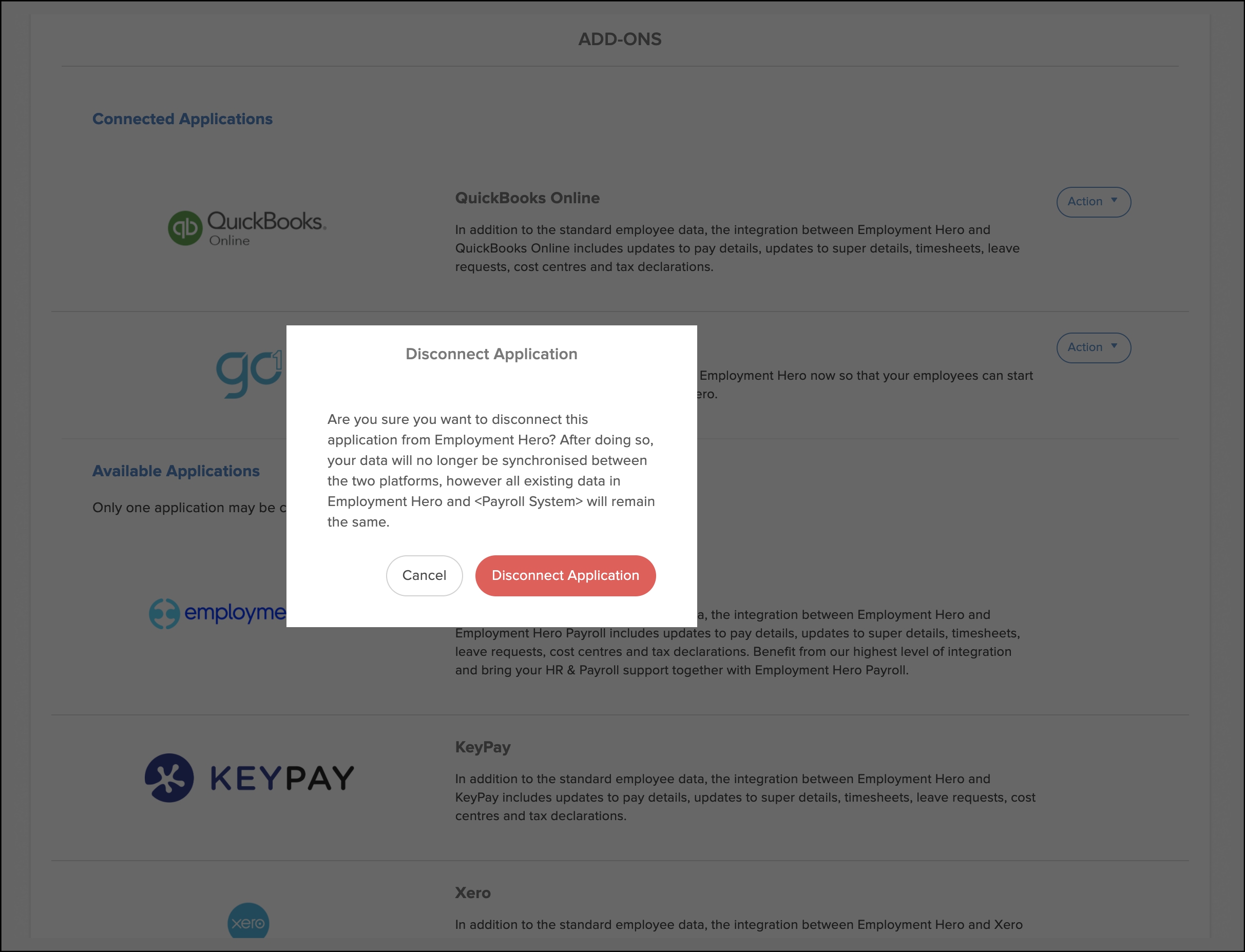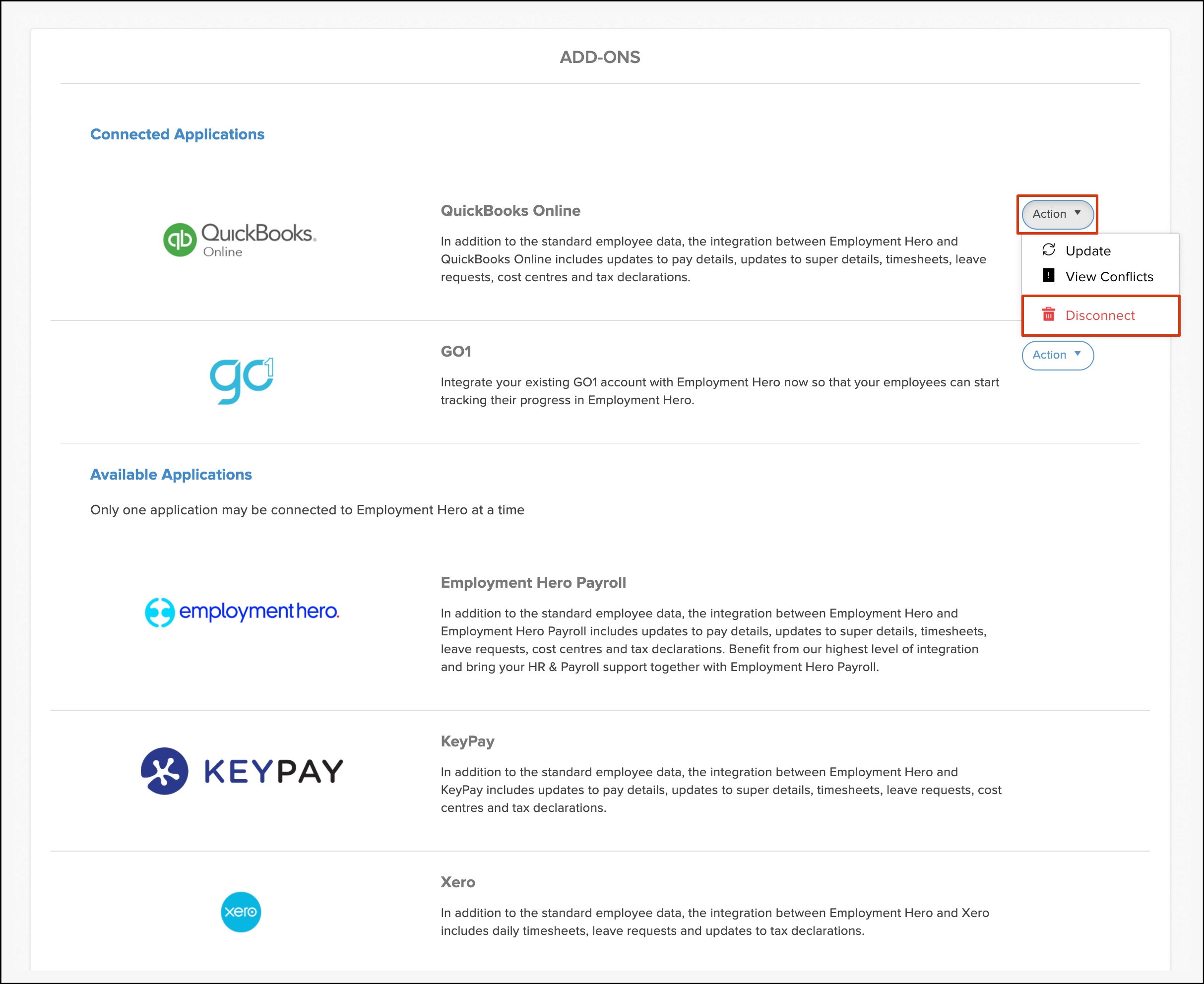 After disconnecting from QuickBooks Online, Employment Hero will no longer synchronise your employee data between the two platforms. However, all existing employee data will remain within the HR platform.