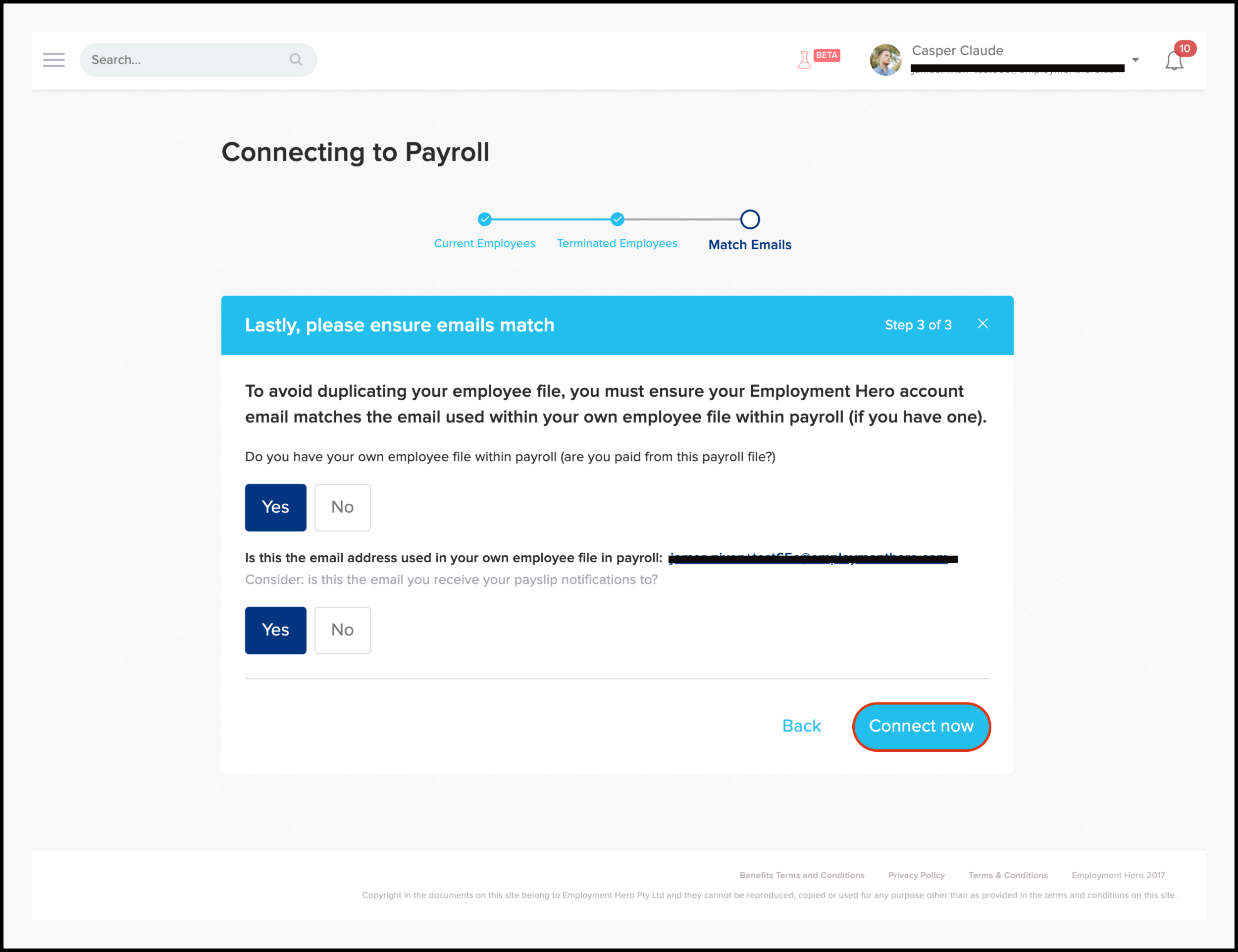 Once you click the Connect button, Employment Hero will redirect you to your QuickBooks Online platform. If you need to change the email listed on the page, select the No option for the Is this Email Address Used in Your Own Employee File in Payroll question, followed by the Update button.