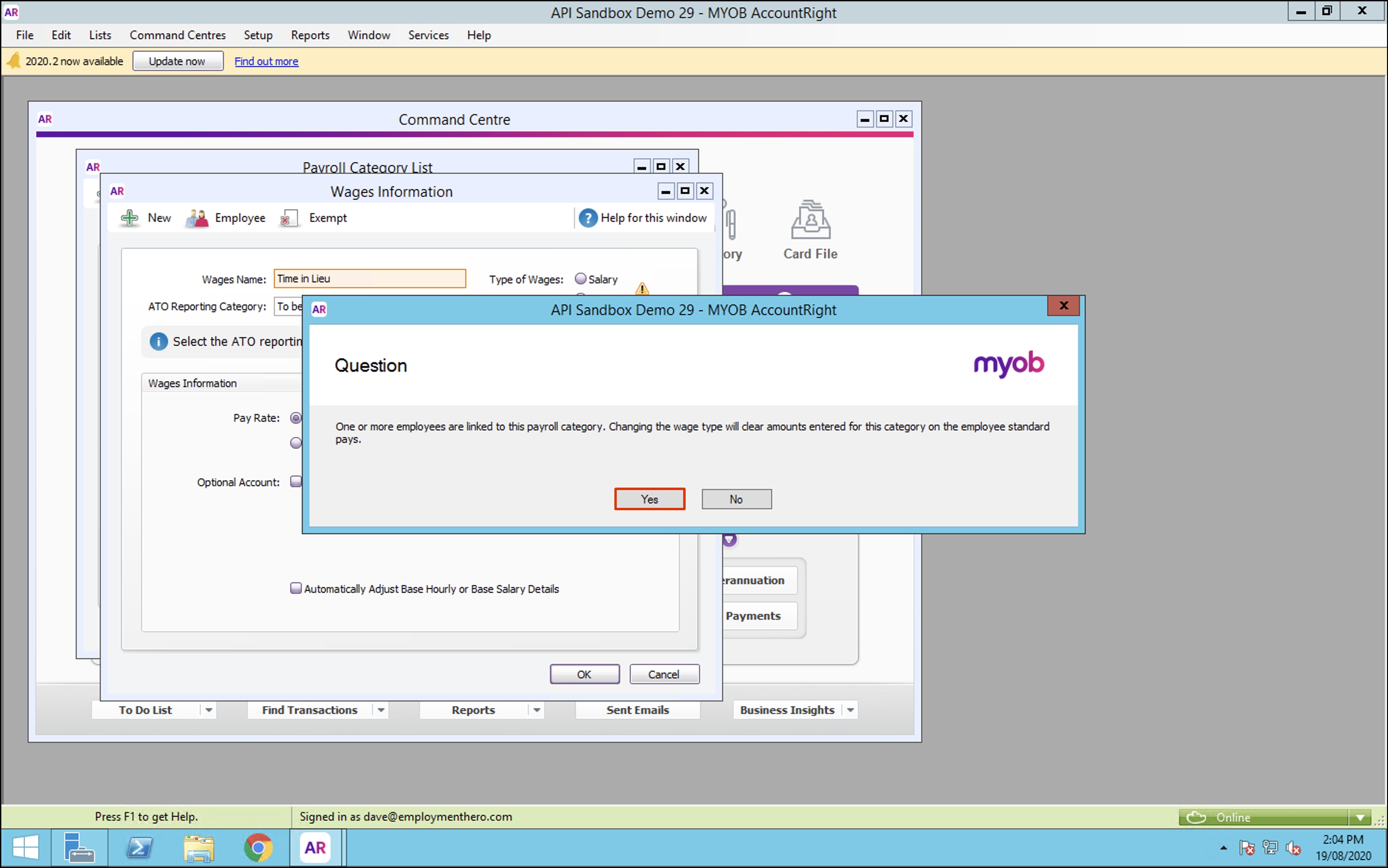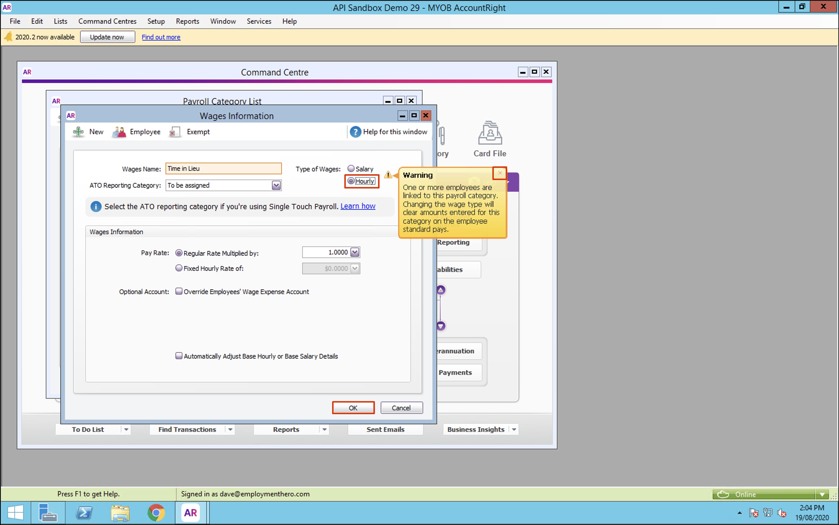 This error occurs when a pay category in MYOB Account Right has the salary not-hourly option selected. When Employment Hero encounters this issue, it will not synchronise leave requests for the affected employees over to your MYOB Account Right platform.